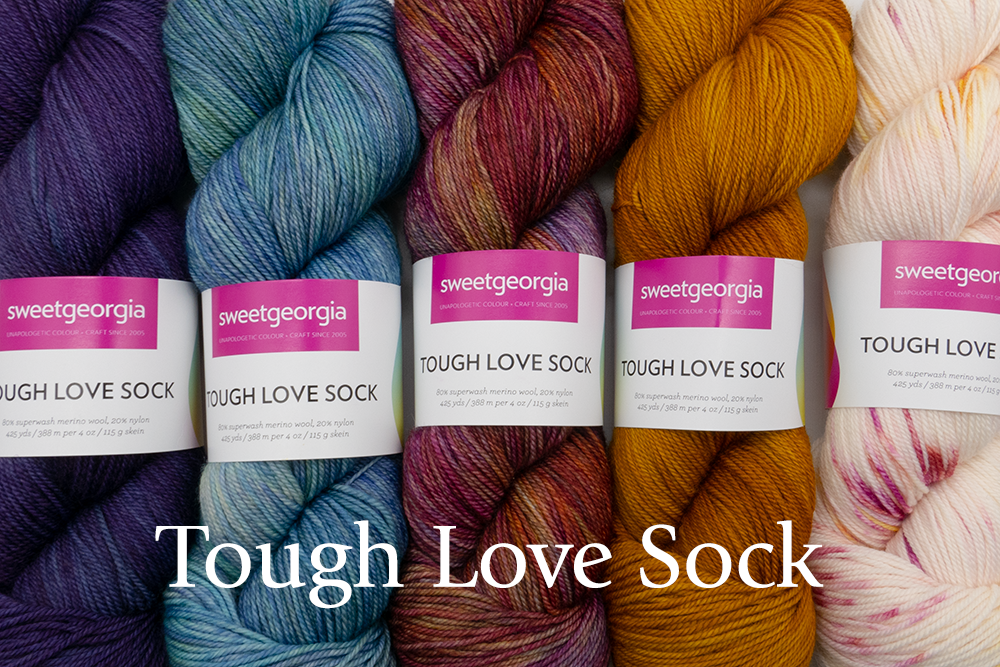 Tough Love Sock is the best-selling sock yarn from Sweet Georgia Yarns. It's spun from 80% superwash, superfine merino and 20% nylon. This 3-ply yarn is so versatile - knit it firmly for hardwearing socks or loosely for drapey shawls and wraps. It's the perfect blend of warmth and strength to stand up to your affection and abuse.