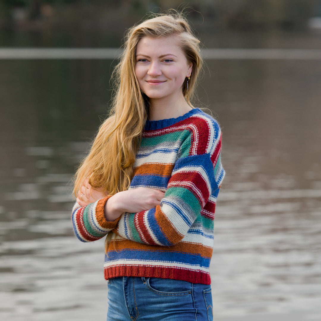 This stylish drop shoulder sweater, designed in all three &Make yarns, is the ultimate striped sweater. The contemporary striped sections vary in width and rows of garter stitch mark the color changes, making a clever modern twist on old classic striped designs. Like with all &Make designs, the knitter is walked through each step of knitting with illustrations, written instructions and video tutorials, making this an inclusive pattern to work from.