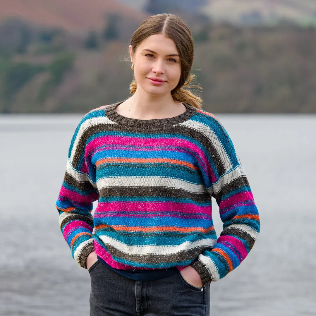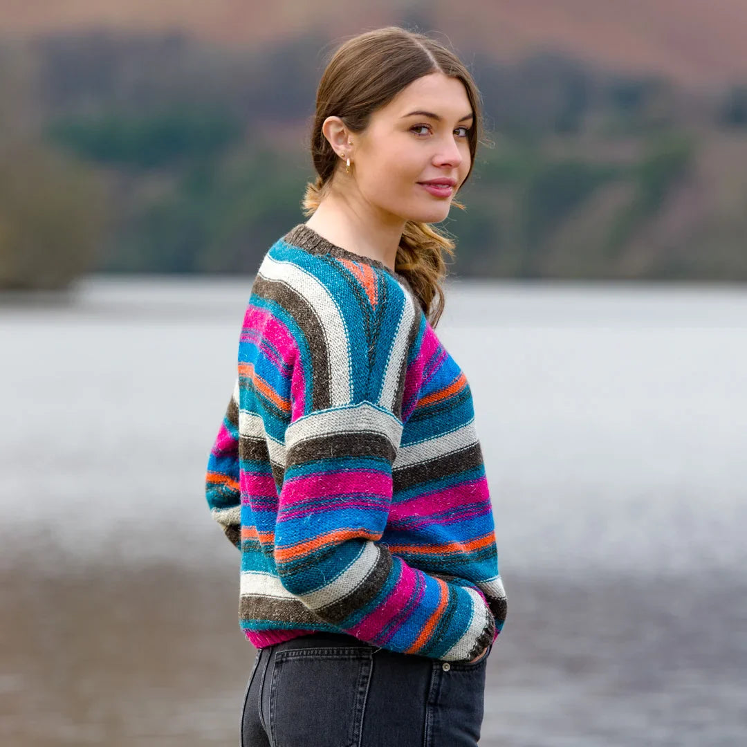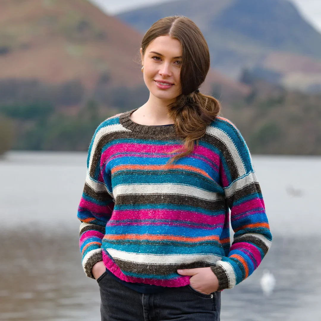The All Stripes Sweater is worked in the round and from the bottom up, until the underarm divide. The front and back are then split and knitted flat separately. Stitches are cast off to shape the neck and shoulders. Shoulder seams are joined using the Mattress Stitch technique. Sleeve stitches are picked up in the round and worked top down. Neckband stitches are picked up last, in the round and worked in 2x2 ribbing.