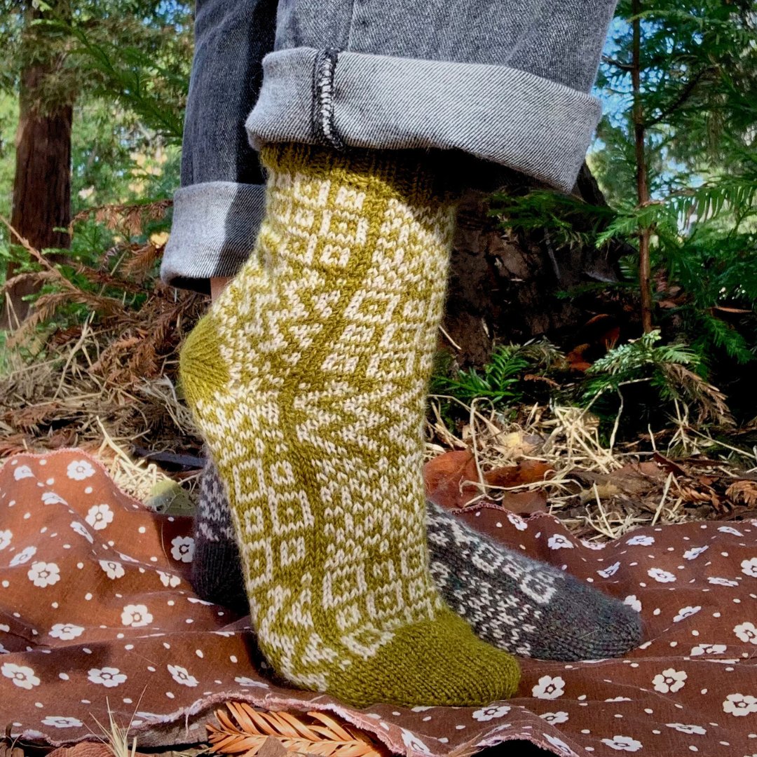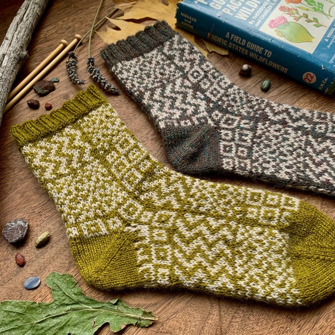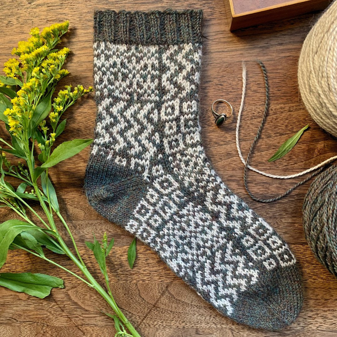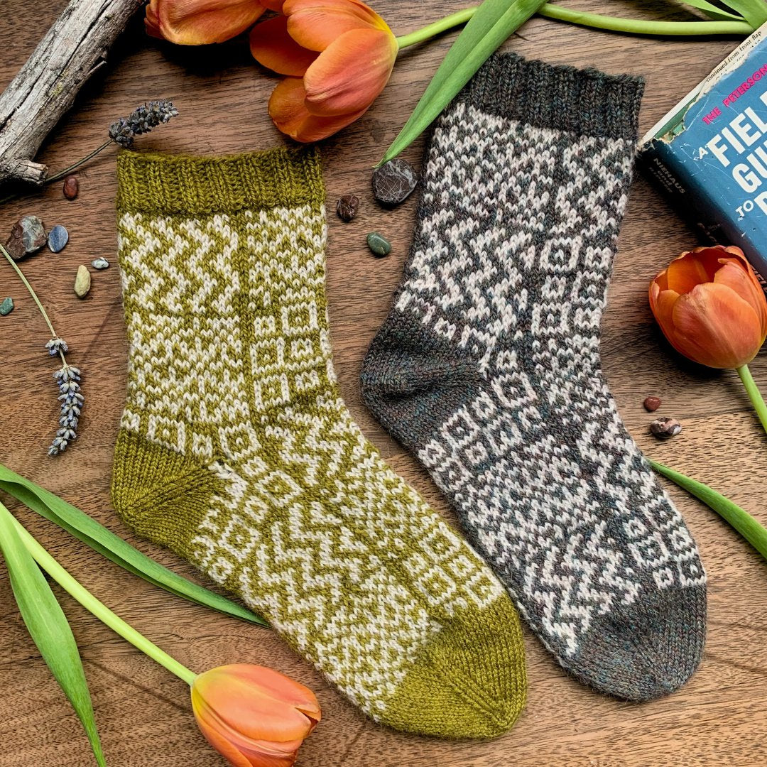 Knitted in two shades of Amble, a fingering-weight yarn made from a blend of eco-friendly washable wool, alpaca and recycled nylon, these socks epitomize softness and sustainability. Designed especially for sock knitting, Amble not only ensures comfort but also produces durable fabrics that stand the test of time.