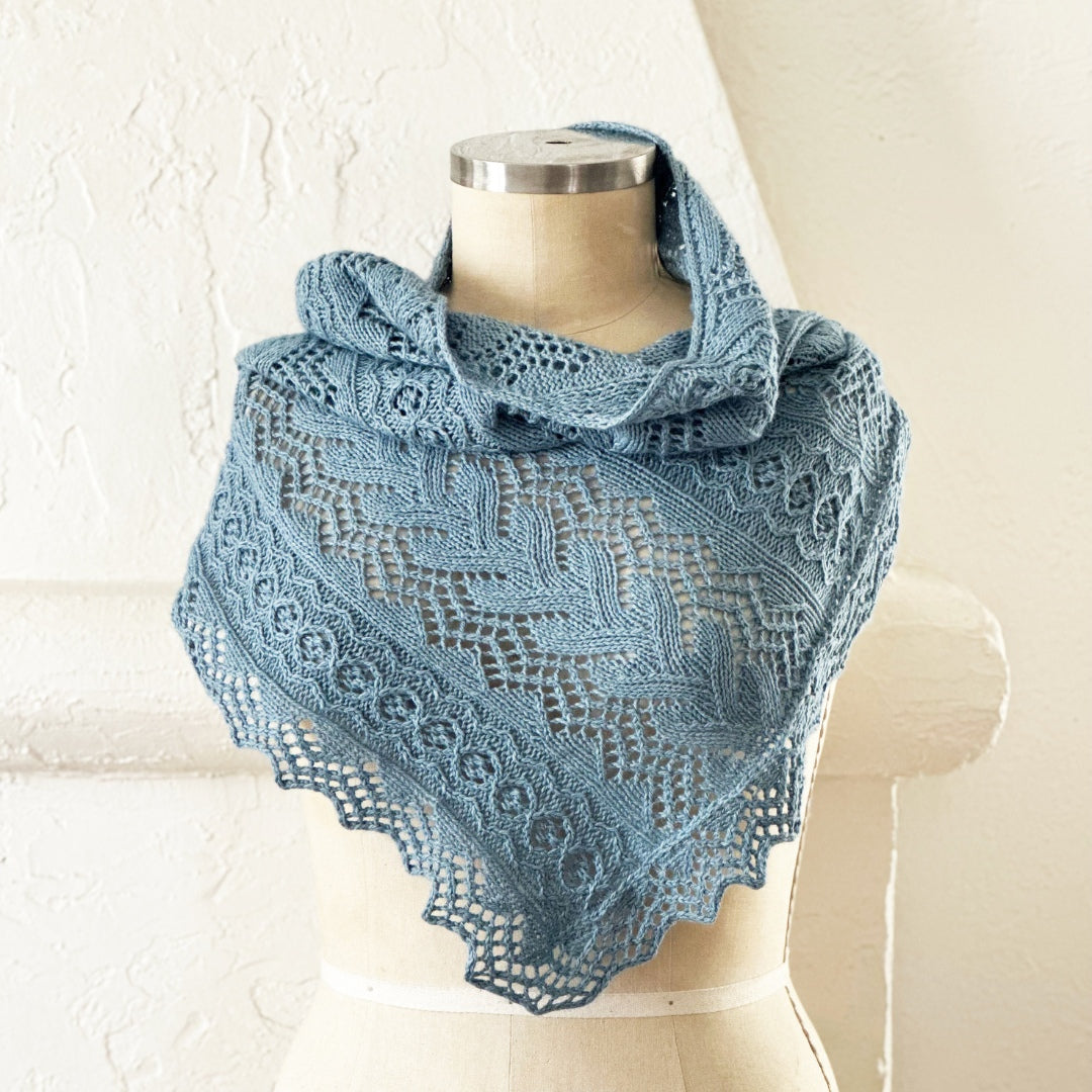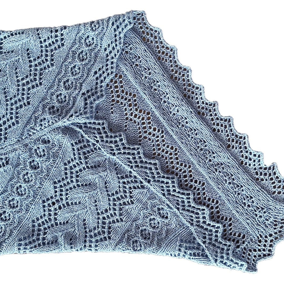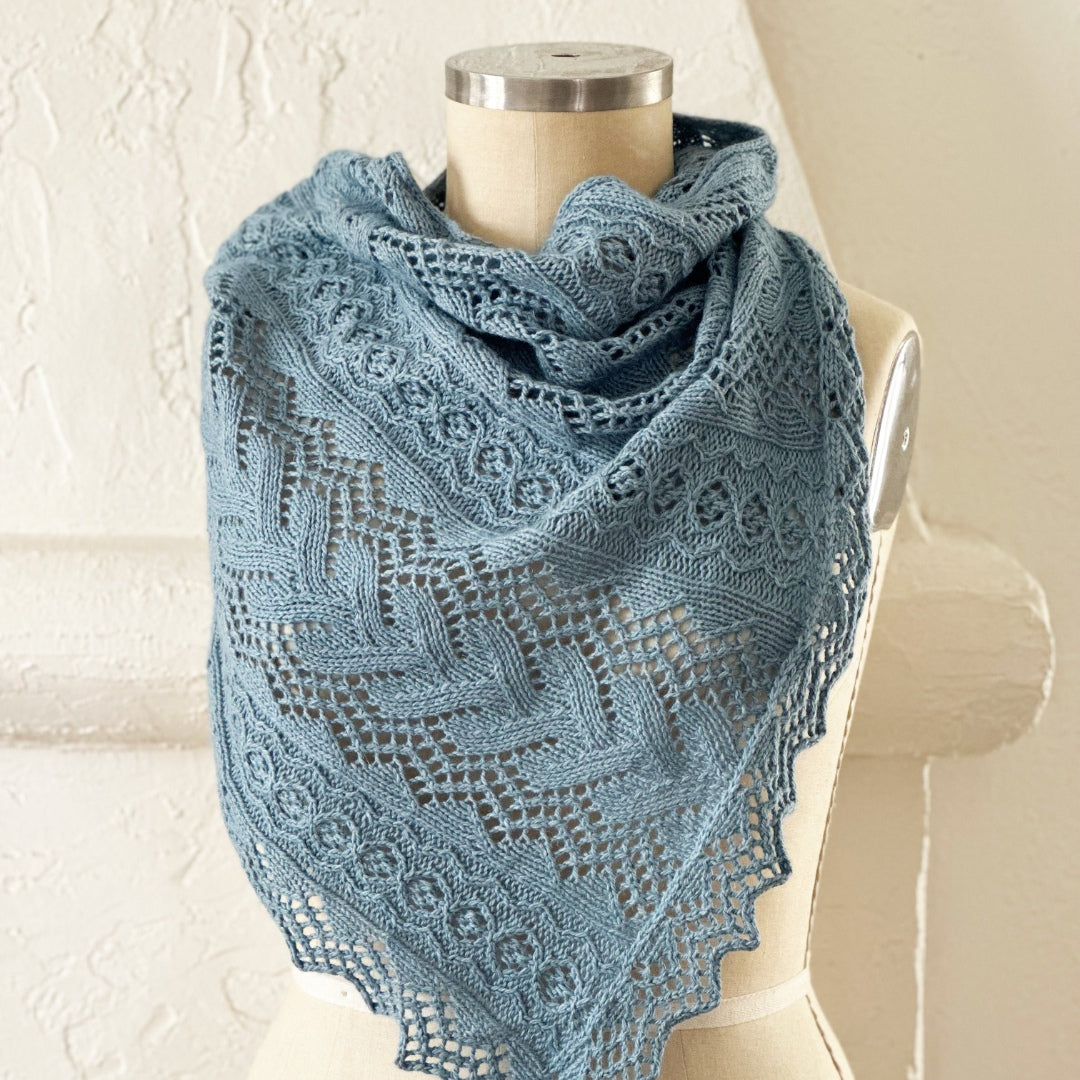 This gorgeous lace cowl is a fast, easy-wear knit that would be a fabulous gift, if you don't simply keep it for yourself! Inspired by patterns in sand, kelp and sea urchins, this cowl combines lots of beautiful stitchwork including lace patterns, cables and a knitted cast-off. The pattern is worked in one piece and then the short diagonals are seamed together with a mattress stitch after the cowl has been blocked.