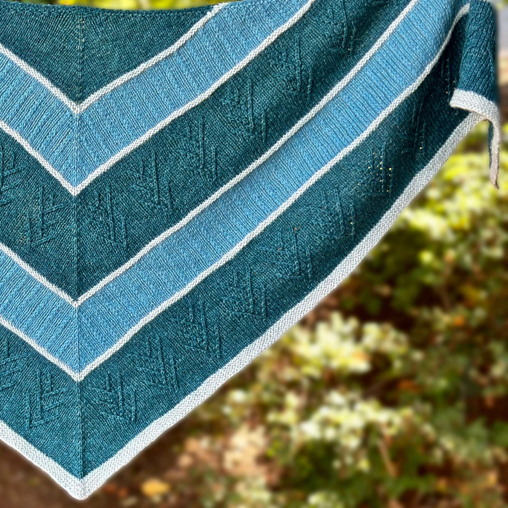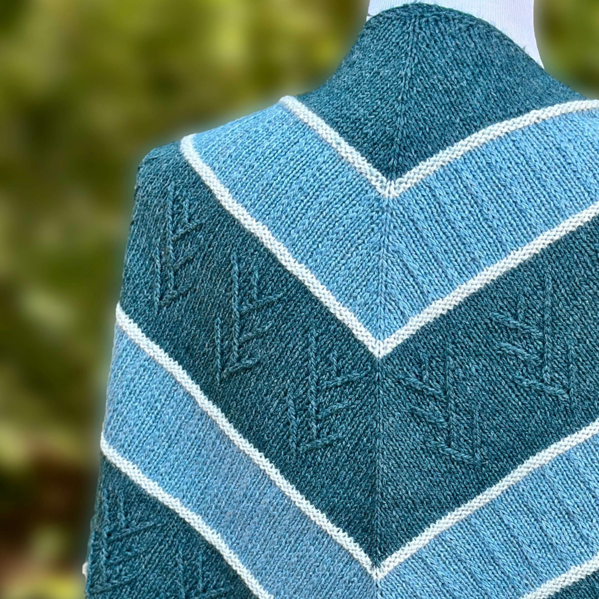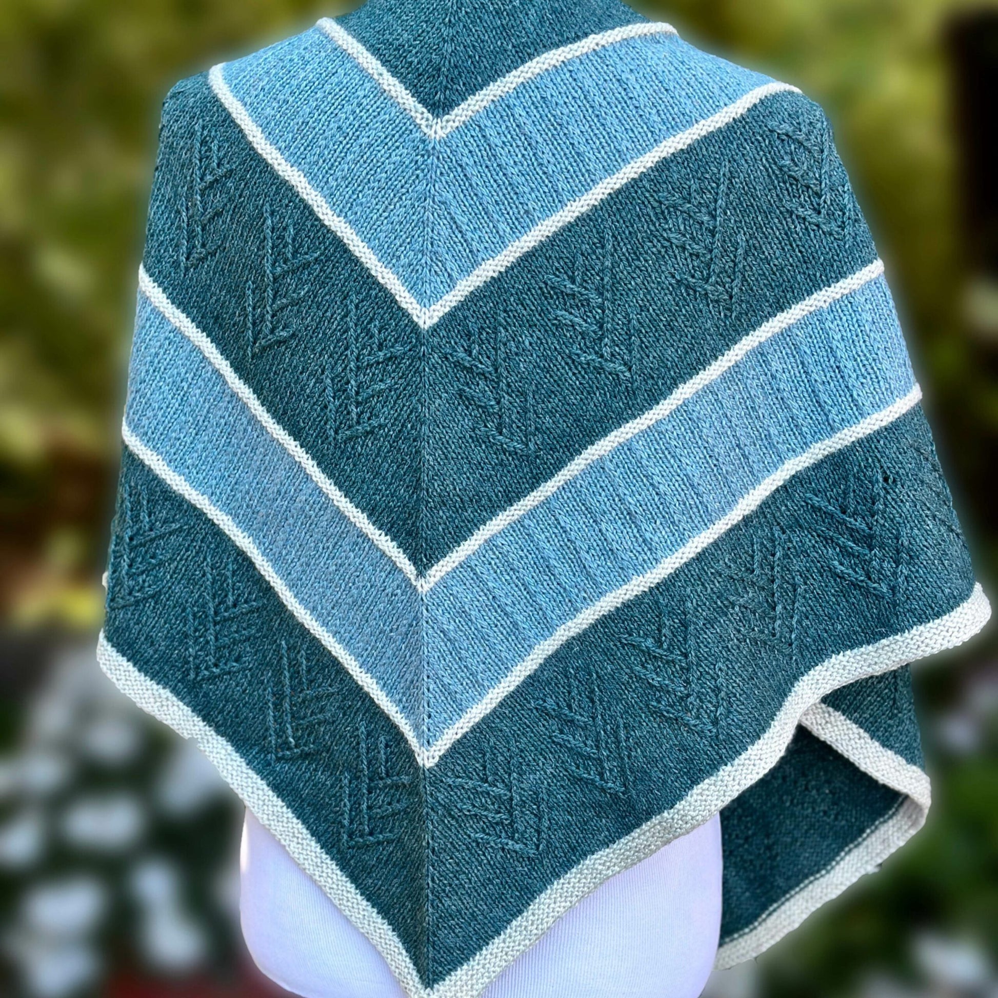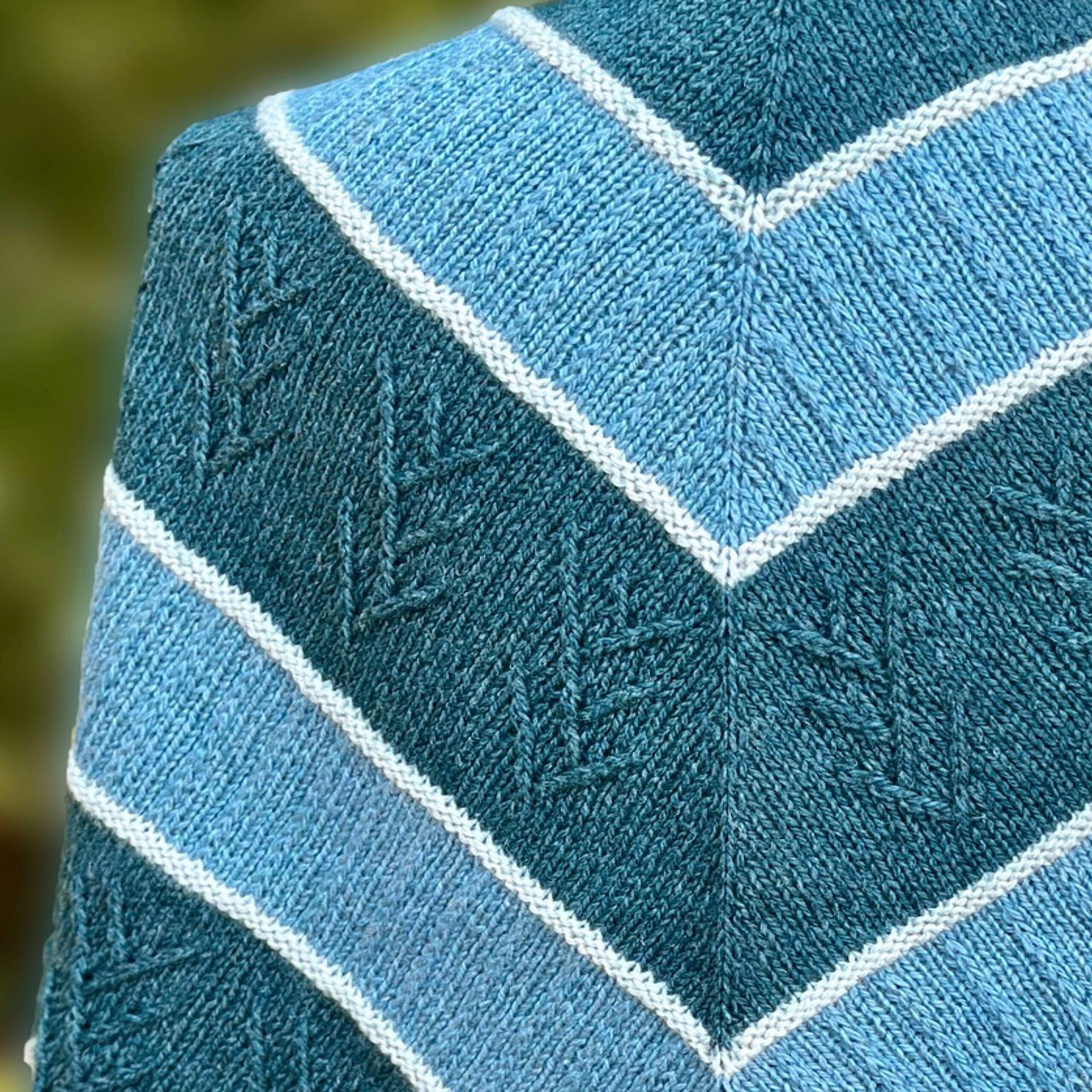 Photographs show the shawl in the ‘Alternating Color Scheme’, in shades Aegean (MC1), Chambray (MC2) and Blanca (CC).
