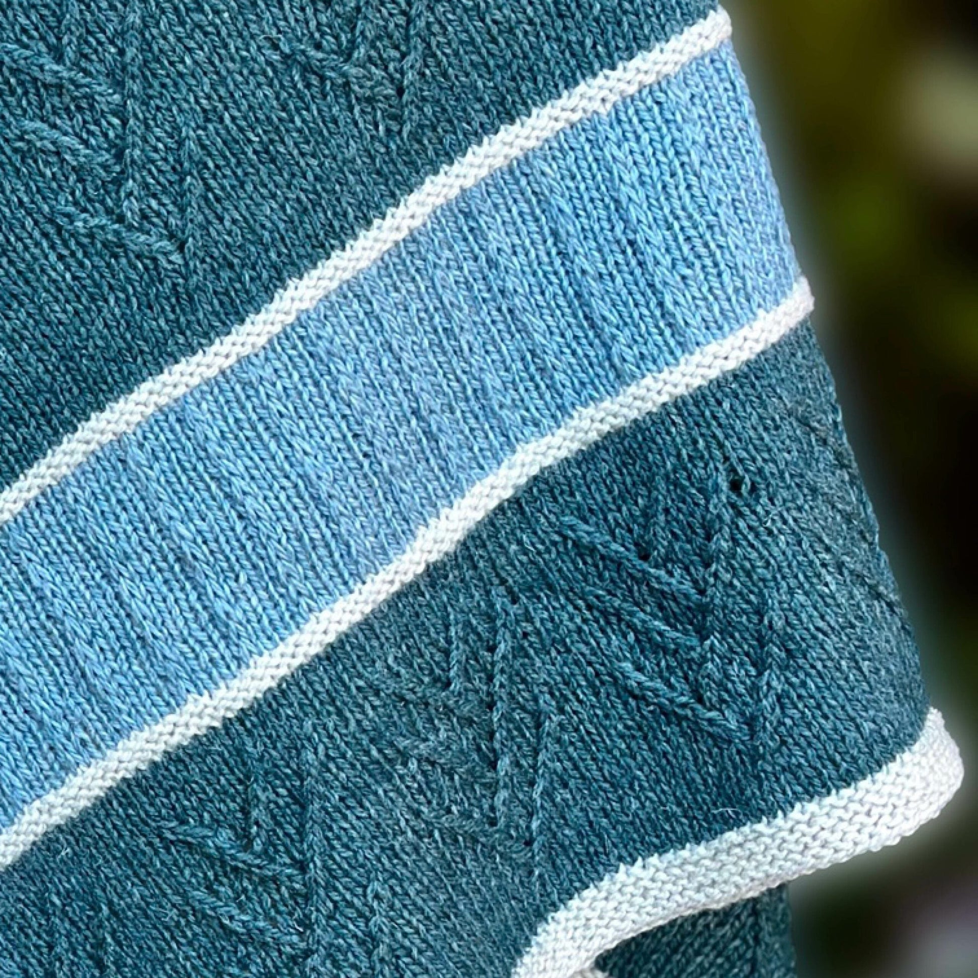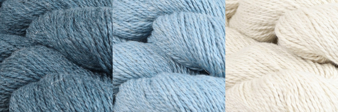 The Fibre Co. Luma (50% Merino wool, 25% organic cotton, 15% linen, 10% silk, 125 m (137 yd) per 50 g hank) in shades Aegean (MC1) – 4 hanks, Chambray (MC2) – 2 hanks. and Blanca (CC) – 2 hanks.