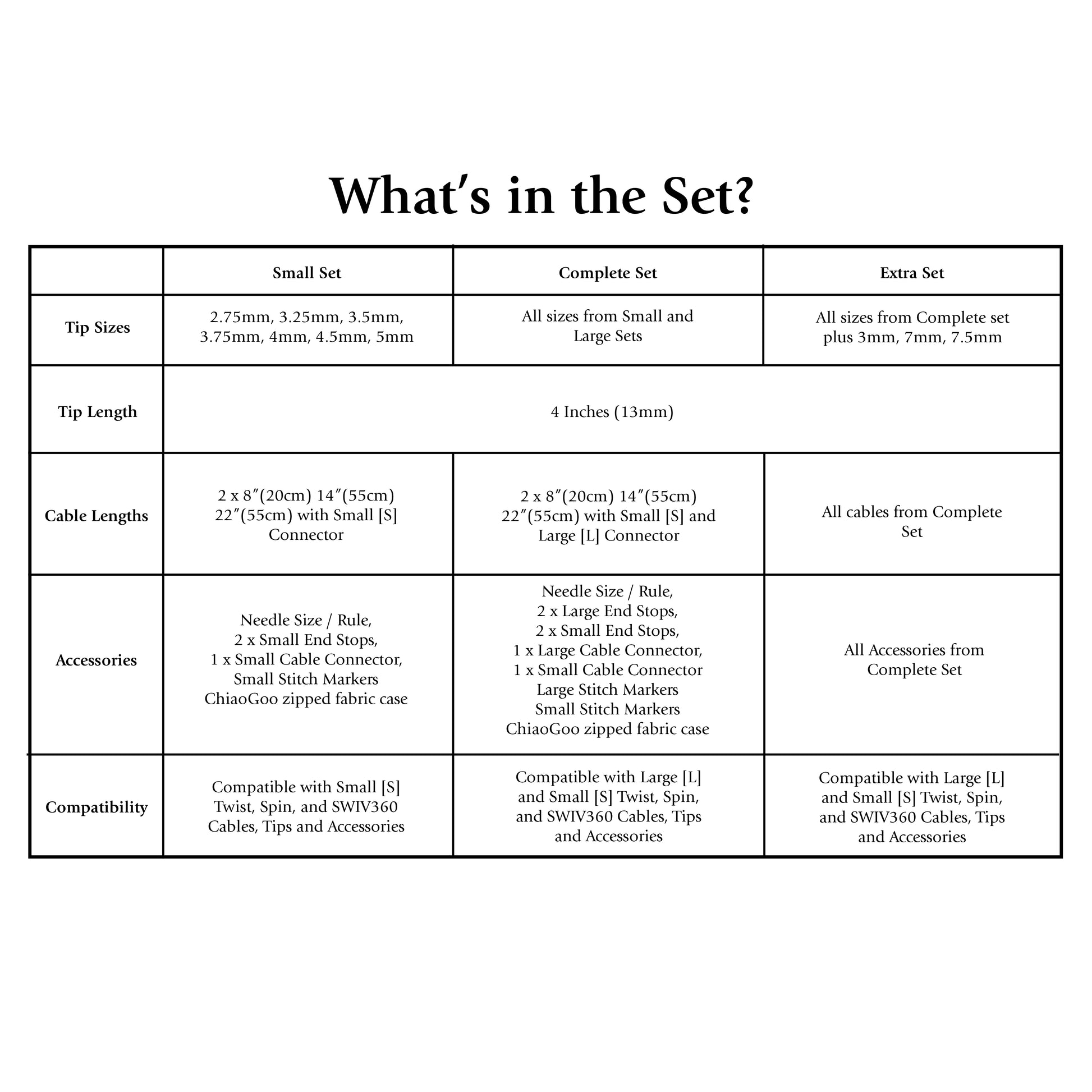 | Accessories | Needle Size / Rule, 2 x End Stops, 1 x Cable Connector, Stitch Markers (Pink and Yellow) | Needle Size / Rule, 2 x Small End Stops, 2 x Large End Stops, 2 x Small Cable Connectors, 2 x Large Cable Connectors, Stitch Markers (Pink, Yellow, Green and Blue) | |