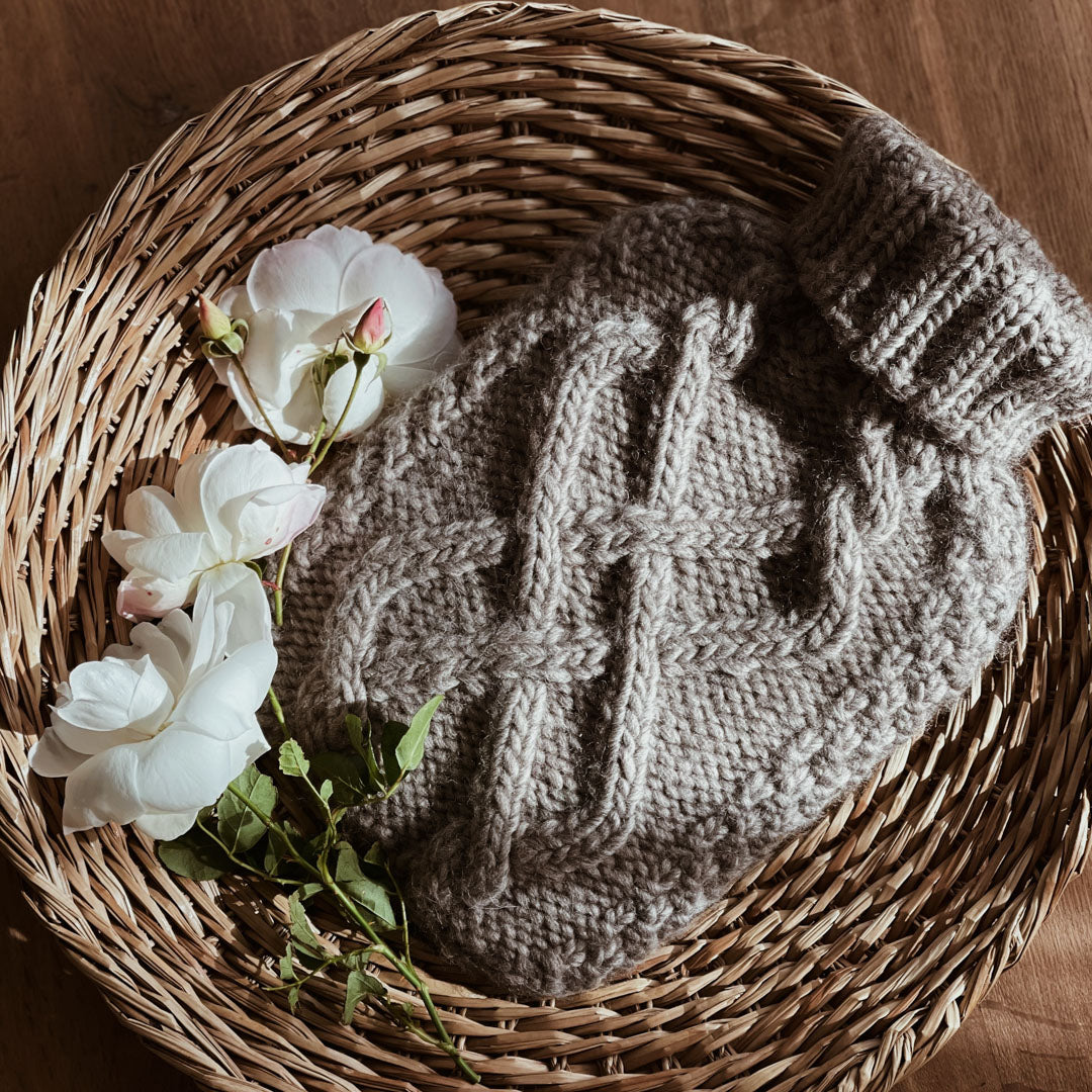 The Chunky Comfort Hot Water Hug is worked from the bottom up in one piece. The bottom is worked flat and stitches are picked up and knit from the base before joining in the round. The body is worked using the Magic Loop technique knit with two different cable patterns and Moss Stitch. The neck is worked in 2x2 ribbing and finished with a Tubular Bind-Off.