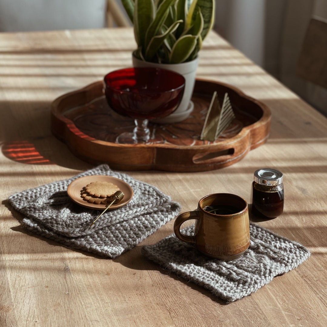 Delight in the fabulous texture of the Chunky Comfort Trivets! Protect your table and brighten it all at once with these three designs that showcase gorgeous cables or wonderfully cozy moss stitch.