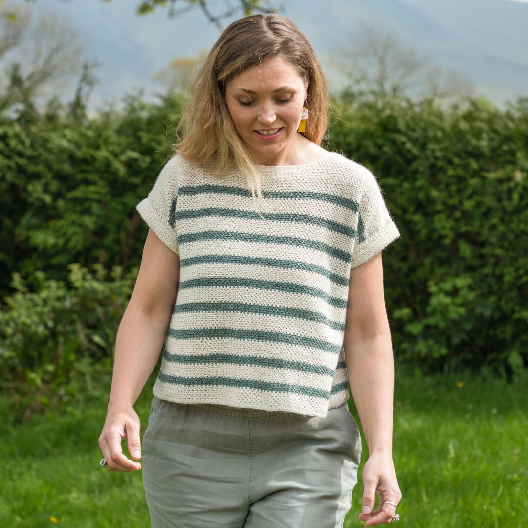 The Cloudspotter Tee pattern designed by Lindsey Newns is a boxy, relaxed-fit top. It features simple stripes, cuffed sleeves and is worked in moss stitch. The basic panel construction and shaping-free design make it ideal for beginners.