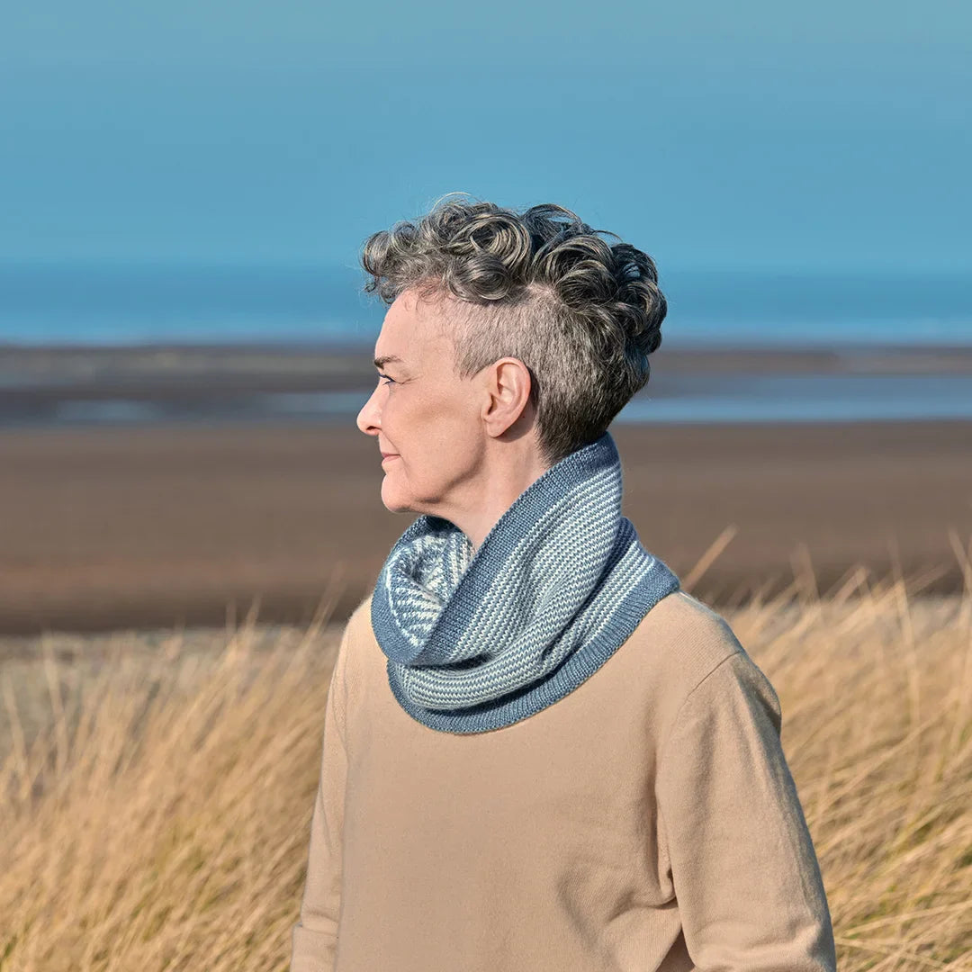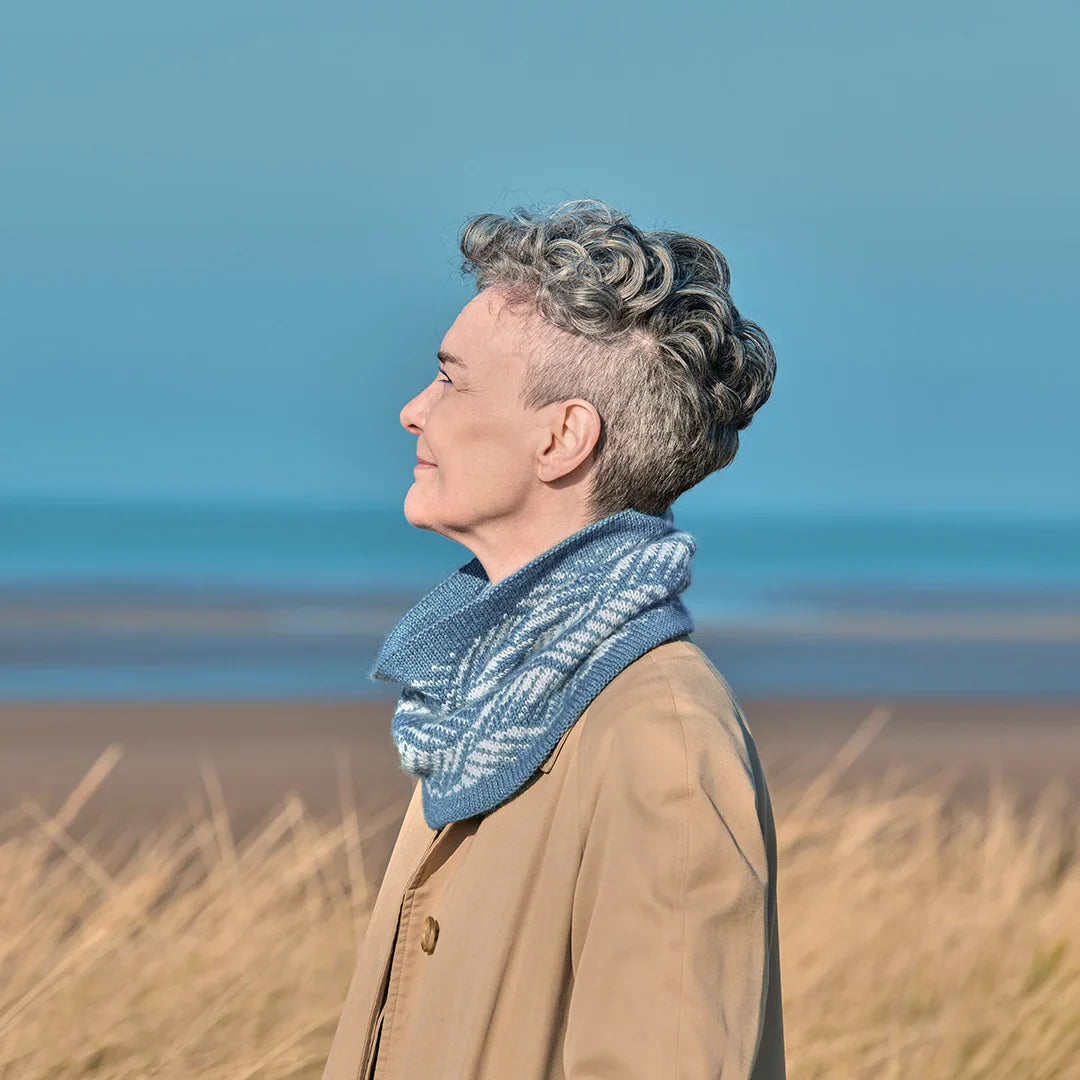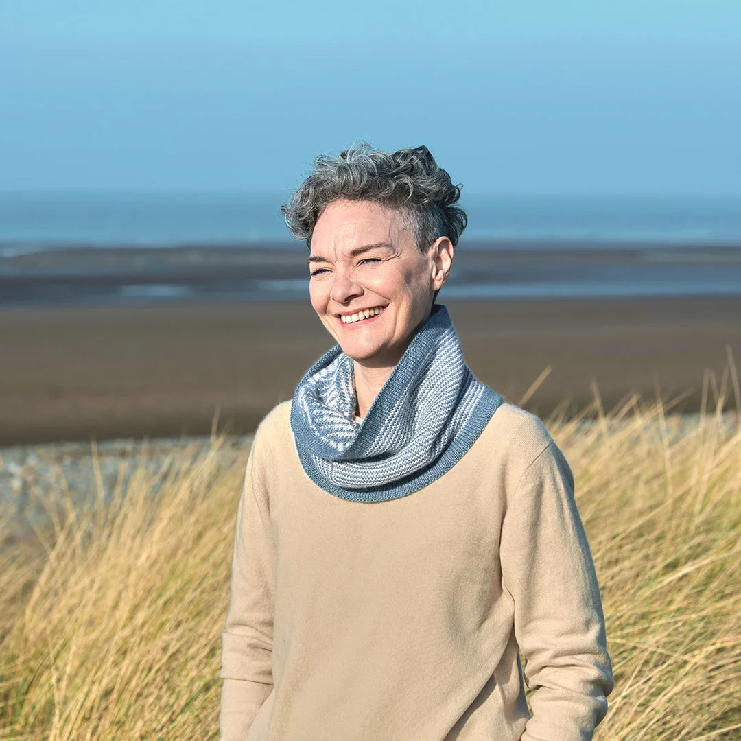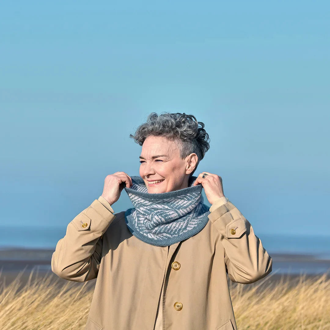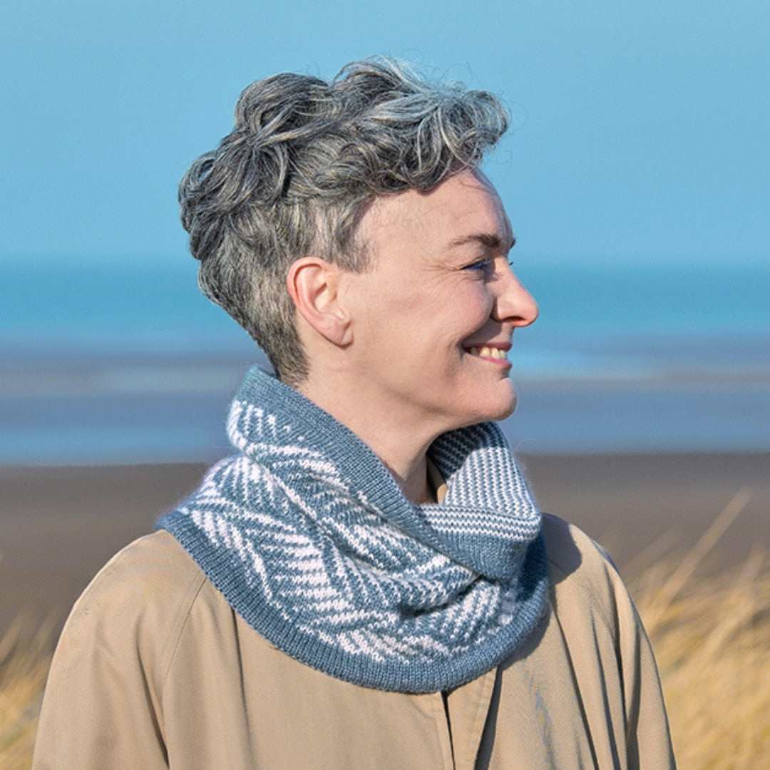 This beautiful double-thickness cowl features a stunning colorwork pattern that can be worn on either side, specially designed to neatly hide the floats. The wave pattern on one side is reminiscent of a stormy ocean, and a simple striped pattern on the other reflects the opposite – a calm ocean with occasional ripples. Designed in two jewel-toned shades of Road to China Light, a blend of natural fawn baby alpaca, camel hair, cashmere, and silk, this cowl feels superlatively soft close to the neck.