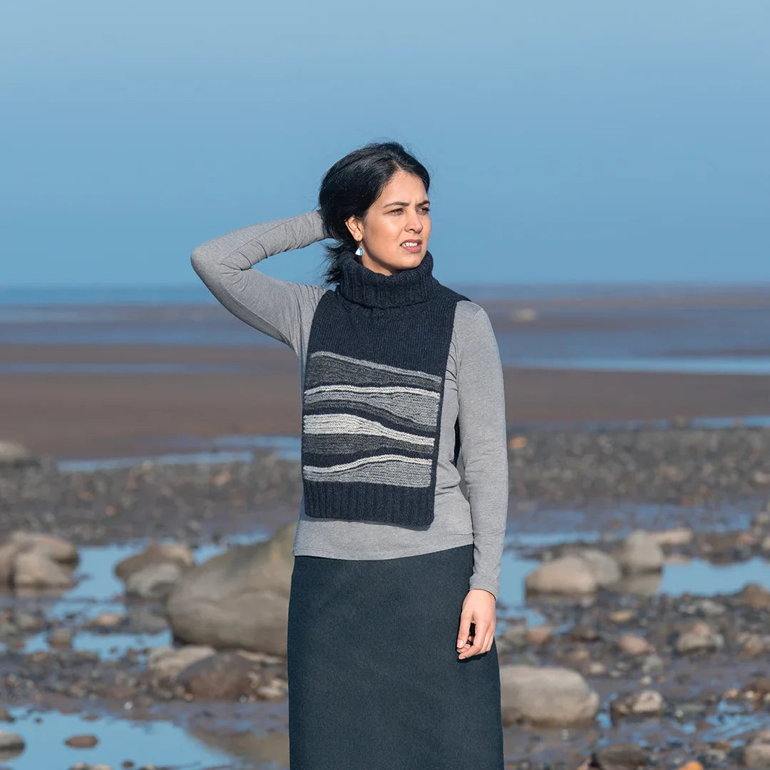This dickie top is a fantastic hybrid between an accessory and a garment, featuring a striking wavy pattern and a folded turtle neck. It is the perfect in-between project as it is not as involved as knitting a sweater but is just as effective in the outcome. With lots of techniques to learn, Valerie Ng uses a unique Soumak stitch in this design and gives two length options for the back piece – a regular version the same length as the front, or a cropped version.