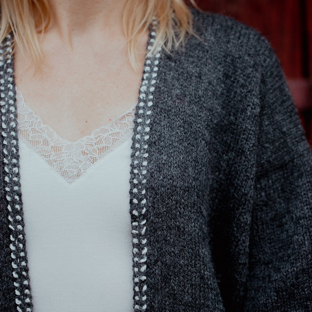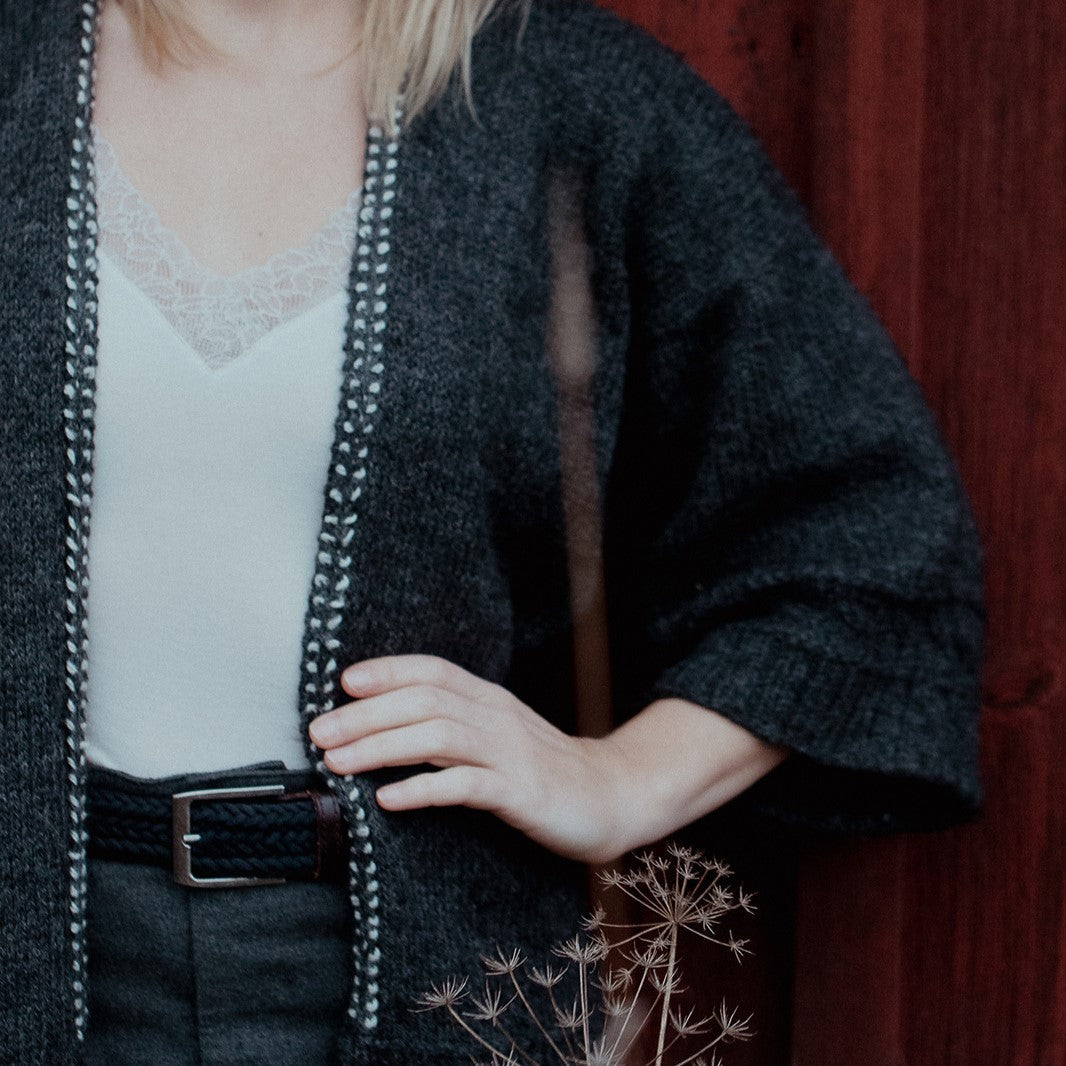 Please note: the grey cardigan sample shows an optional embroidery on the front edges in the shade White Heather. This uses approximately 50 m of a DK or worsted-weight yarn which is not included in this kit. If you would like the yarn to make this embroidery you may purchase another skein of Cumbria here.
