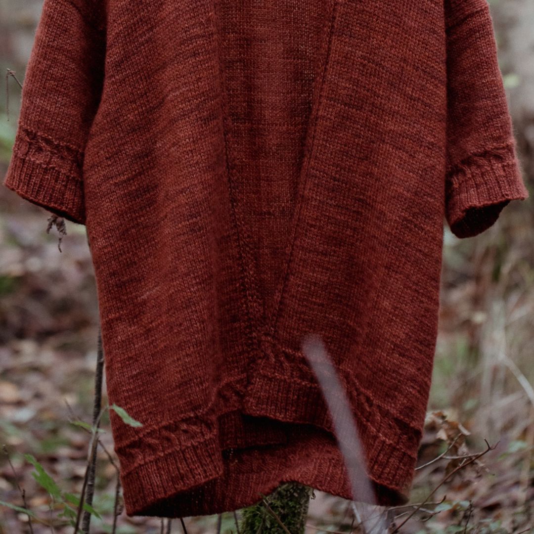The Dusk Cardigan is a loose-fitting, open cardigan with optional spine embroidery on the front edges. It is one of those comfortable pieces that you can throw over any outfit. The hourglass cables on the upper back, cuff and hem frame the large canvas of relaxing stockinette stitch, creating a reminder that there is time — time to add another stitch, another row, to the work we have at hand.