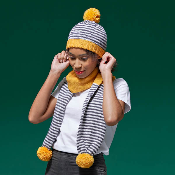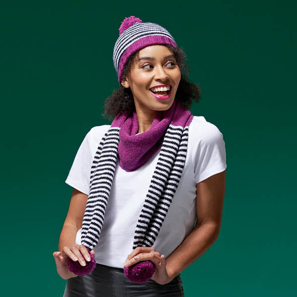 A striking Hat and Scarf Set from West Yorkshire Spinners using it's ColourLab DK yarn and an absolutely perfect project for taking on your travels.