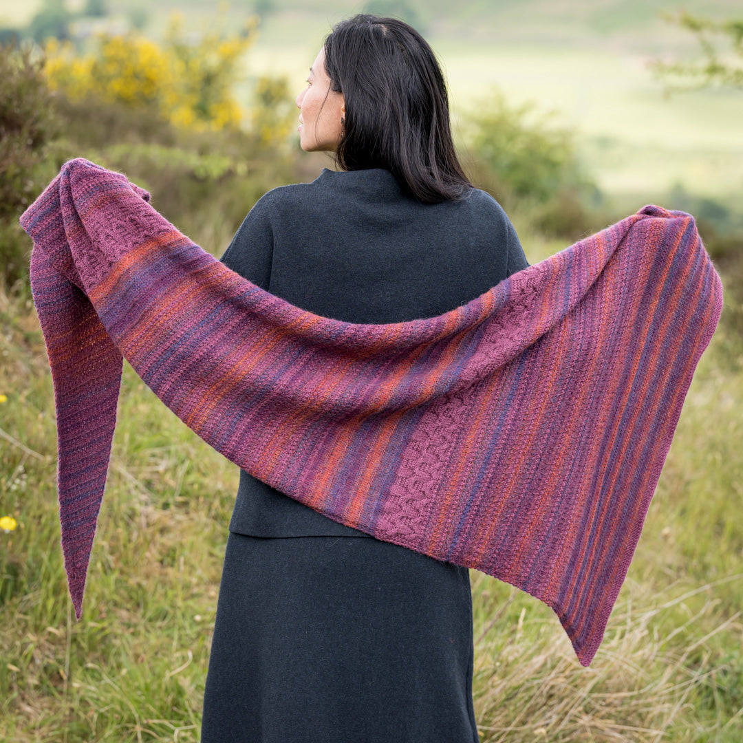 The Flowing Tides Shawl celebrates the magic of color transition through thoughtful construction and varied textures. This asymmetrical triangle is worked sideways with increases at the end of right-side rows, creating an organic shape that mirrors nature's flowing forms. Three distinct texture bands showcase different aspects of the design: slip stitch colorwork using Transitions paired with a solid shade of Cumbria Fingering, elegant cable work, and textured patterns, all unified by garter stitch borders and finished edges.