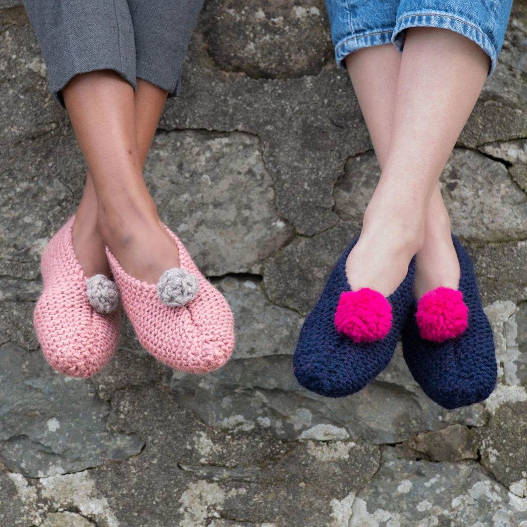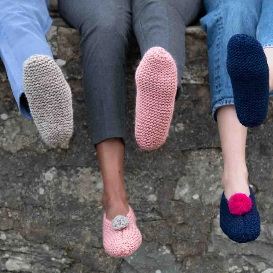 The Flushed Feet Slippers are worked in garter st, flat in one piece starting at the toe. The heel seam is created using a three-needle cast-off and to close up the toe, a small seam is worked. There are three embellishment options provided in the pattern – a simple pom pom, a crocheted flower and a crocheted button. If you’re not comfortable with crochet, the pom pom is a fun and easy option, but if you’re feeling adventurous, we’ll give you all the guidance you need to make sweet flowers or buttons.