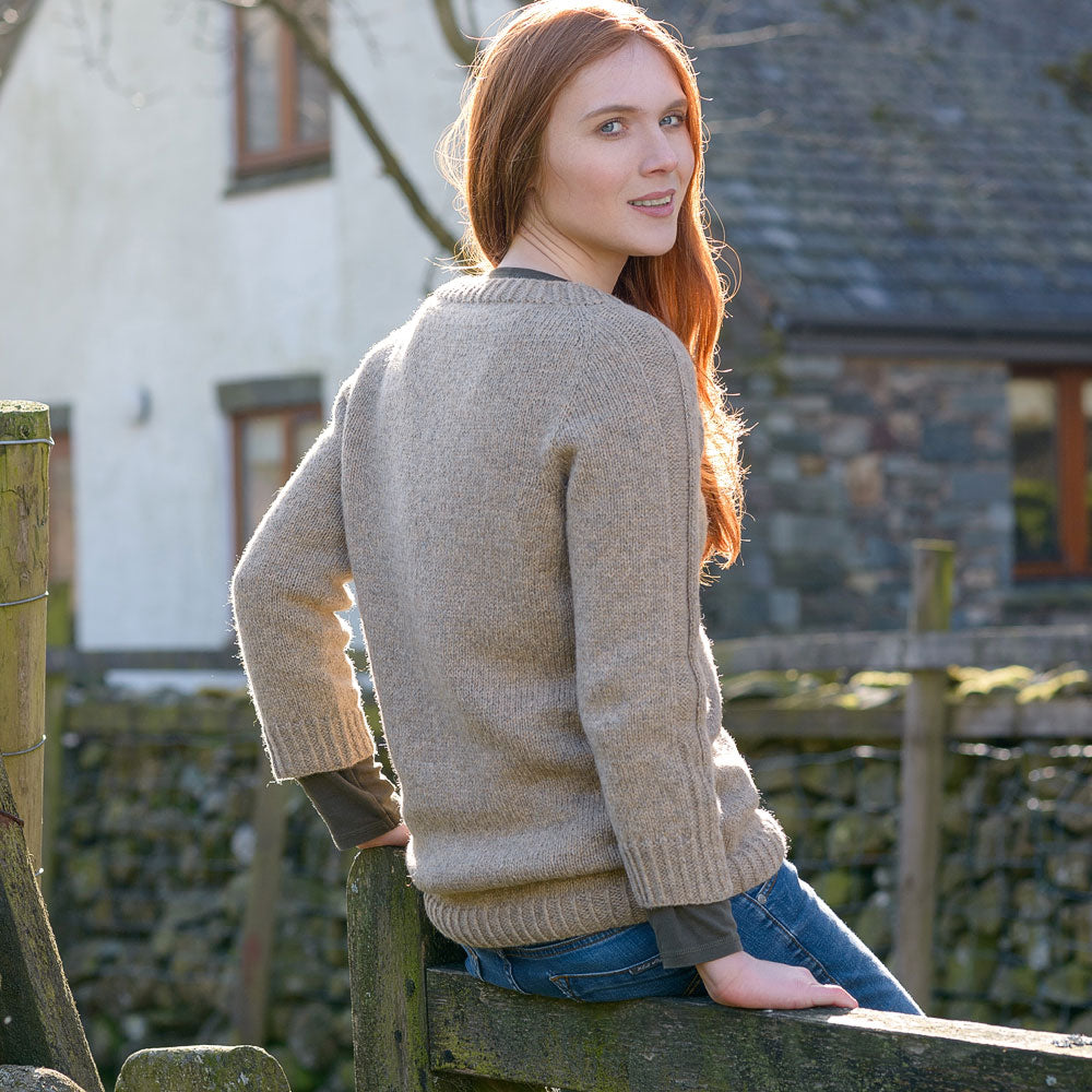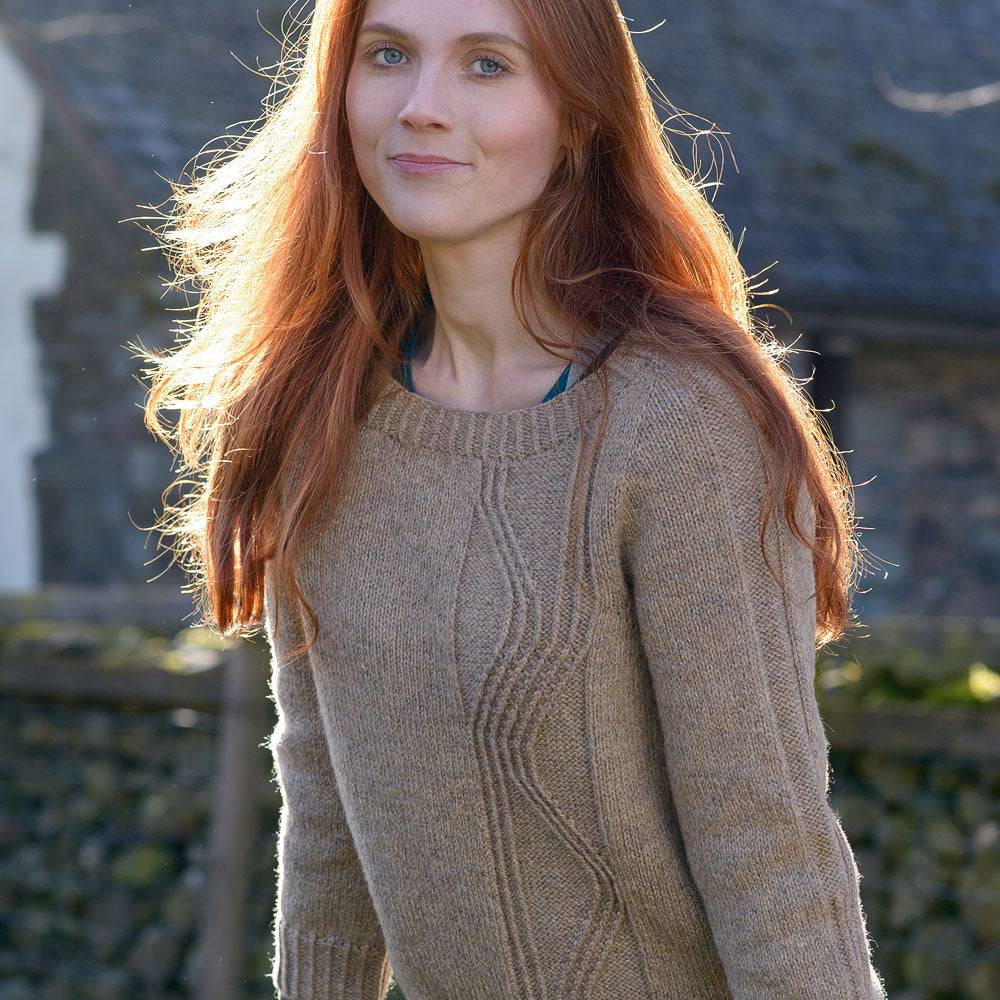 Knit in The Fibre Co.’s Lore, a 100% lambswool DK weight yarn spun in England’s historical textile region, this design truly comes to life. Lore’s lofty, woolen-spun structure offers incredible stitch definition—making those twisted stitches pop—while its gentle halo and soft hand ensure cozy, all-day comfort. Durable yet lightweight, Lore is the ideal match for this relaxed-fit sweater, offering both warmth and breathability. Its heritage character adds depth to the fabric, beautifully complementing Marie Greene’s modern yet classic aesthetic.