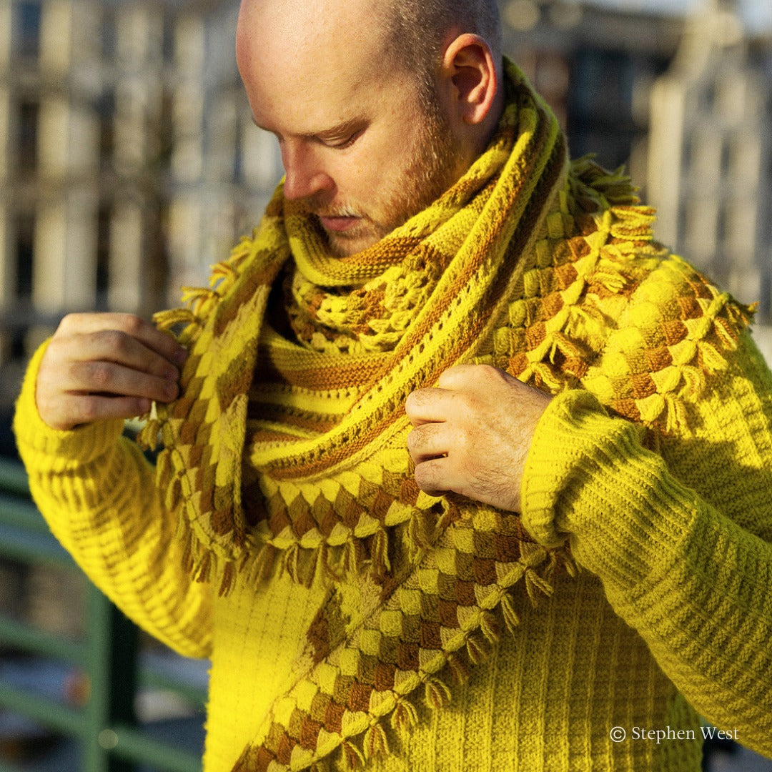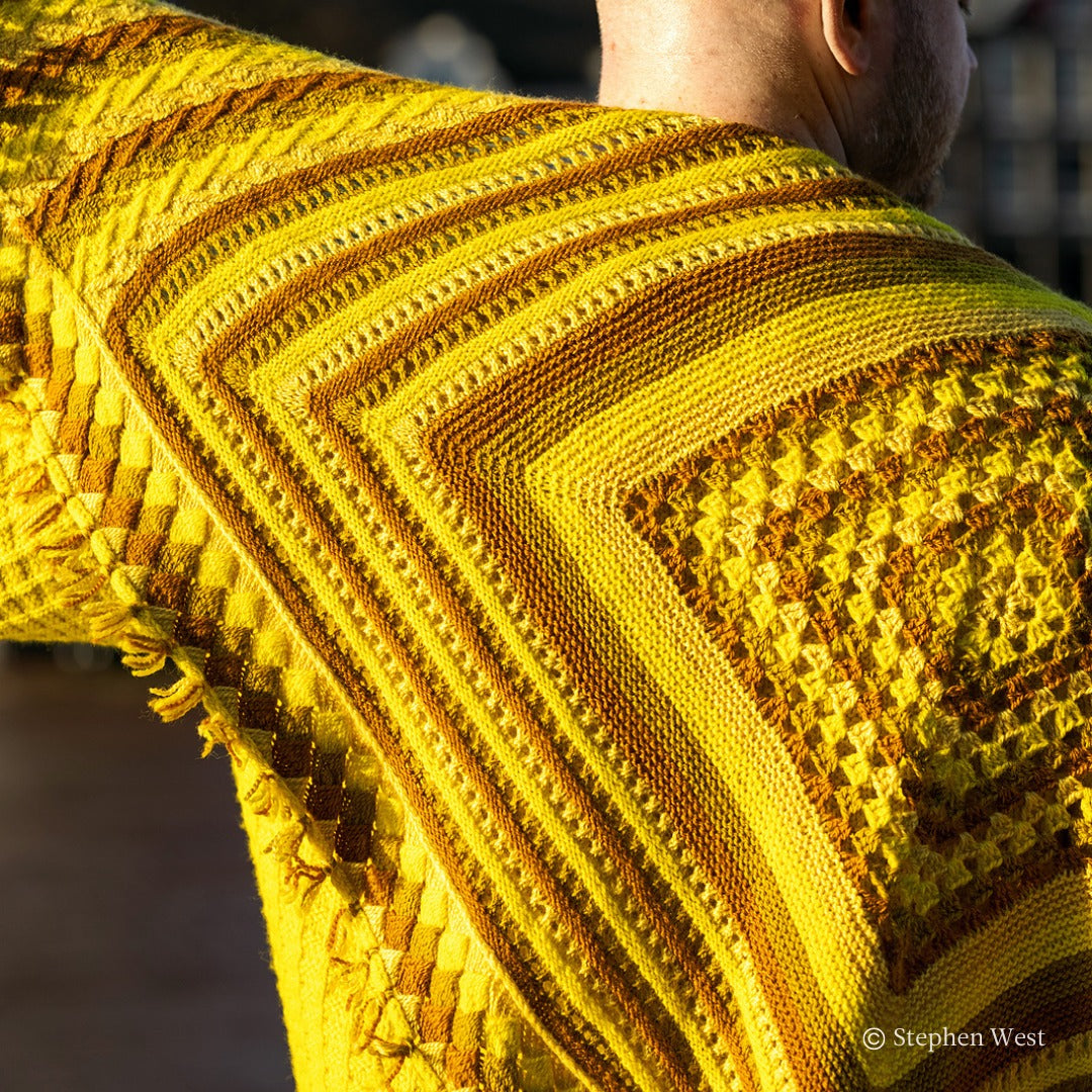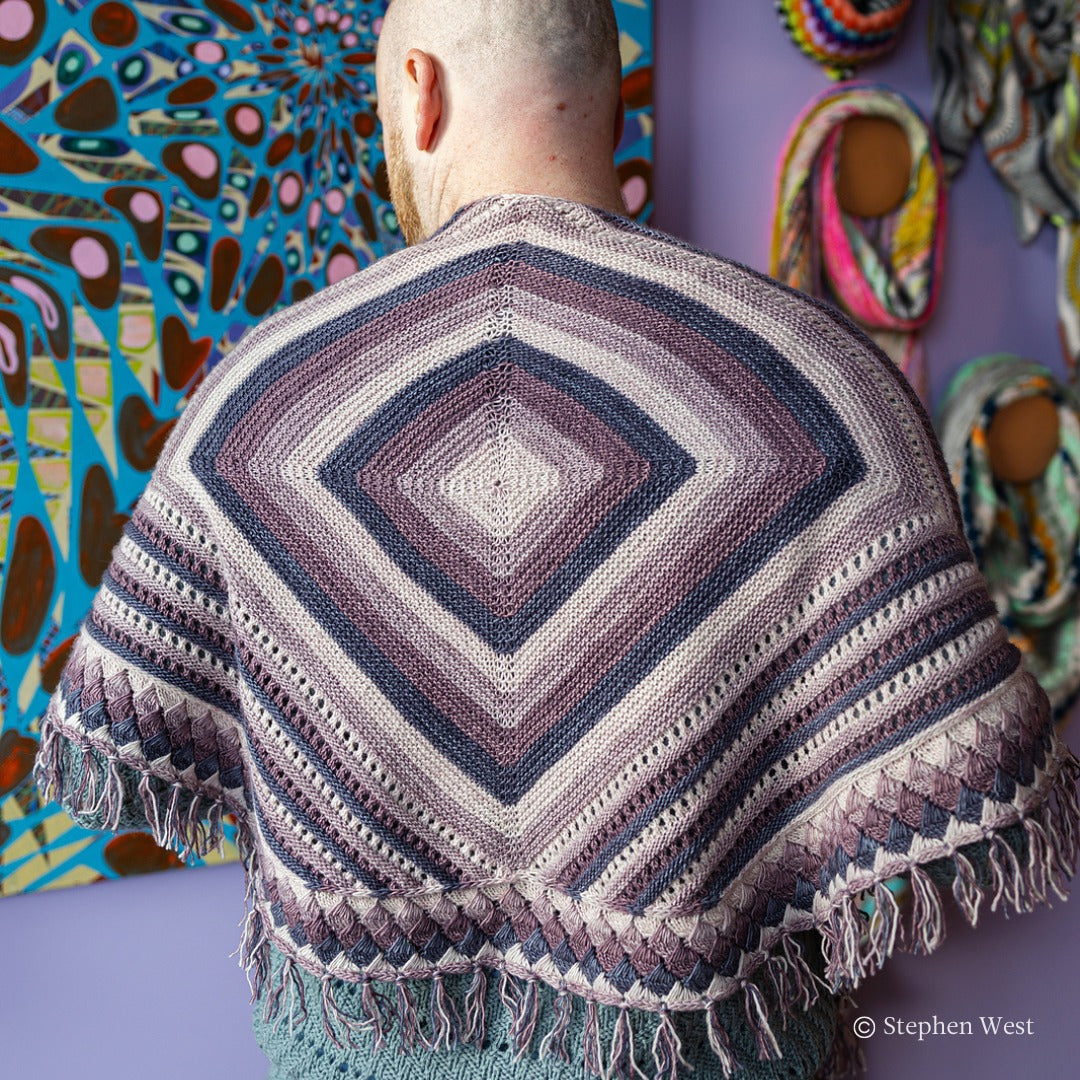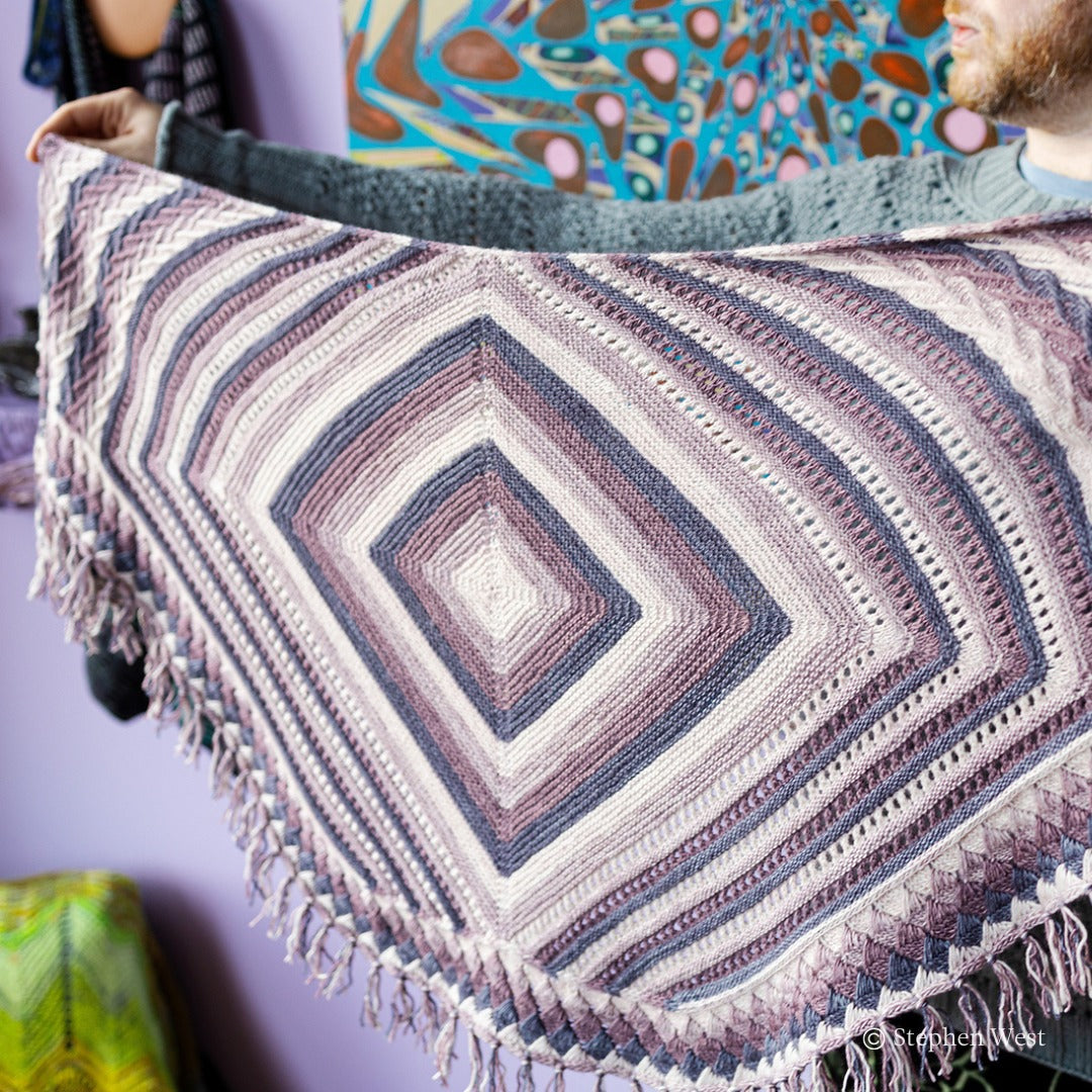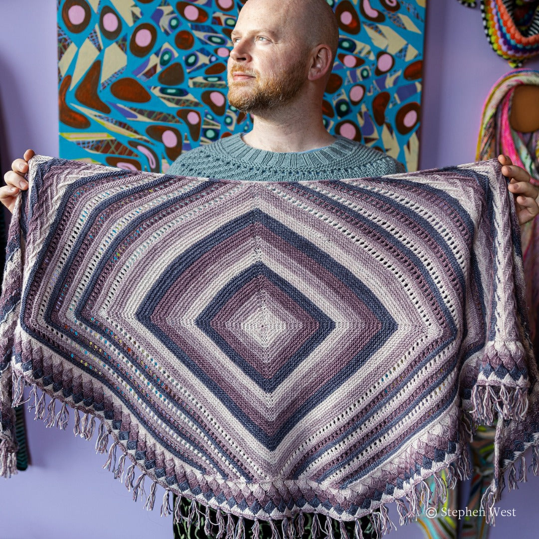 Stephen West's 14th Mystery Shawl Knit Along (MKAL) is a geometric explosion of color using a gradient of four colors. Join Stephen as he guides you through the mesmerizing stitches of this shawl with video tutorials. The Geogradient Shawl is a large shawl, similar in size to the Starflake or Winter Lights Shawl. It is not quite as massive as some previous MKAL shawls that used 5 colors like Texture time or Slipstravaganza. There is also a crochet option in Section 1 of the pattern. There is an option to customize the size of your shawl if you have extra yarn to make it larger or if you want to stop a bit early for a smaller shawl.