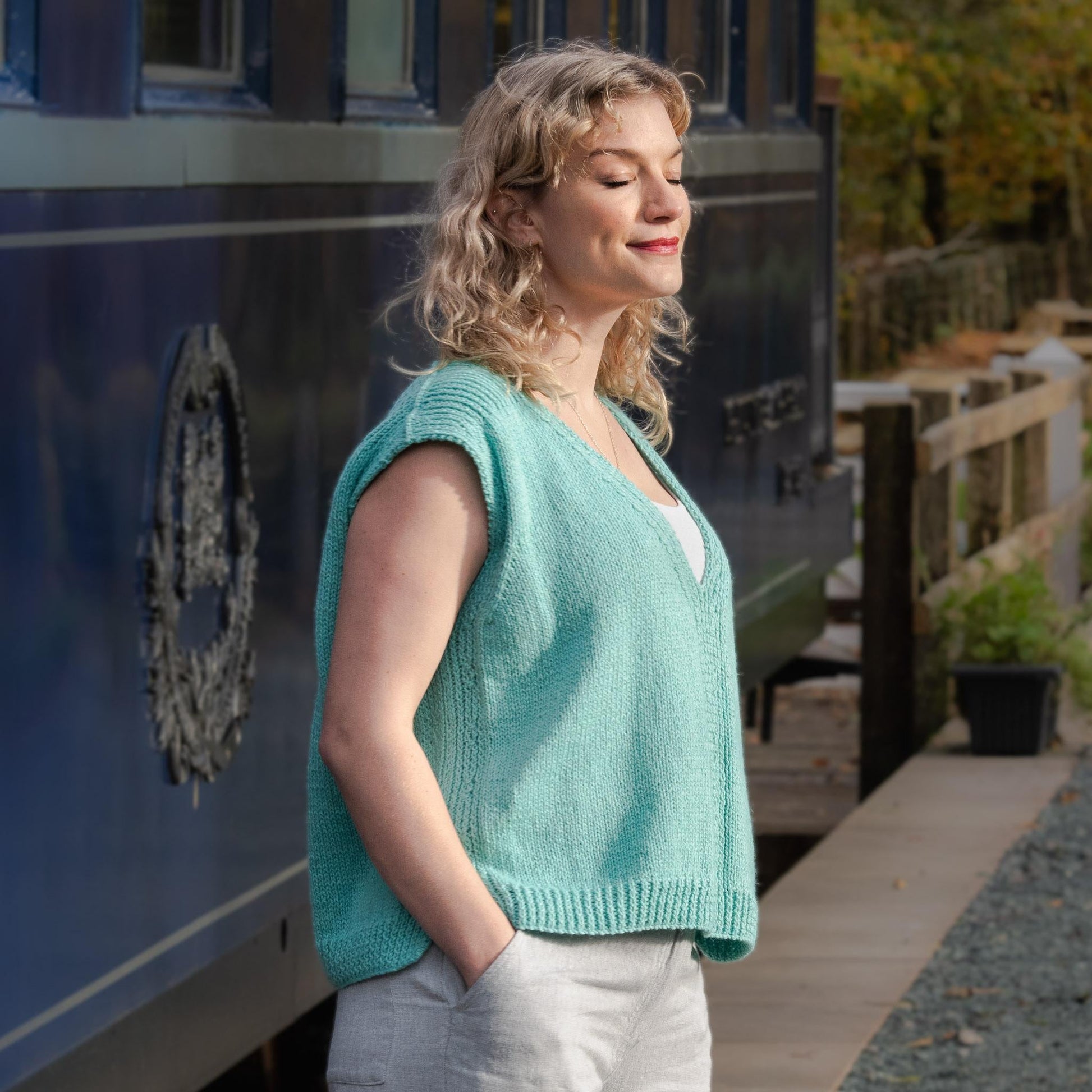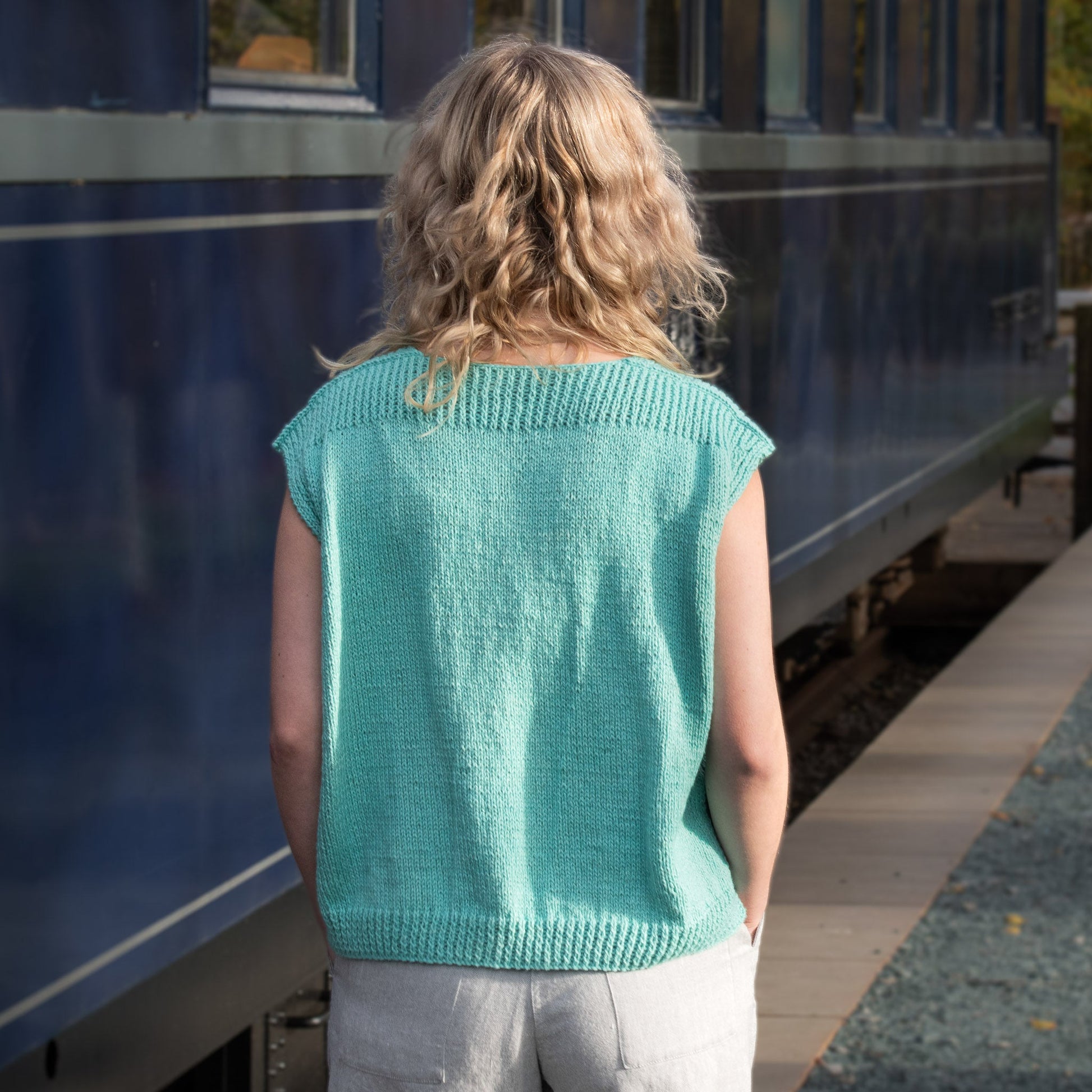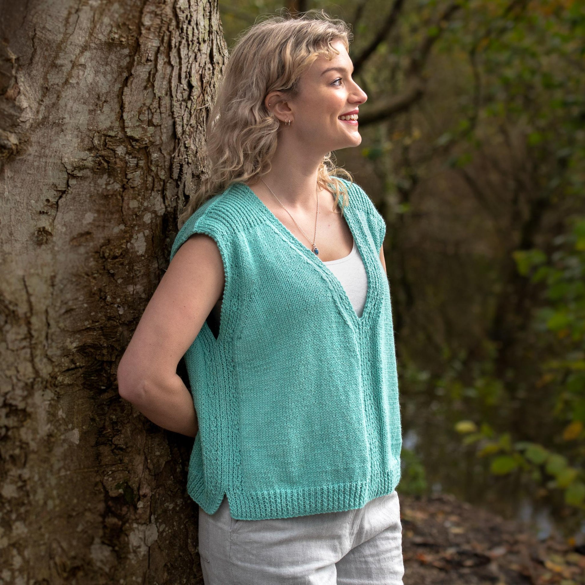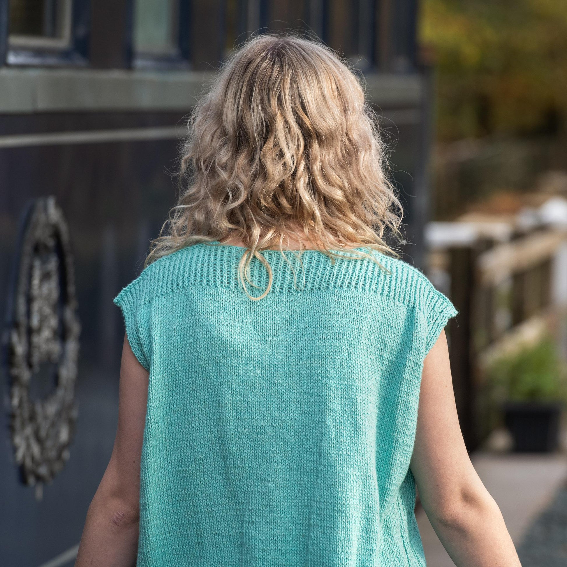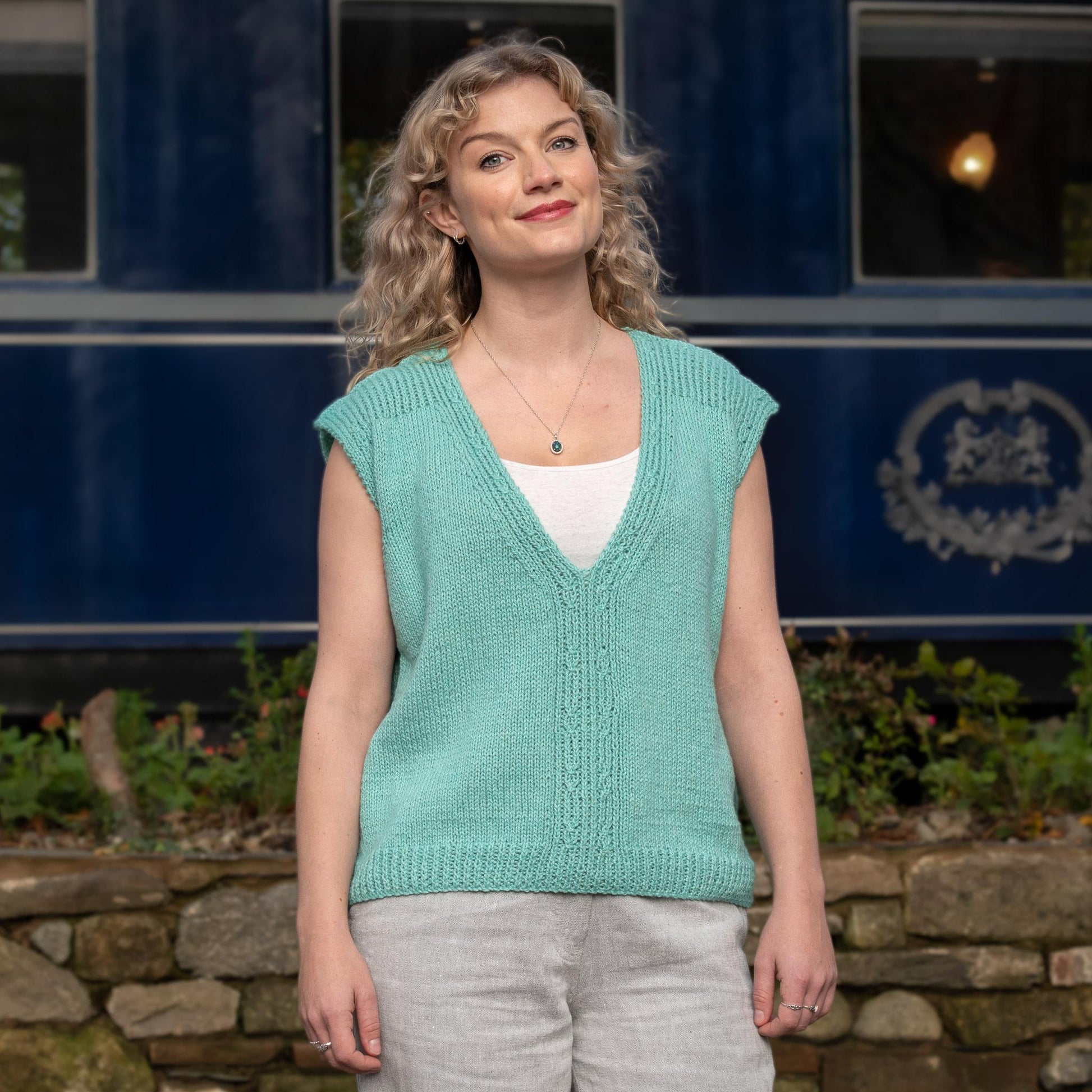 Ginseng is a sleeveless tee with a deep V-neck knit in pieces from the bottom up, with decorative ribbing over the shoulders, along the front neck and down the centre front. The front and back are joined at the shoulders with a 3-needle cast-off to create a decorative and useful external shoulder seam. After the shoulders have been cast-off, the sides are mattress stitched together. The pattern is written for 2 lengths.