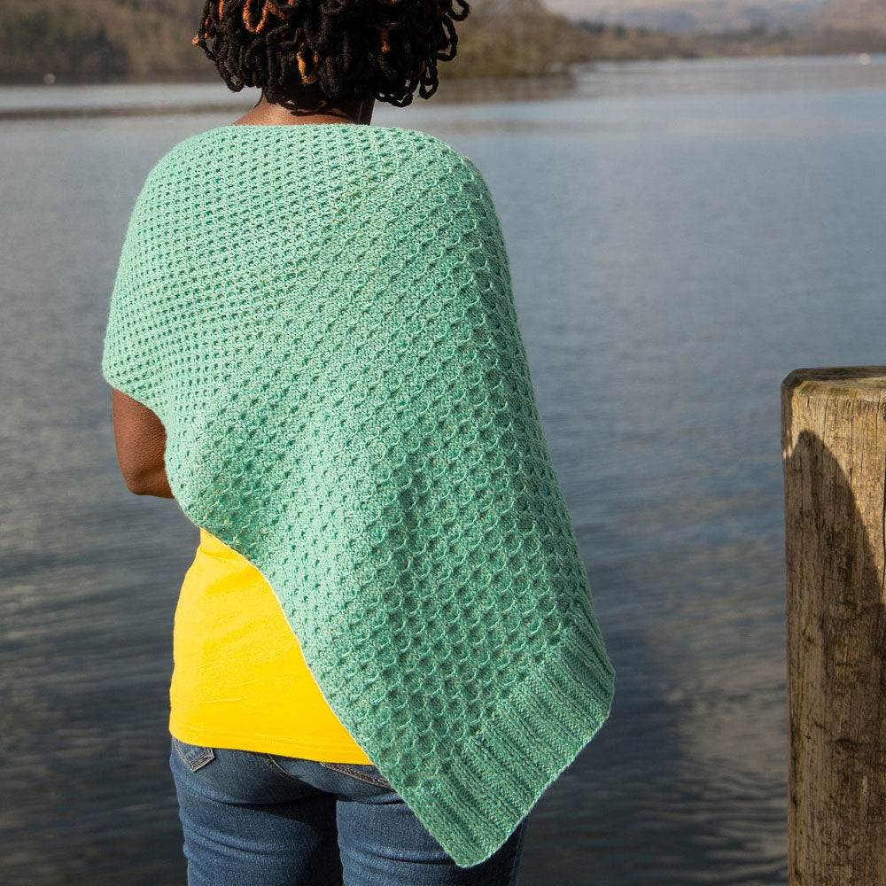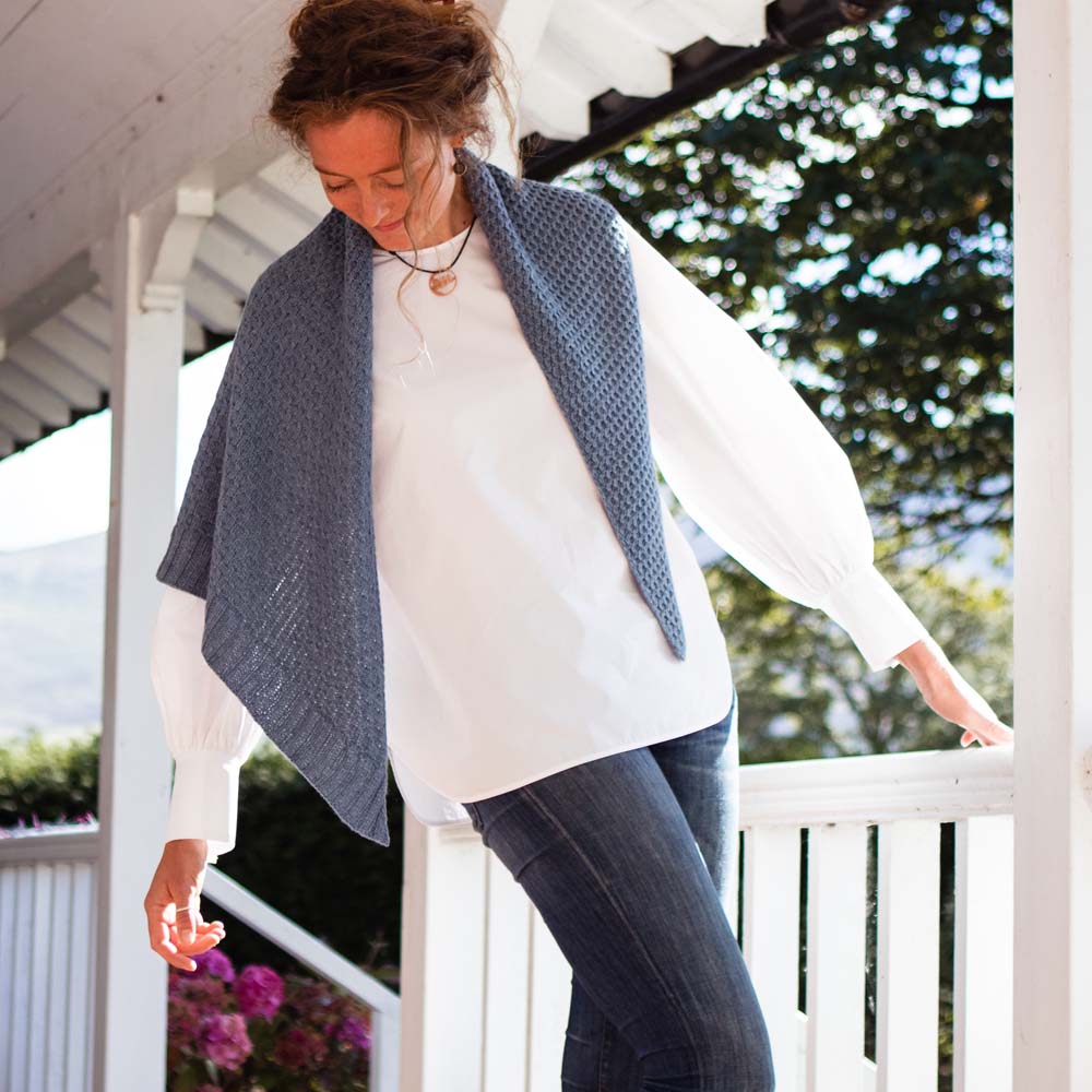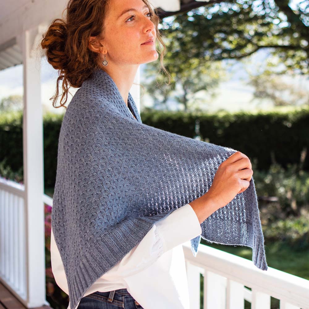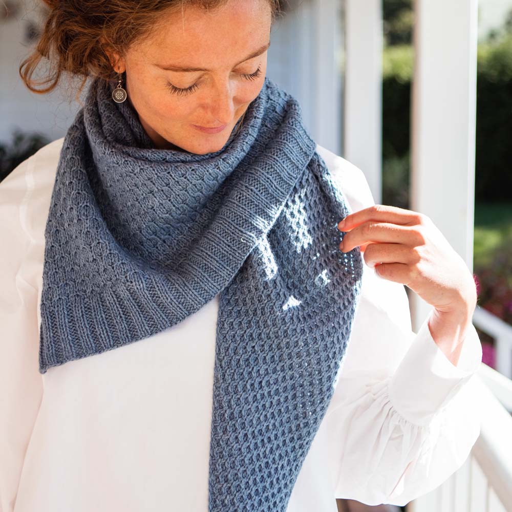 Wrap yourself up all year round in Glykos, an asymmetric triangle shawl designed in lightweight Luma. The shawl begins with a compact honeycomb cable that transitions into a larger, more expansive stitch that is a pleasure to knit. A crisp, ribbed border finishes it off neatly.