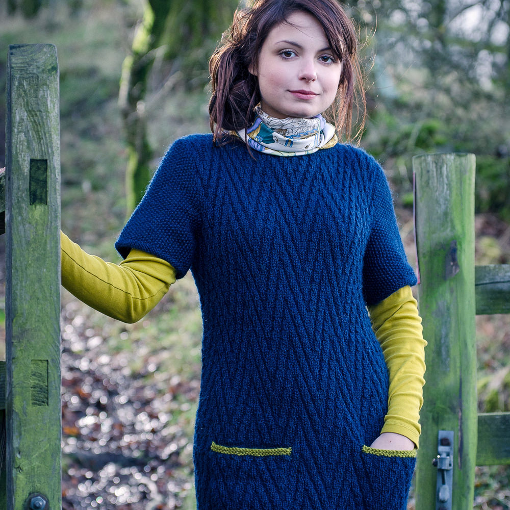 The dress which can also be worn as a tunic is worked flat and pieced together