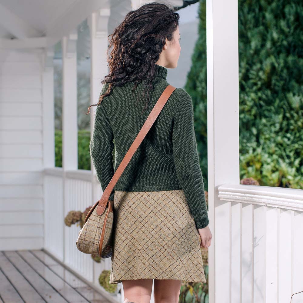 Kari is seamed pullover knit in pieces from the bottom up. Designed by Emma Wright, Kari has a lovely front cable and bobble pattern with seed stitch on the back and sleeves.
