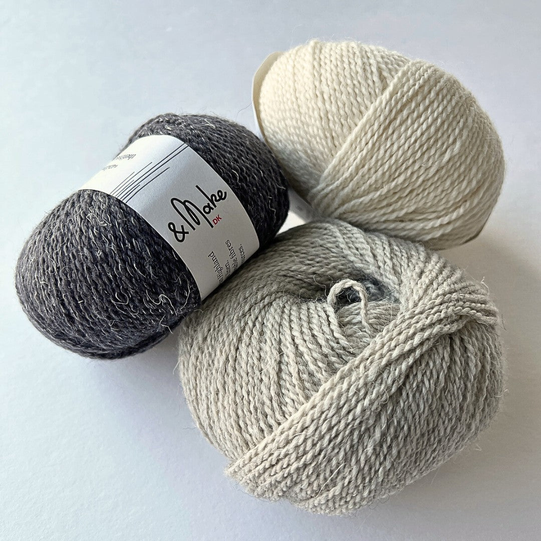 The Fibre Co. &Make DK (55% Highland wool, 35% alpaca, 10% linen, 125 m (137 yd) per 50 g ball) in shades Careless Whisper (MC) – 9 (10, 11, 11, 12) (13, 14, 15, 15) balls, Gosling (CC1) – 1 ball (all sizes) and Betty White (CC2) – 1 ball (all sizes).
