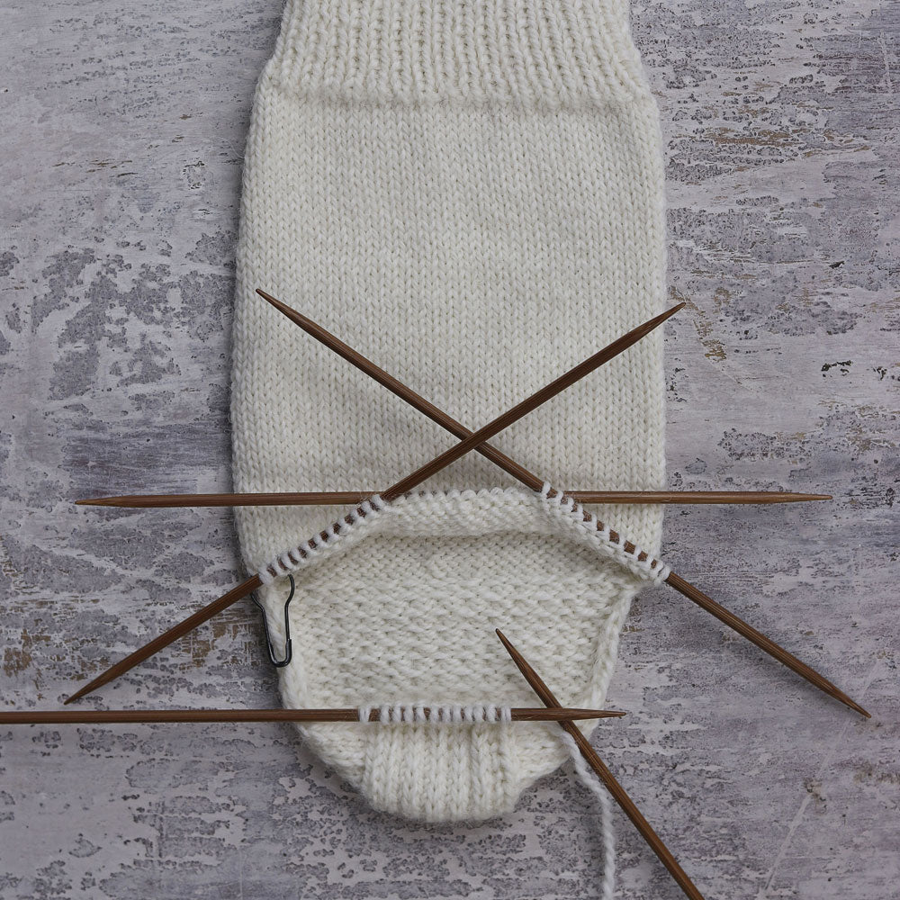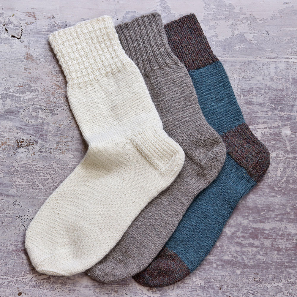 The full-size sock pattern uses the same overall process but has a few key differences: more stitches and longer lengths, of course, and a snugger ribbing for improved fit. The heel flap and turn are worked in a reinforcement stitch pattern to help the socks last a long time.