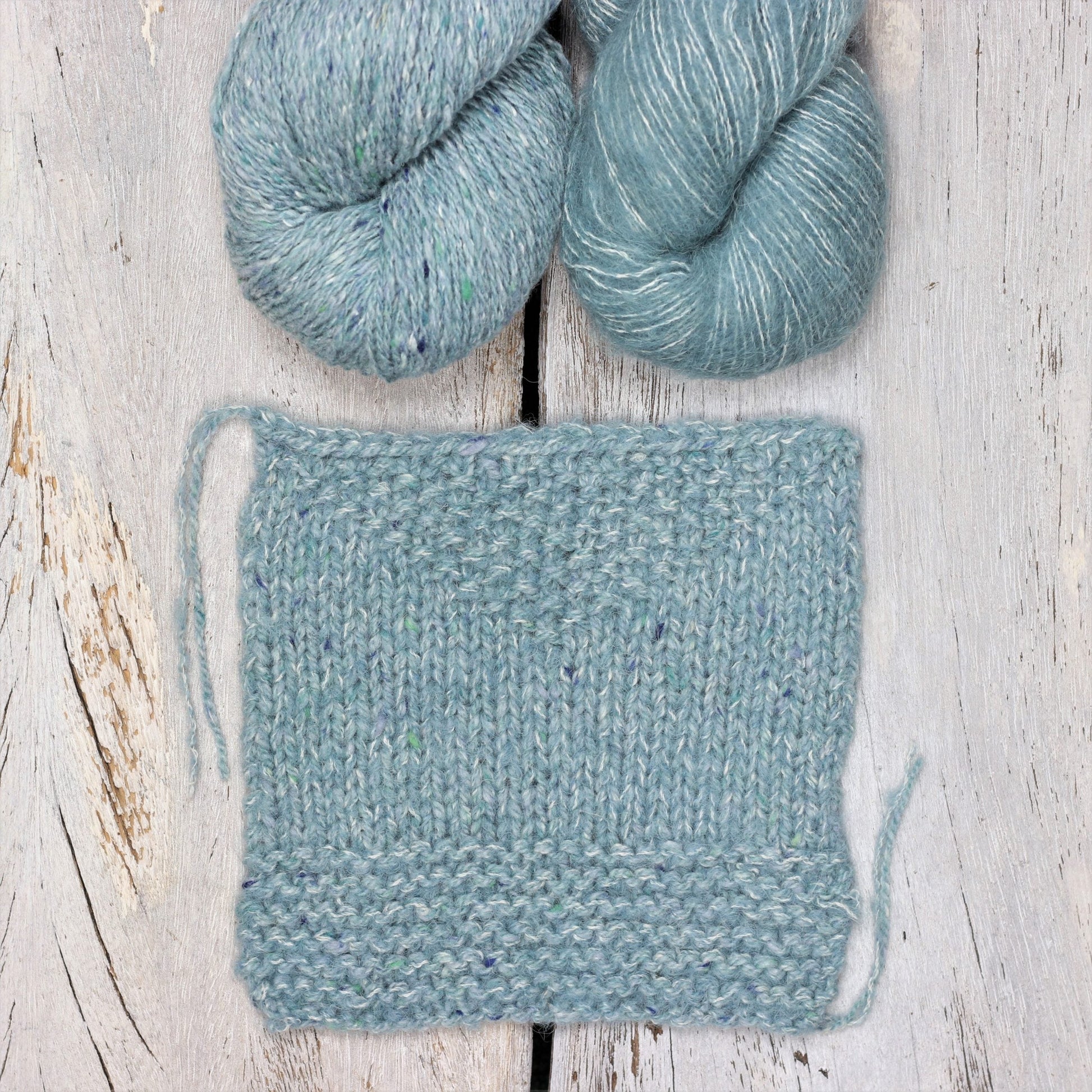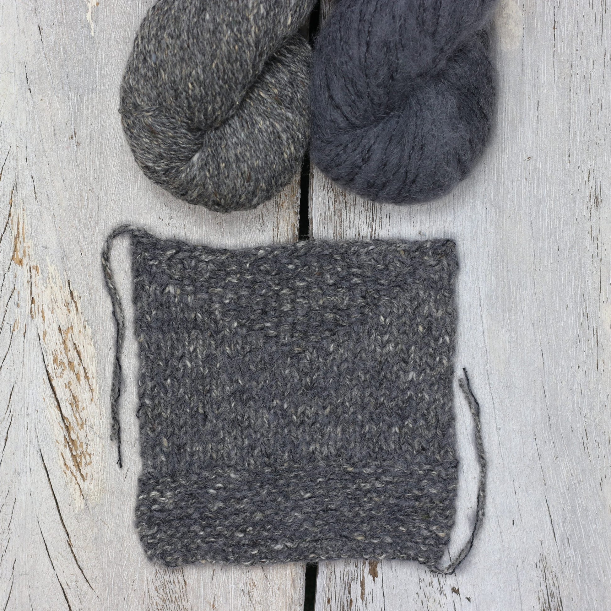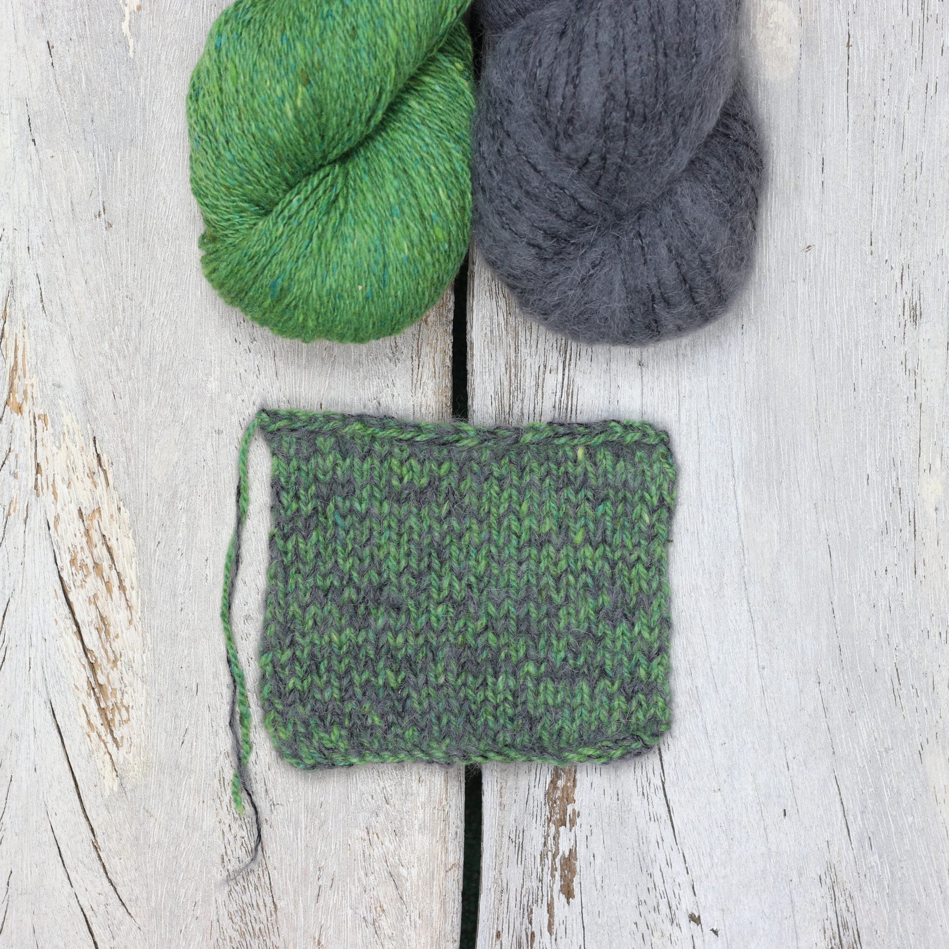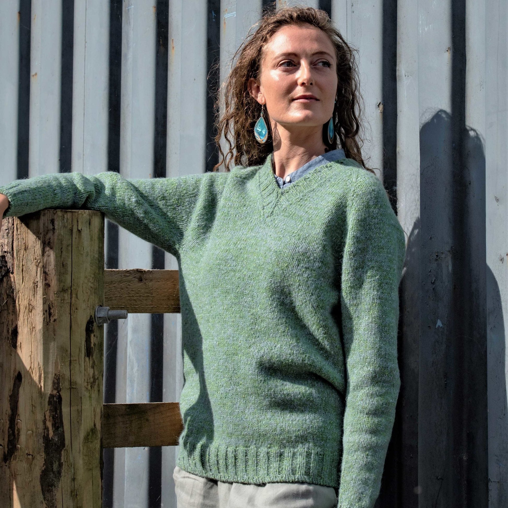 One Sweater V-neck is knit using two different yarns held together. This kit uses the combination of Cirro and Arranmore Light held double. The warmth and volume from Arranmore Light knit with the fuzzy softness of Cirro merge into a wonderfully cozy, heathered fabric.