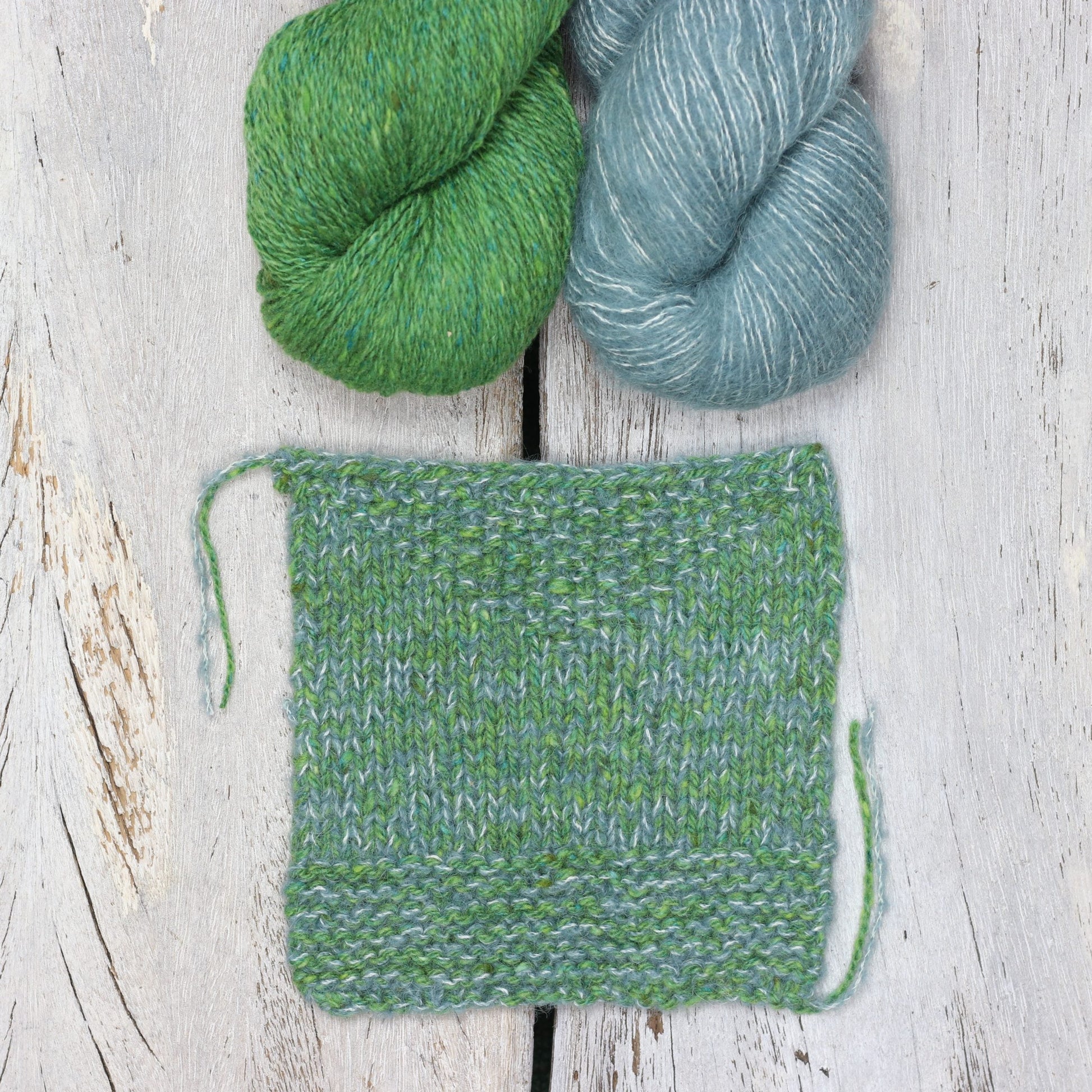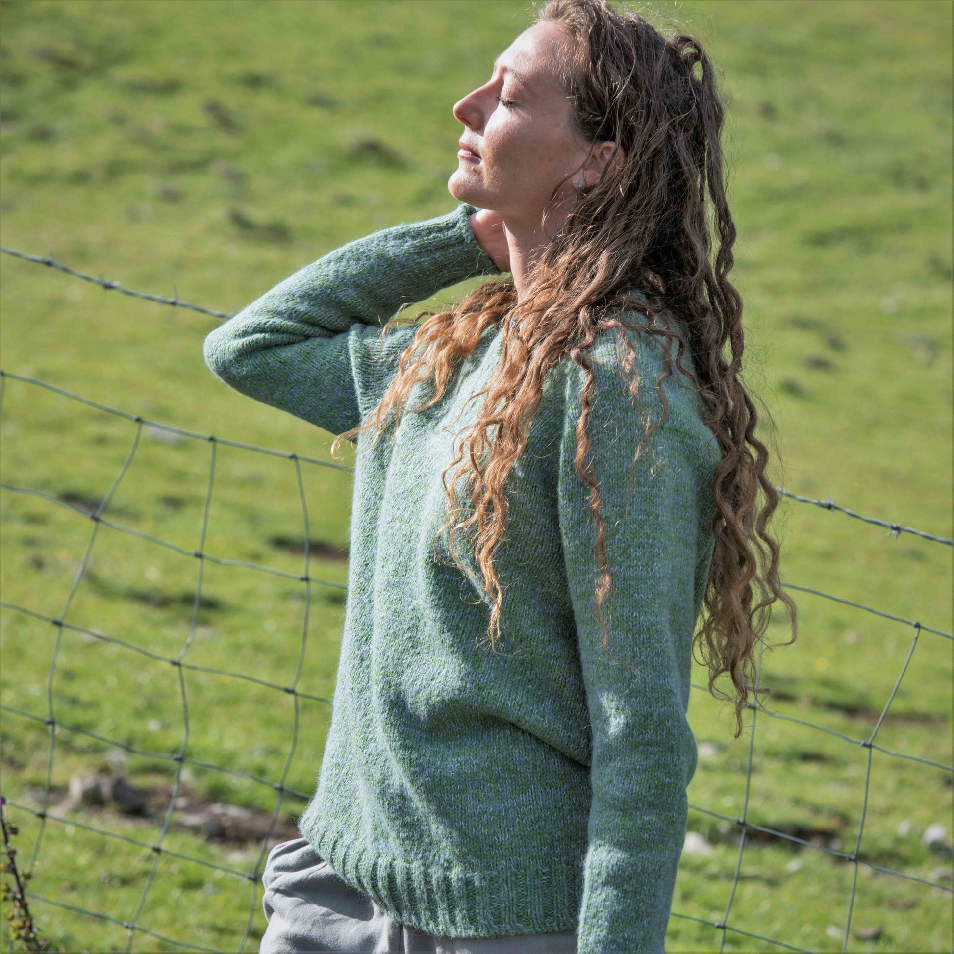 The photos show the sweater in Cirro, shade Divine, held double with Arranmore Light, shade Shamrock.