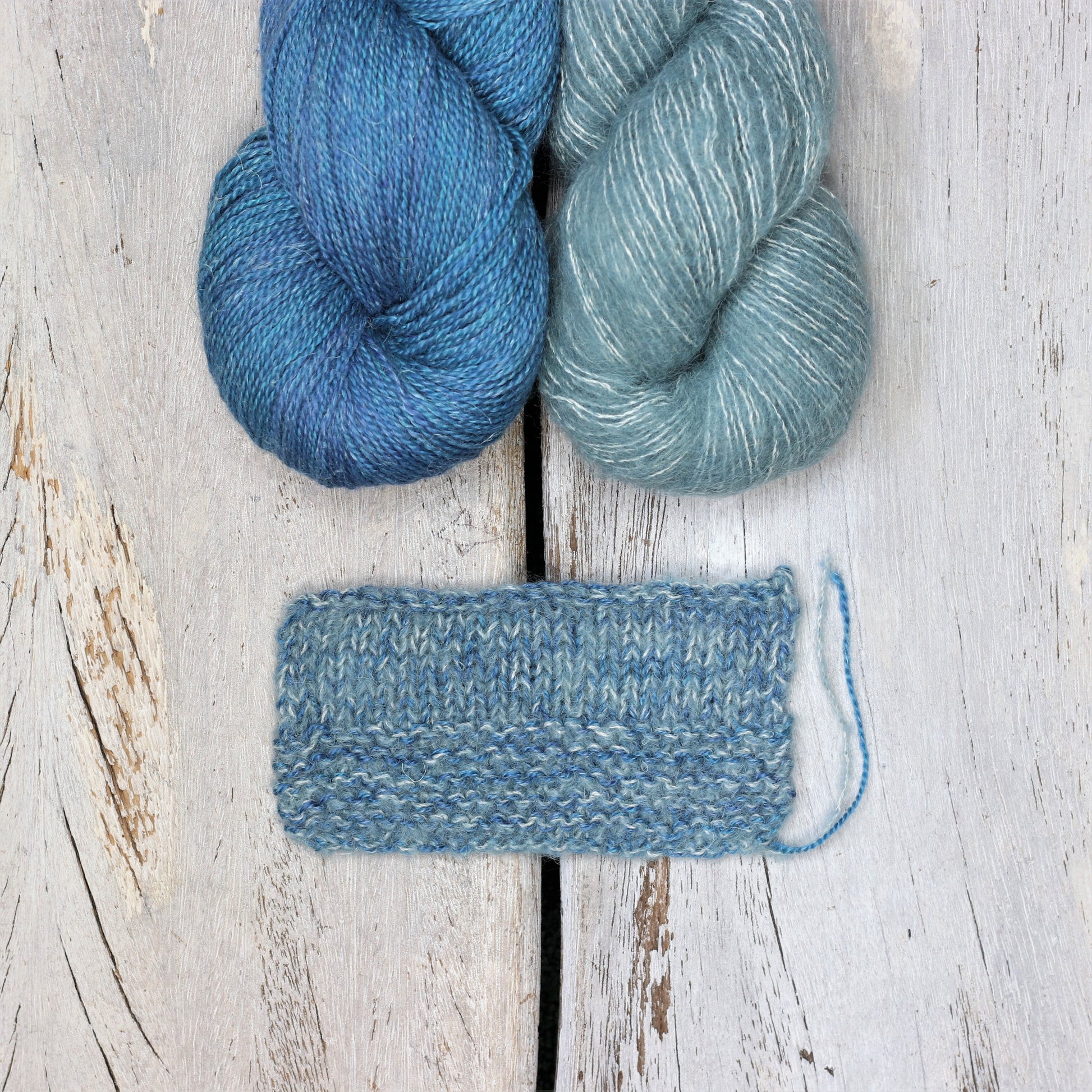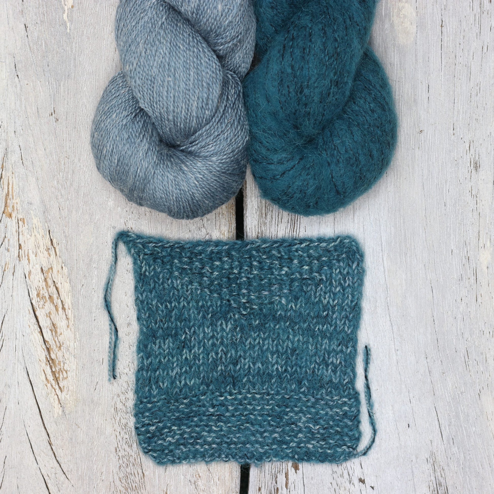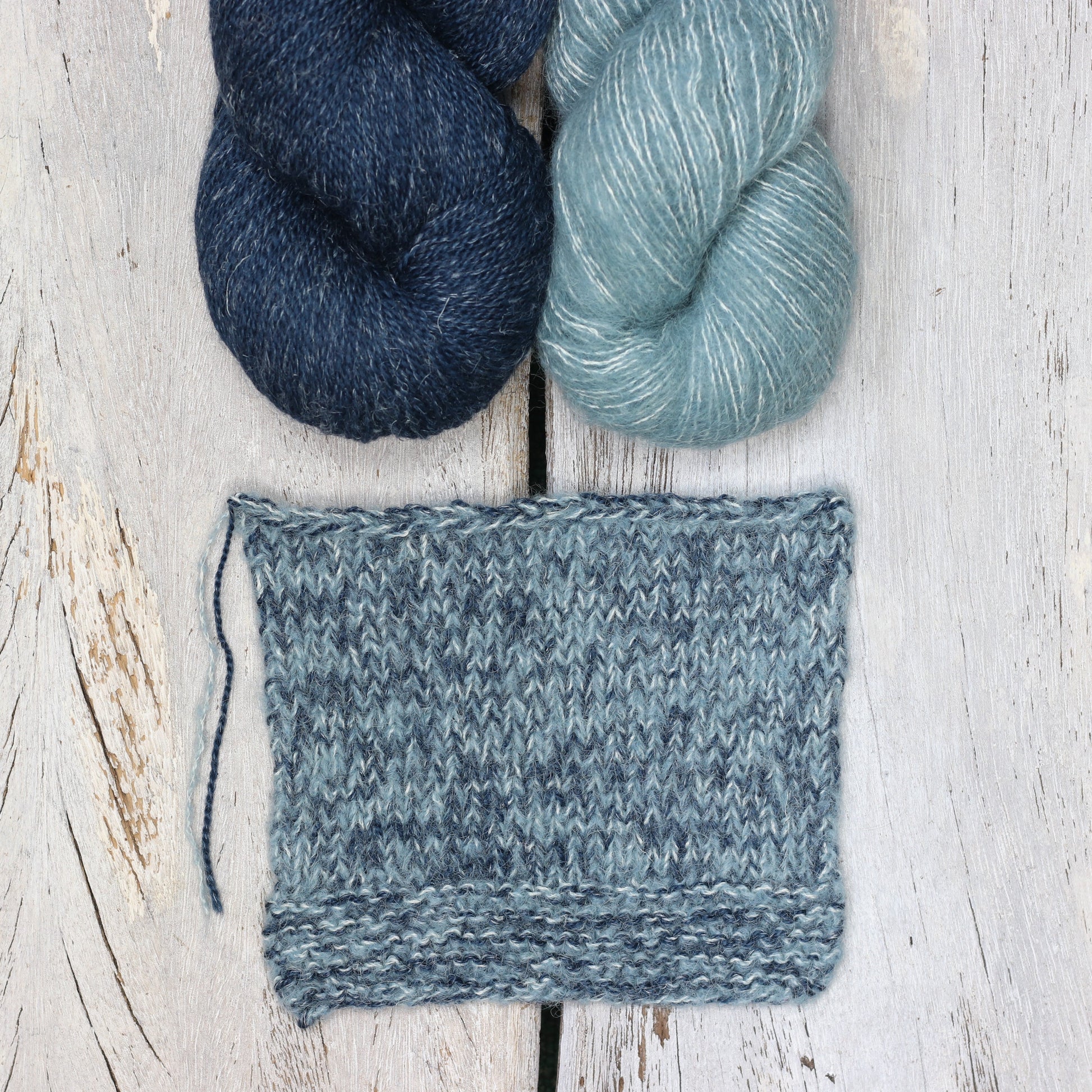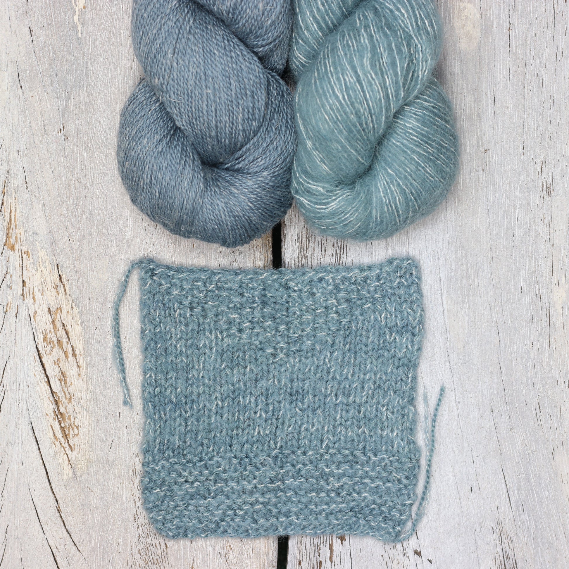 The photos show the sweater in Cirro, shade Celestial, held double with Meadow, shade Red Clover.