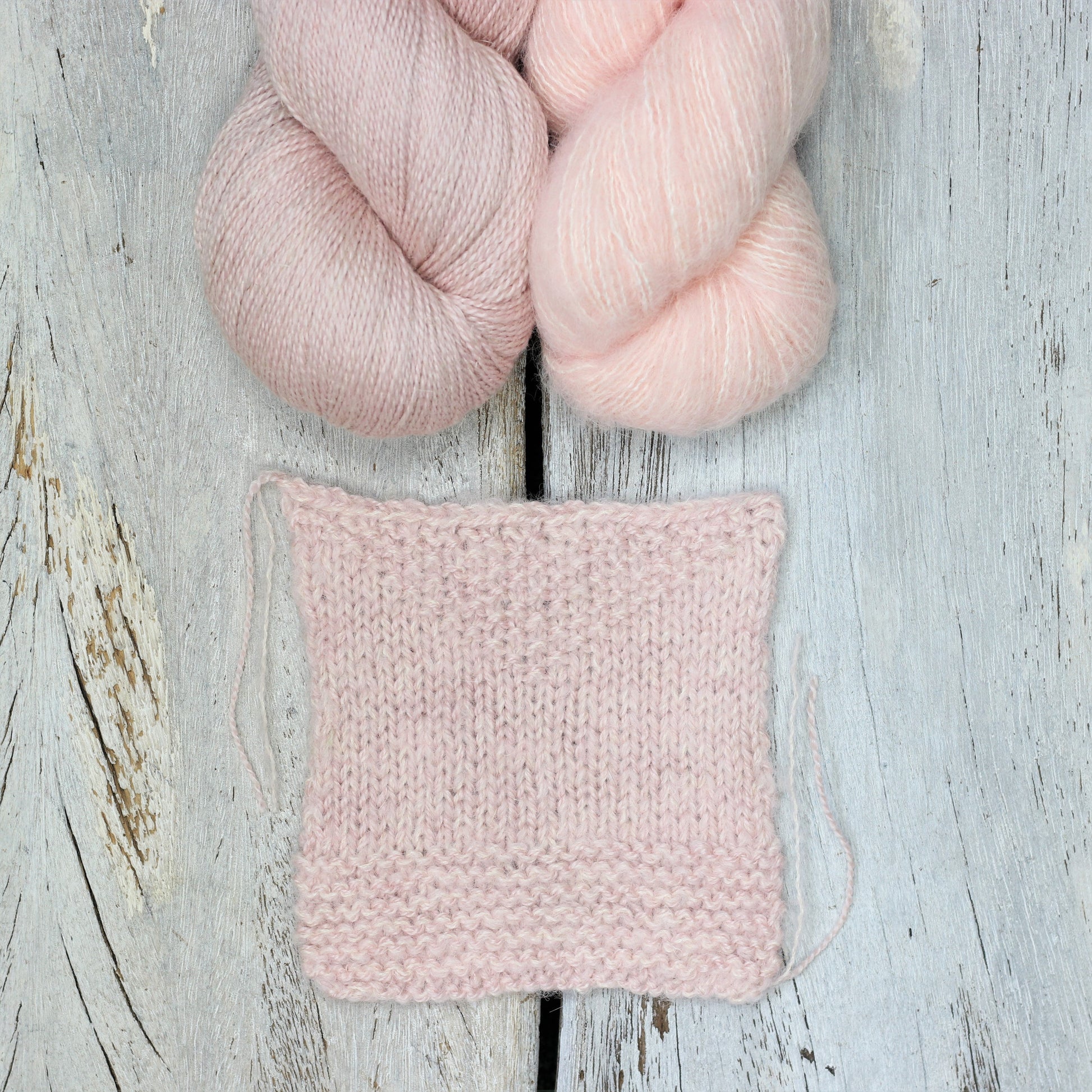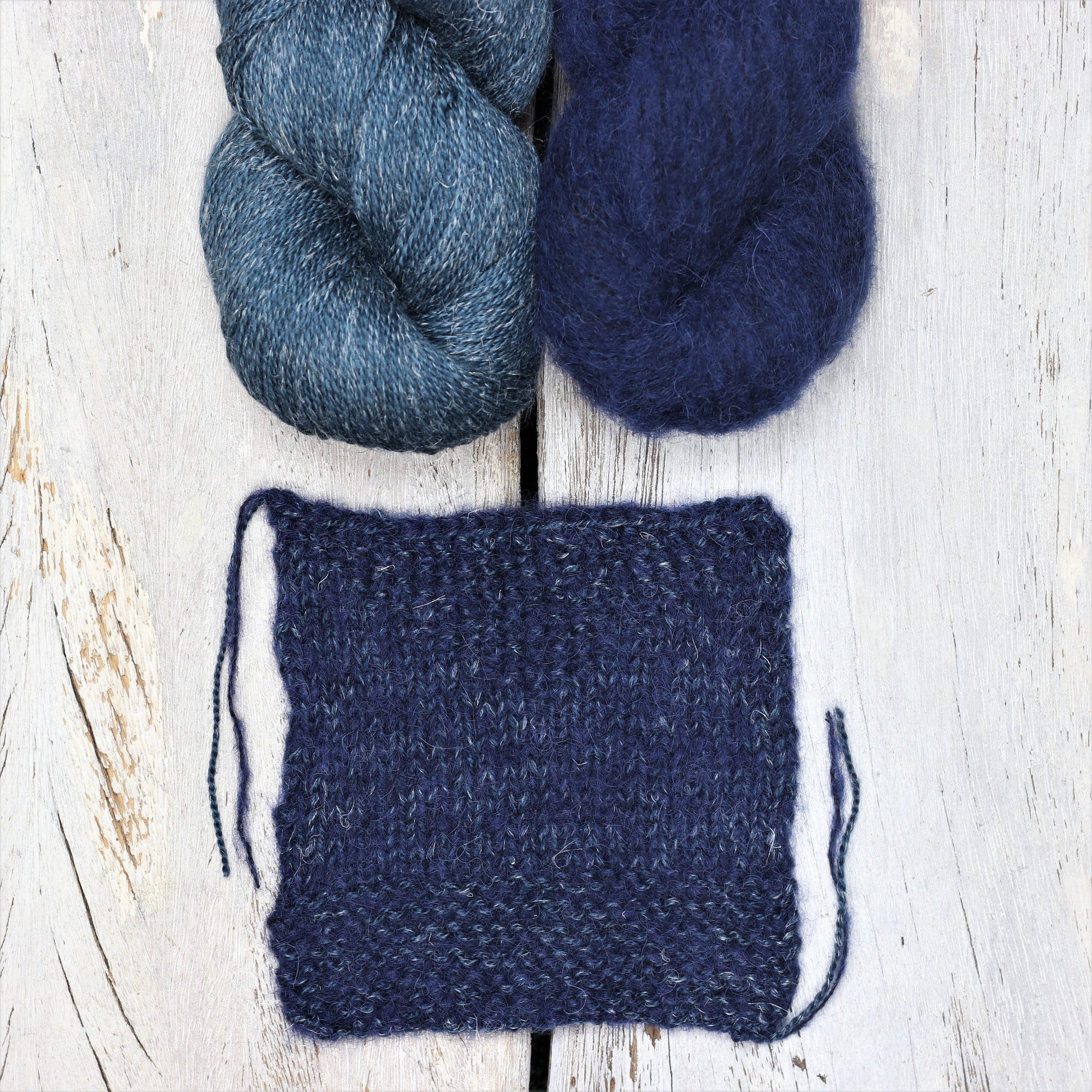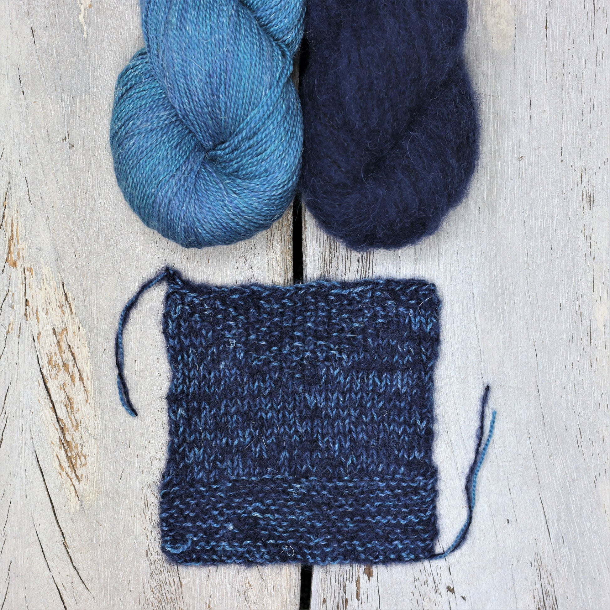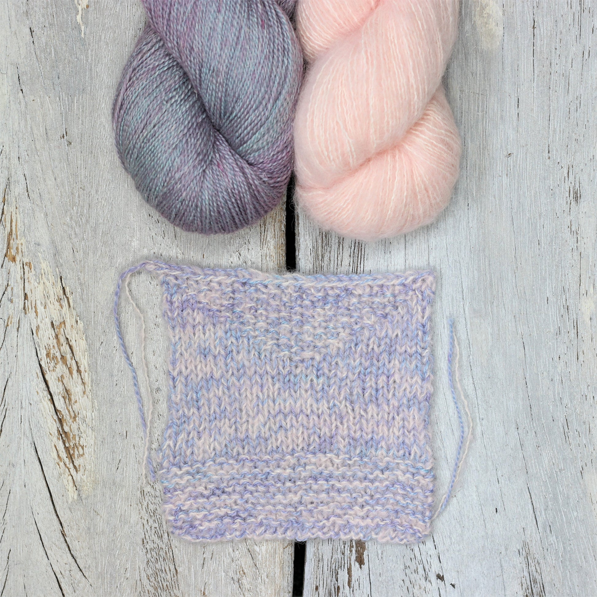 The photos show the sweater in Cirro, shade Celestial, held double with Meadow, shade Red Clover.
