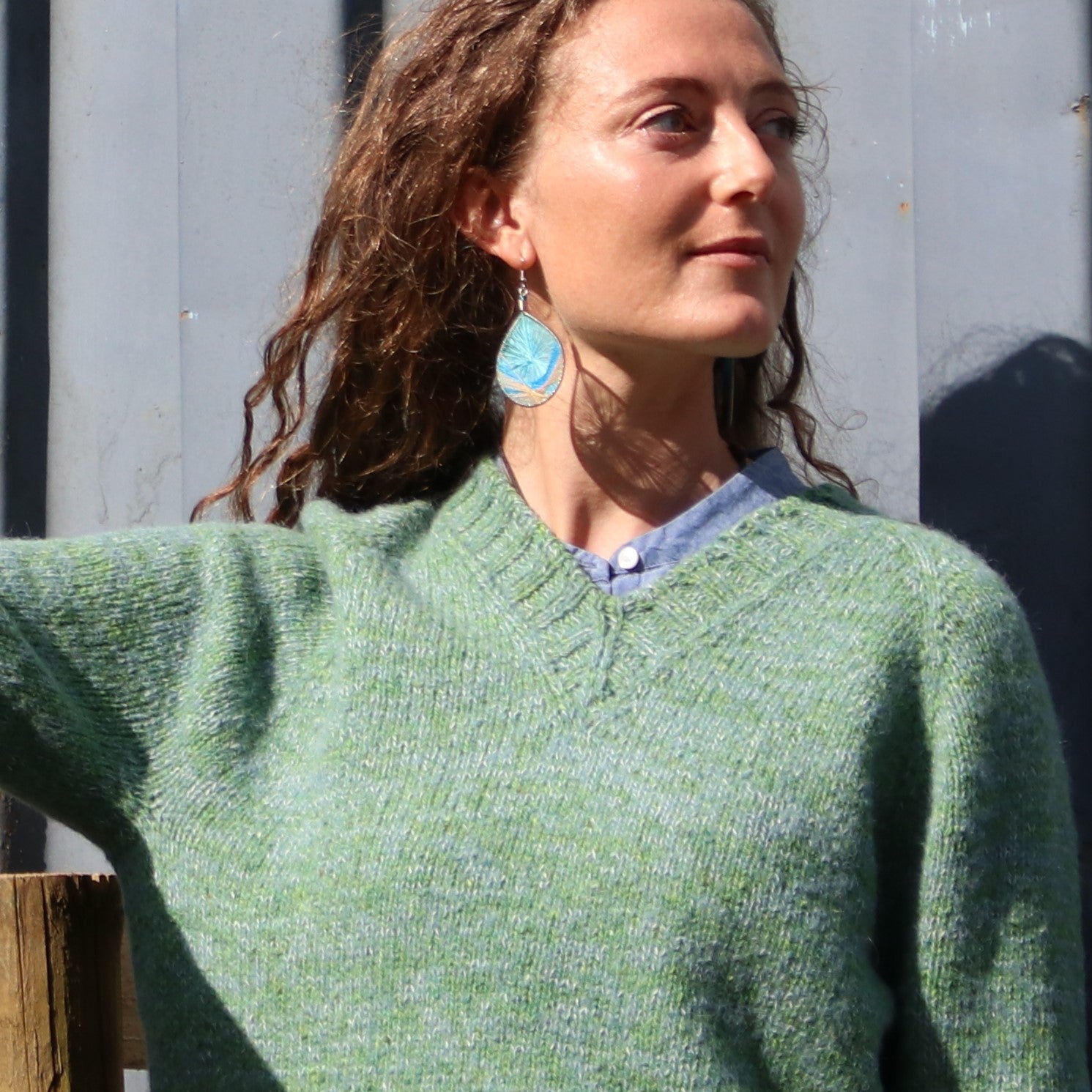 One Sweater V-neck is knit holding two different yarns together. Our green sample is knit with Cirro and Arranmore Light and our orange sample uses Cirro and Meadow together. Each of these yarns has its own unique characteristics, and when combined they create a thicker fabric with the qualities and characteristics of both yarns. The warmth and volume from Arranmore Light knit with the fuzzy softness of Cirro merge to a wonderfully cozy, heathered fabric, whereas Cirro combined with Meadow creates a lighter weight garment with beautiful drape.