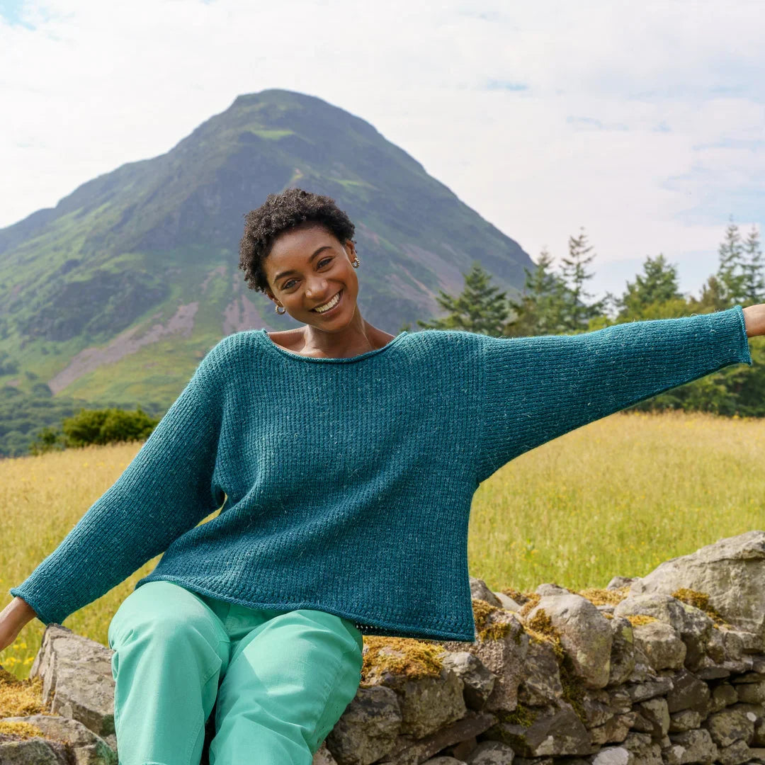 Gear up for the coolest knitting ride of the summer—meet the Recharge Sweater! It's like the comfy van of the knitting highway, all about cruising through stitches with good vibes. Boxy and breezy, with texture, it’s knit to be your go-to garment for road trips or just chillin' at home. The combination of an all-over garter rib stitch, with dropped shoulders, and a casual rolled neckline makes it effortlessly stylish and super comfy.
