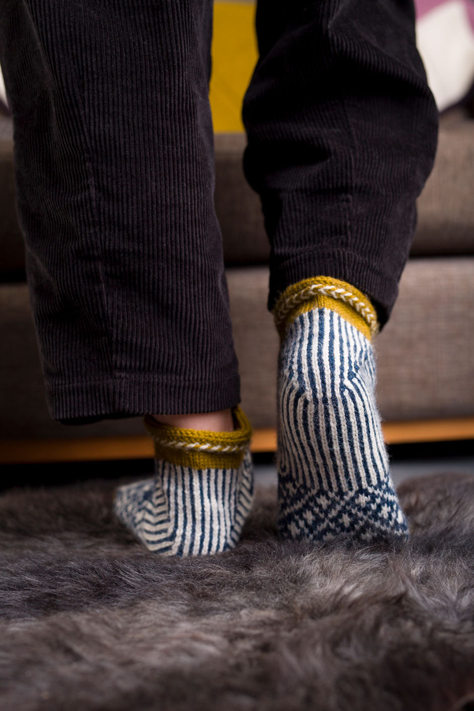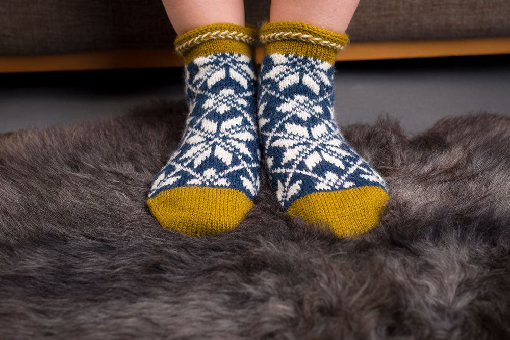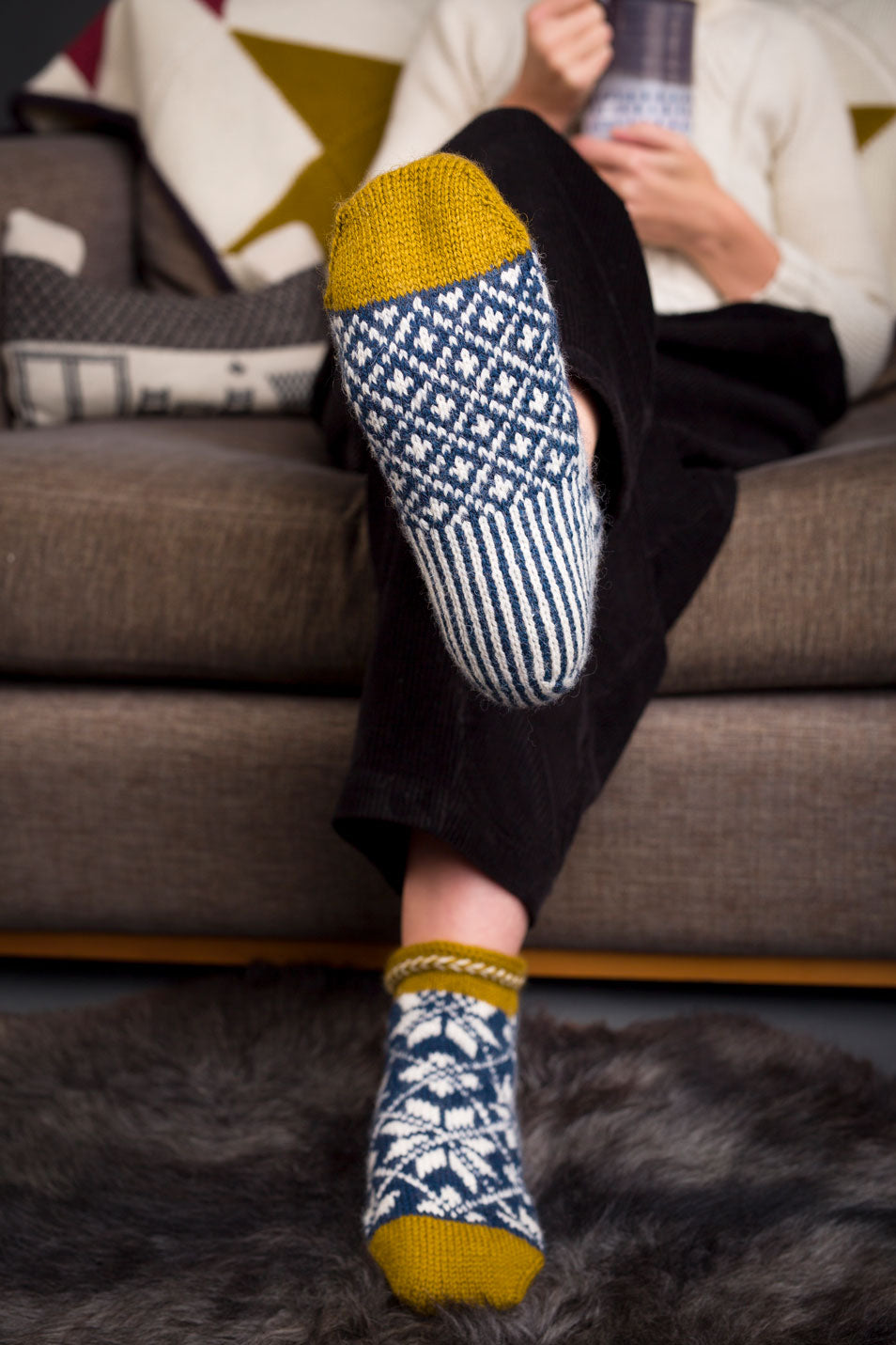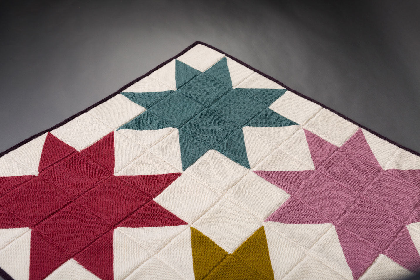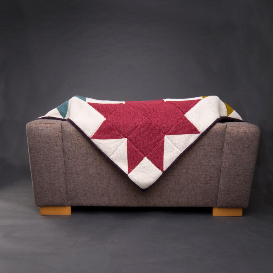 Yet Kate’s hallmark is perhaps her work with colour, and this collection abounds with bold designs of many hues, including yoke sweaters, a cosy hoody, mitts, cowl, hats and slippers, and the graphic Sterrie blanket with its simple, contemporary feel.