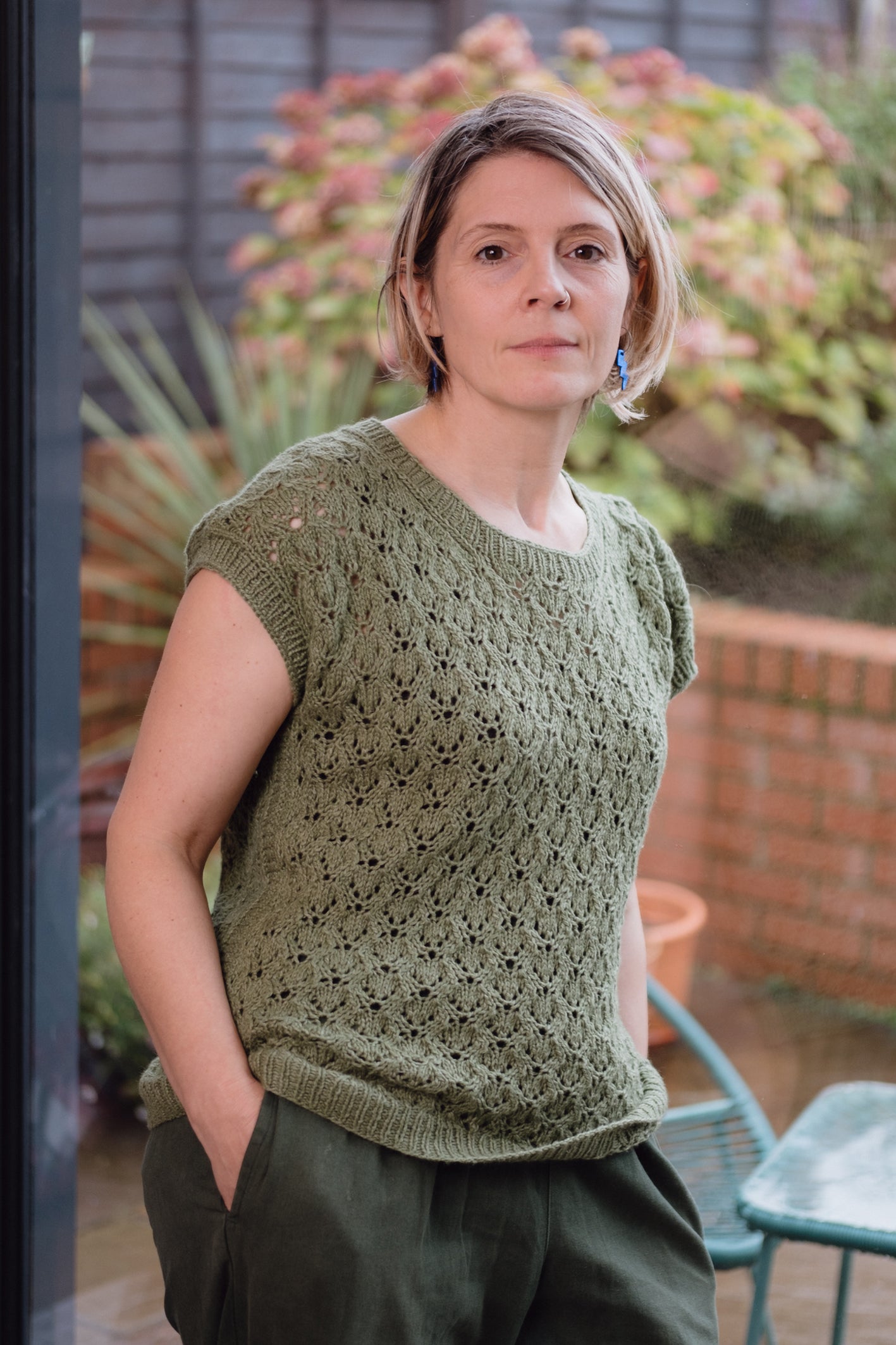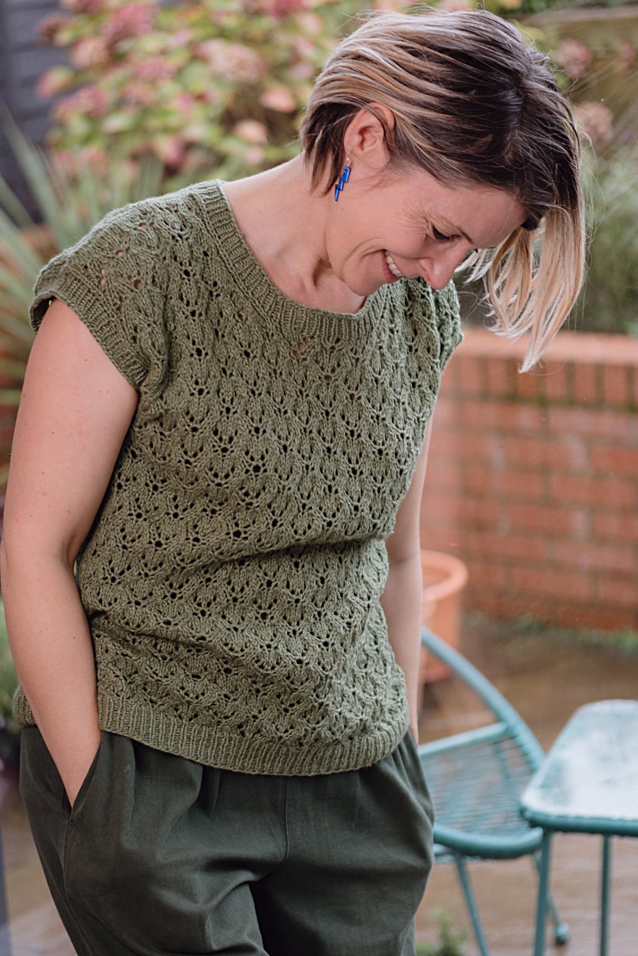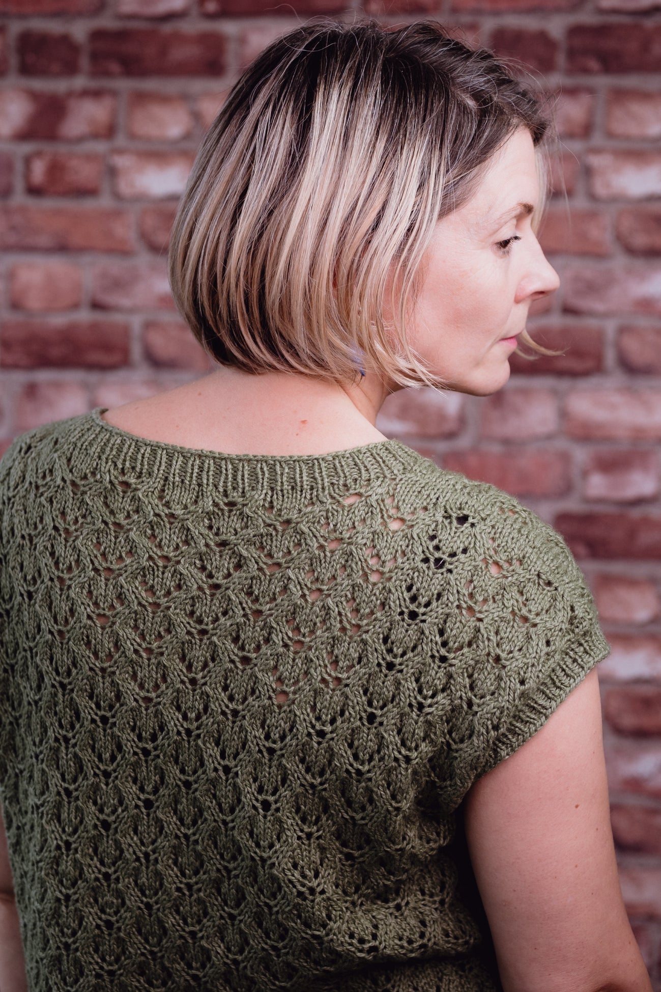 Shaping is worked in the lace pattern on the armholes and the neck. The lace pattern is broken up at the sides by a garter stitch panel. Across the size range the armhole shaping is slightly different in order for the armhole bands to finish in a similar place on all sizes.