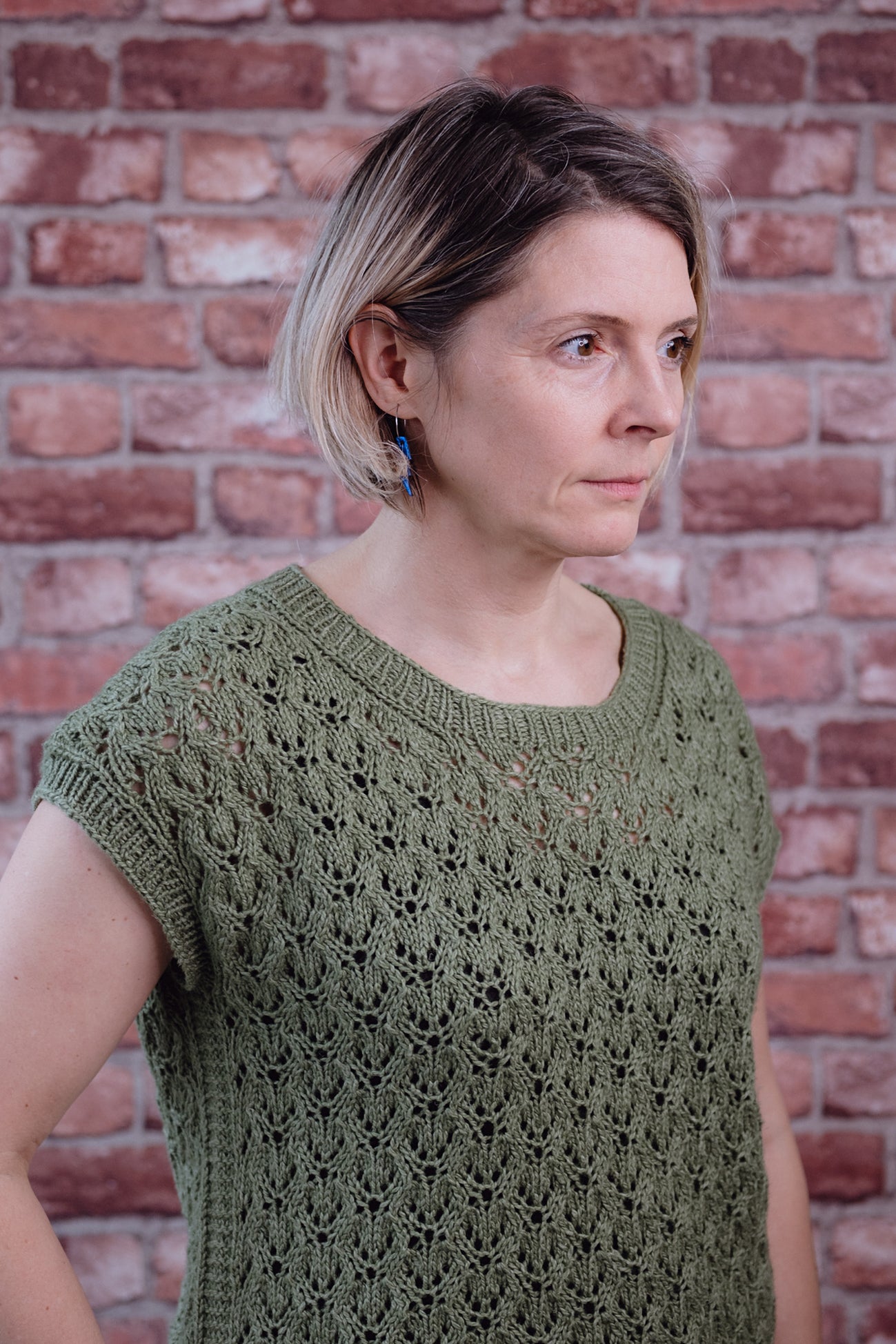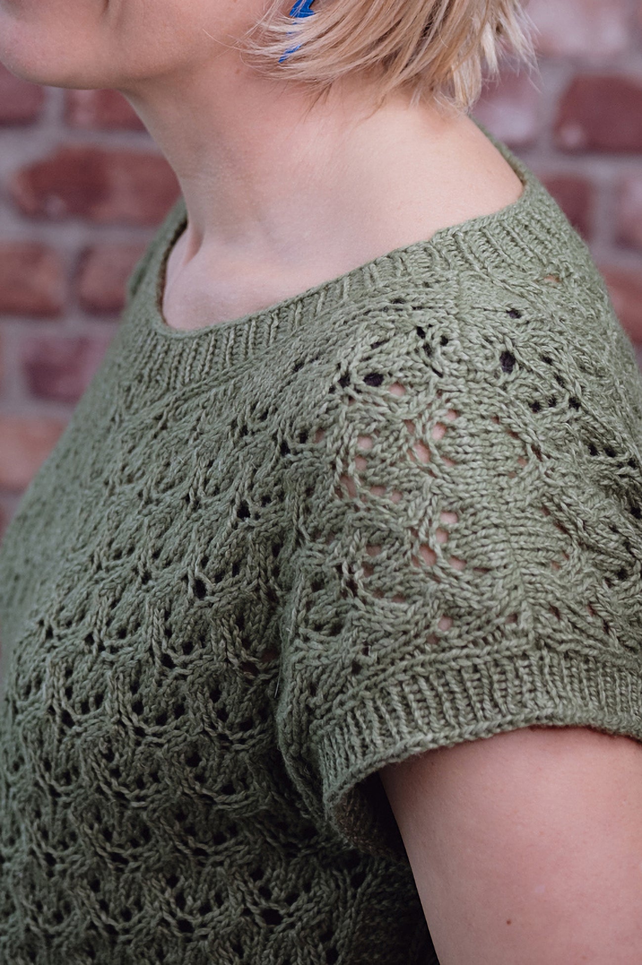 Tenby is a bottom up lace t-shirt with a bust size of 87.5-179cm (24.5-70.5in), designed to be worked with 11-17cm (41/2-7in) of positive ease. The top is worked in the round to the armhole divide, then the piece is worked flat in two halves to the shoulders, which are shaped using short rows and cast off using the three needle bind off. Stitches are then picked up around the neck and armholes and a rib border is worked.
