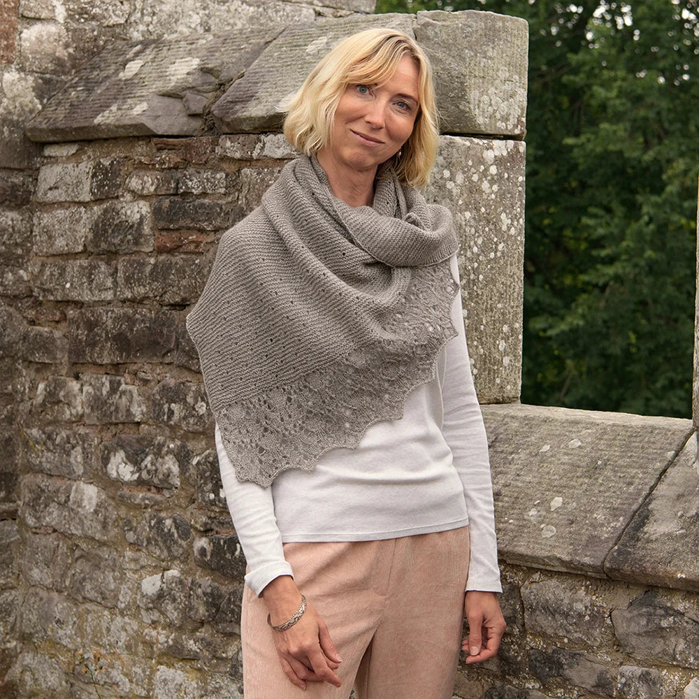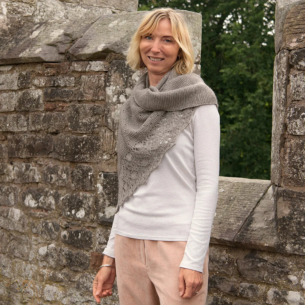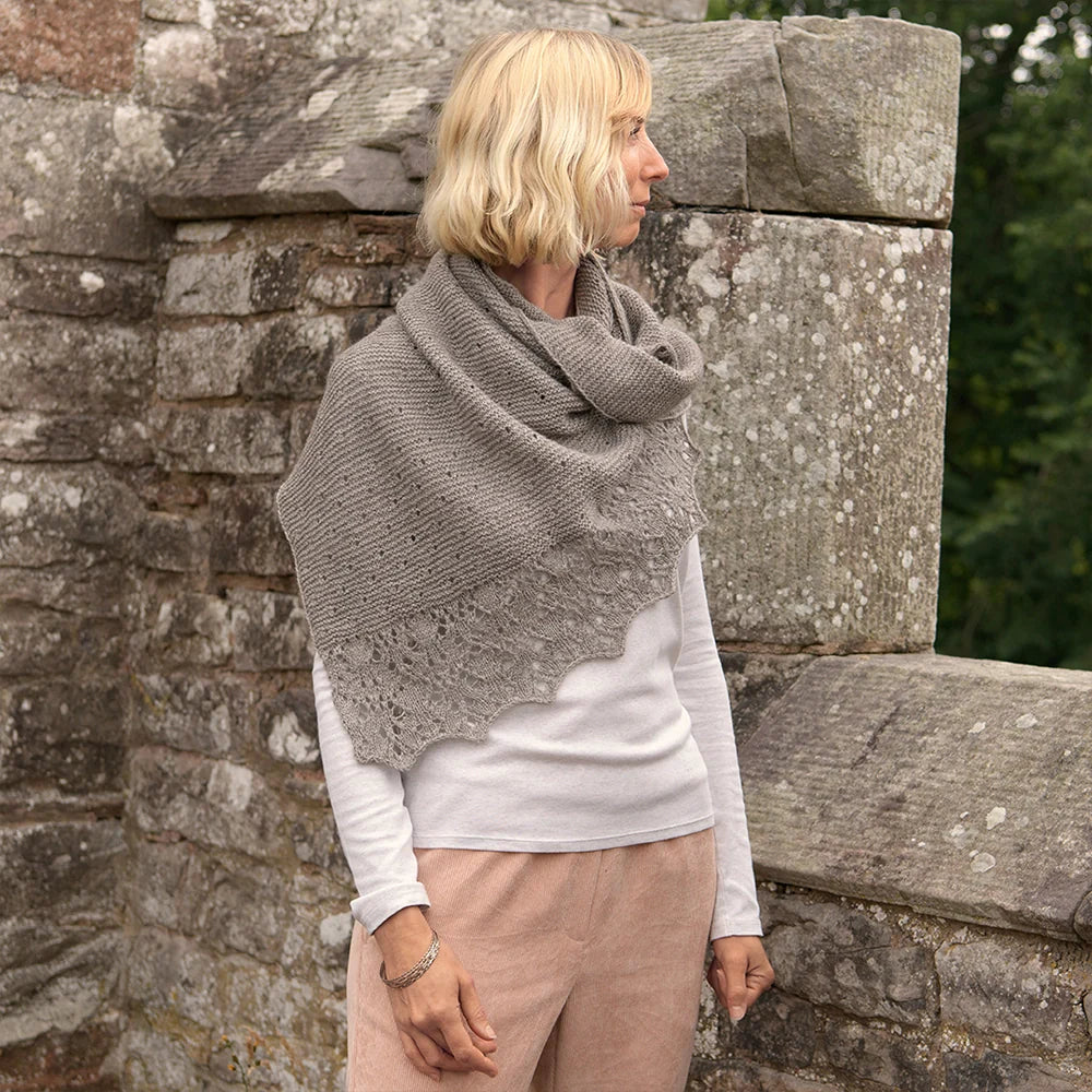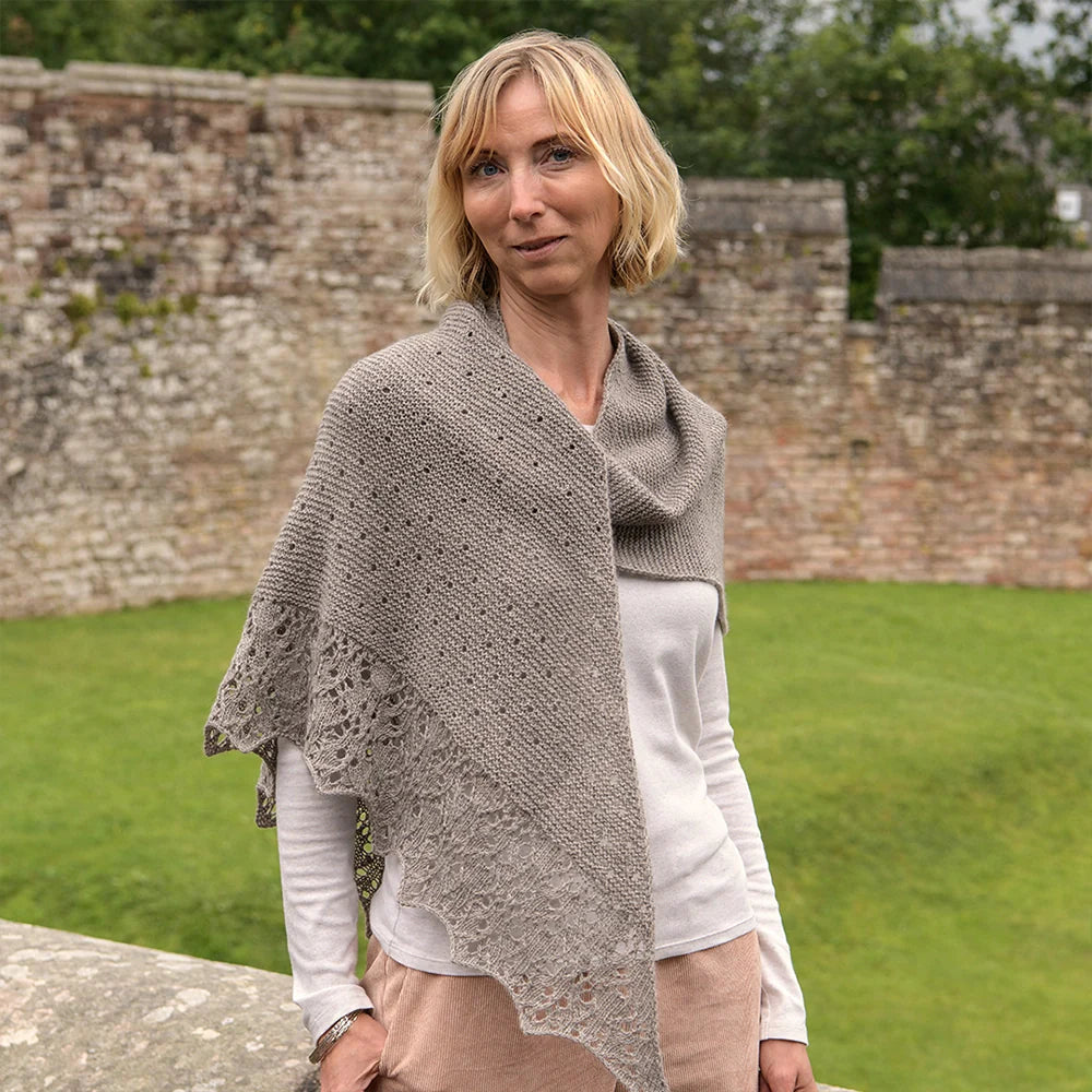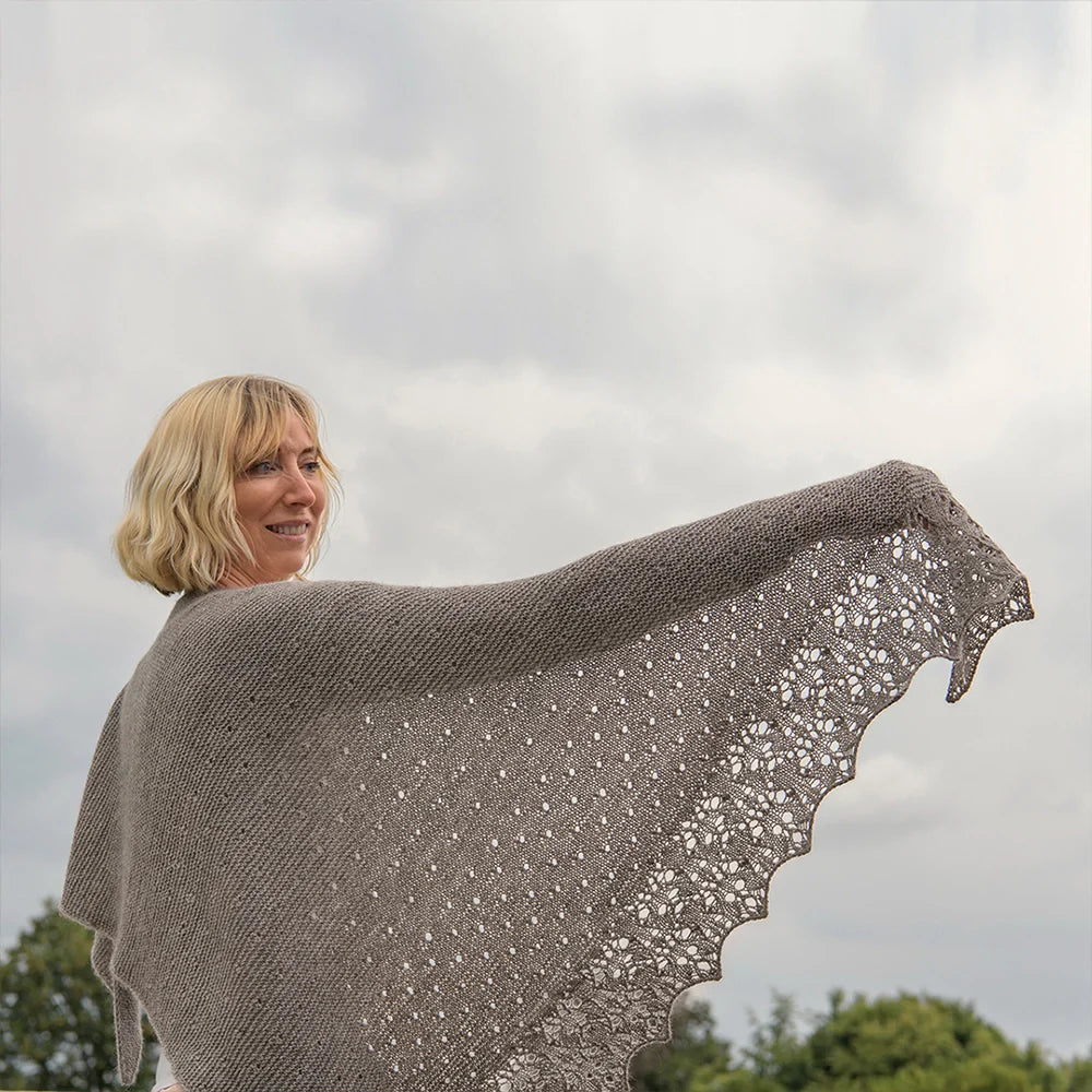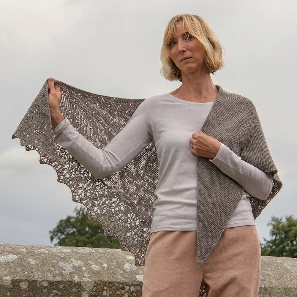 This triangular shawl starts at one corner, increasing the st count every RS row. The first section is worked in simple Garter stitch. The second and third sections feature a series of eyelet motifs. The final section, the edging, is worked in an elegant lace. To create a slightly stretchy edge, a Suspended Cast-Off is recommended.