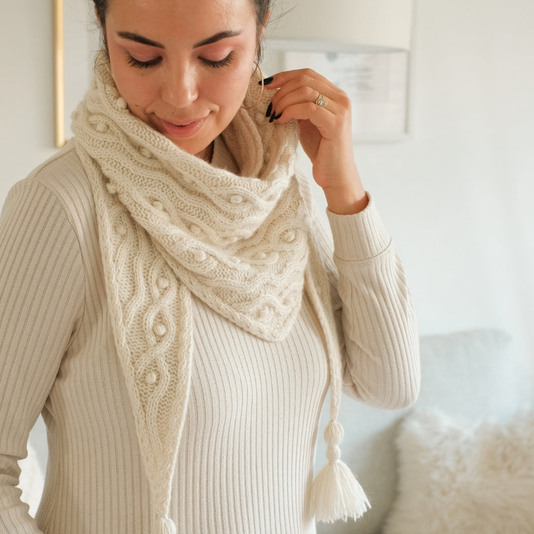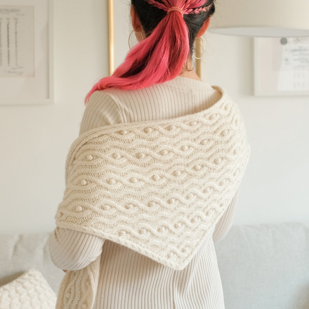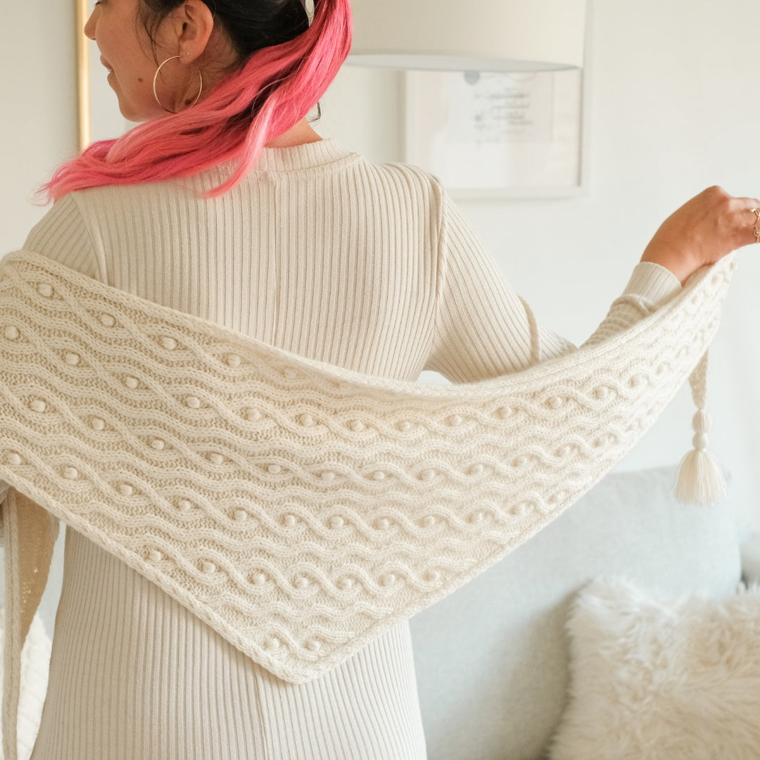 The Bindweed Shawl offers the familiar comfort of a triangular shawl combined with beautiful textures. The fabric is richly decorated with a pattern of intertwined cables and nupps inspired by the dance of gentle bindweed plants. Rhythmic and intuitive, the pattern knits up faster than expected.