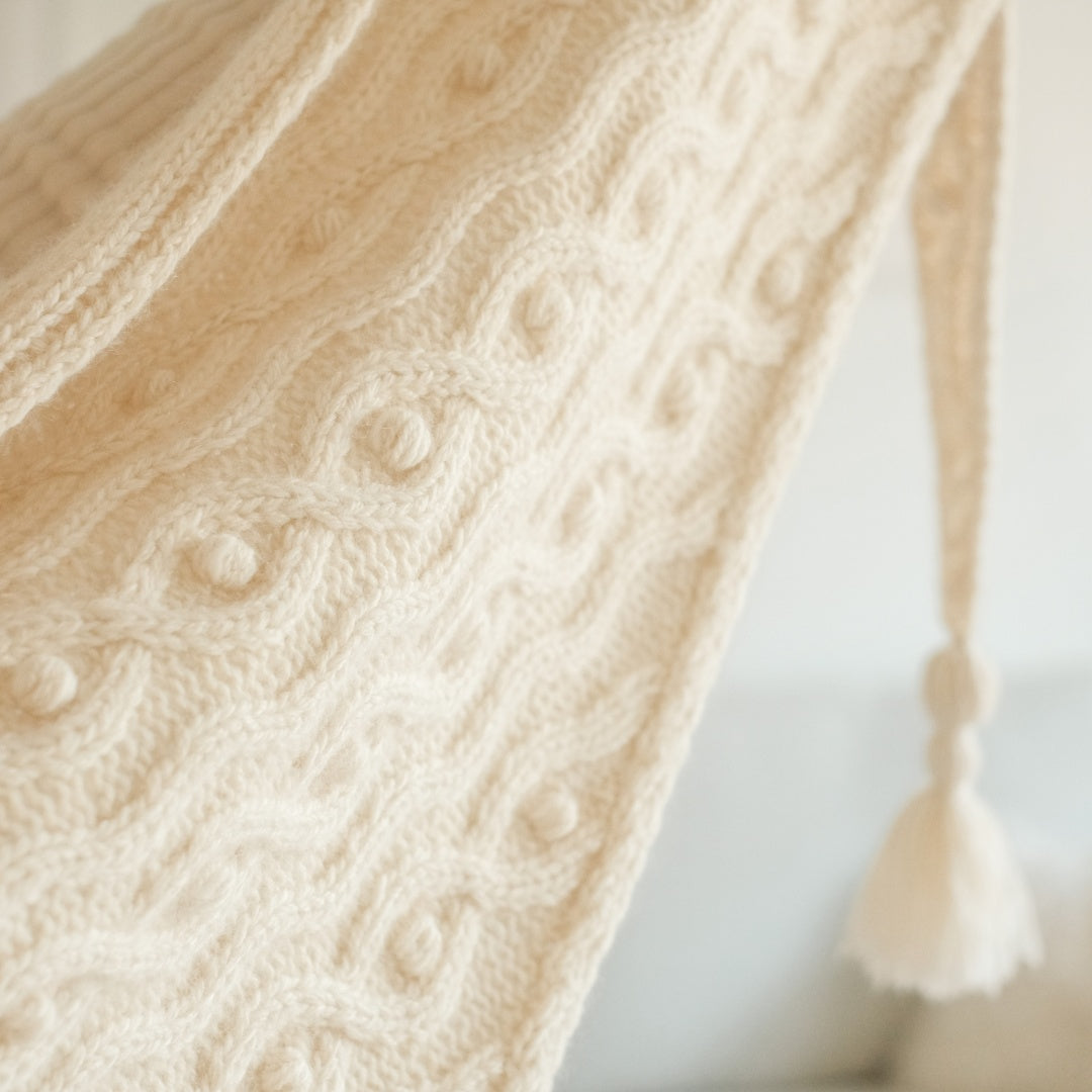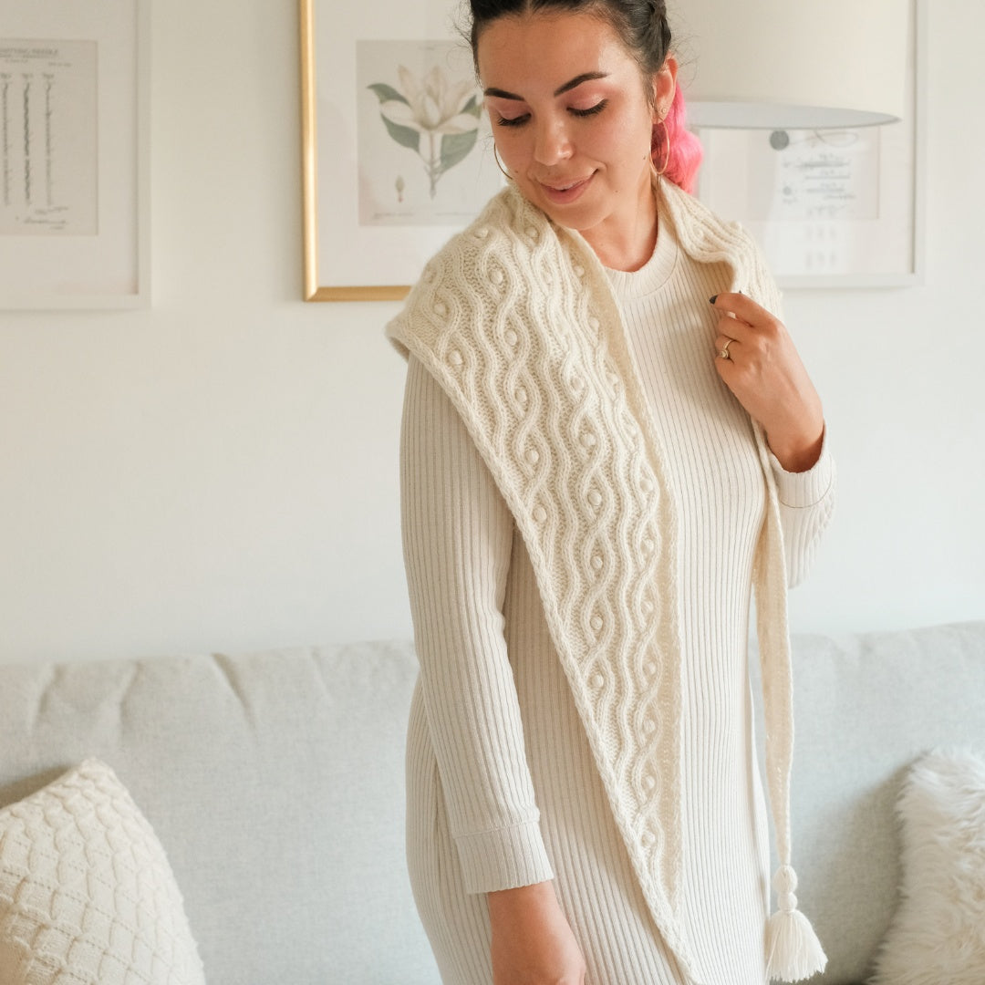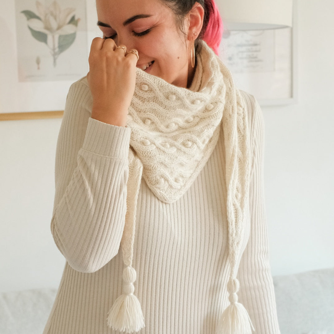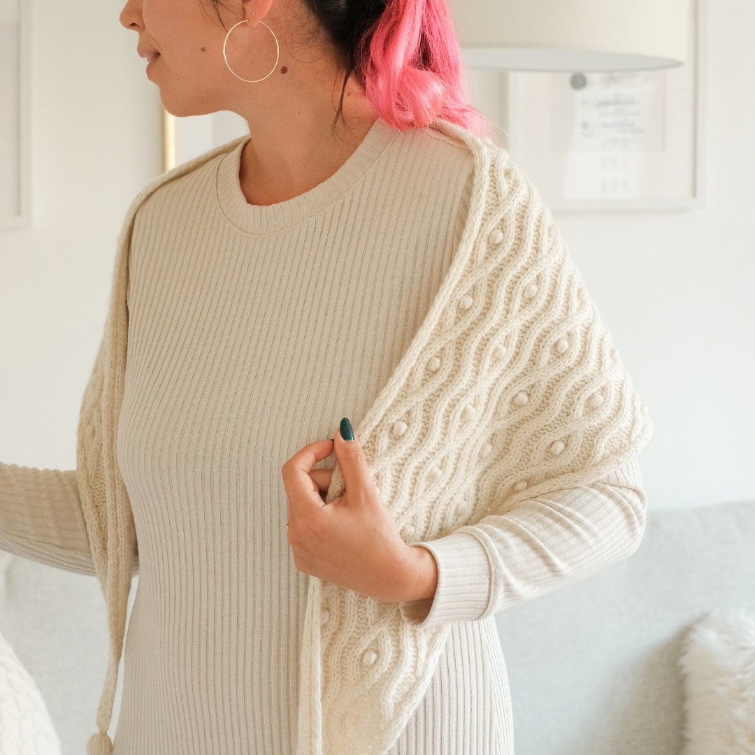 The Bindweed Shawl offers the familiar comfort of a triangular shawl combined with beautiful textures. The fabric is richly decorated with a pattern of intertwined cables and nupps inspired by the dance of gentle bindweed plants. Rhythmic and intuitive, the pattern knits up faster than expected.
