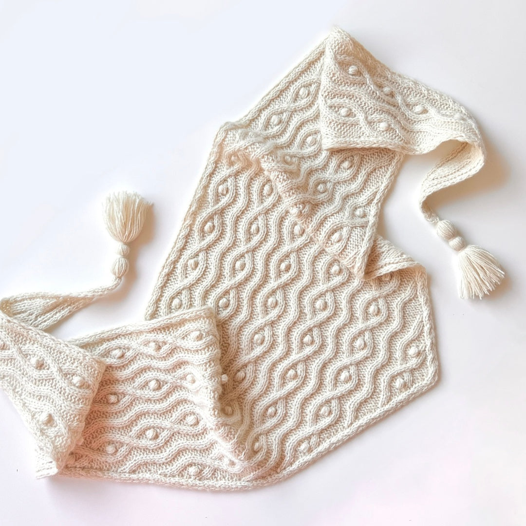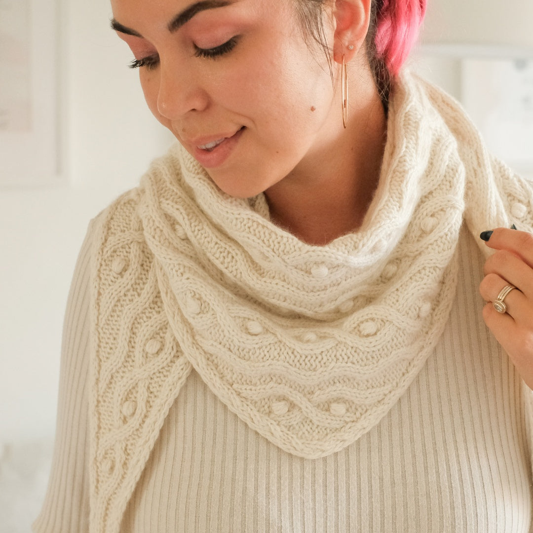 Bindweed Shawl is worked from tip to tip with increases along one edge for the first half of the pattern and mirrored decreases for the second. Stitch patterns include cables, nupps, and delicate faux cables along the edges. The pattern has detailed instructions on making three different shawl sizes. Directions are both charted and written out. Videos for nupps and cabling without a cable needle are provided.