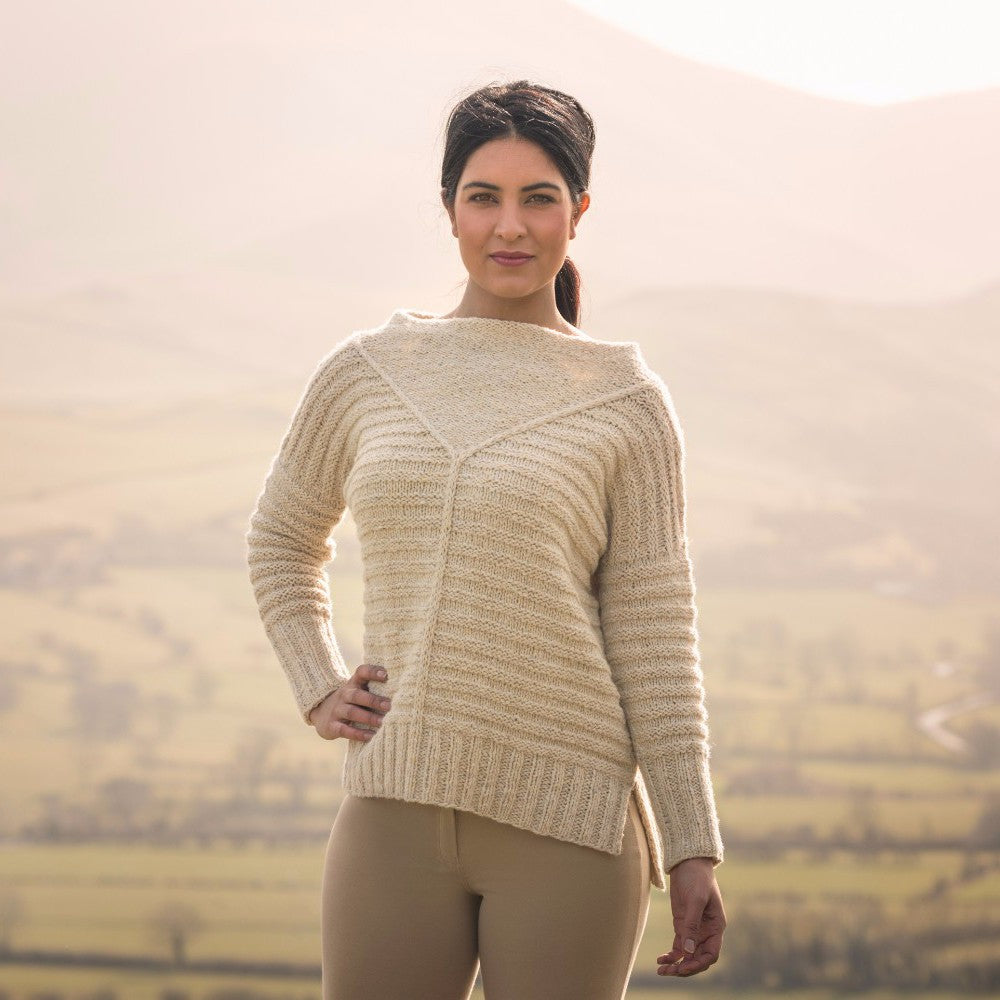 This striking sweater combines vertical and horizontal ribbing with a bold panel of reverse stocking stitch to shape the neckline. The body is worked in pieces and the shoulders are joined, the sleeves are then worked flat from the top down. The collar is worked in the round and the body and sleeves are then seamed to complete the garment.
