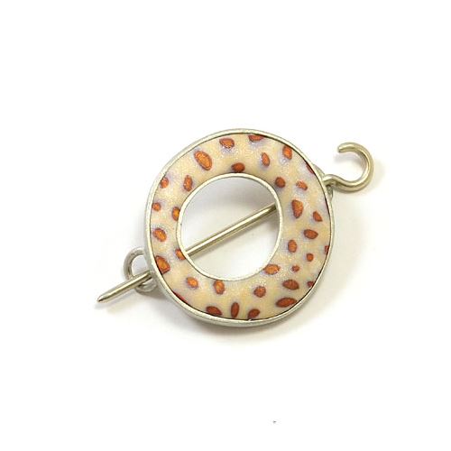 These stunning shawl pins are designed and handmade using inlays of polymer clay in white bronze and lead-free pewter settings. They are the perfect accessory to complement your handknits and put a little zing in your wardrobe. How to wear your shawl pin: Slip the hook through one loop, through your garment layers, then out and through the second loop. Push the hook til it locks into the first loop and the pin will hold securely. The finer the fabric, the more you should gather in the pin. The hook is made with a soft, ballpoint end to slip through fabrics without snagging or splitting fibres. Approx 4cm diameter, with a 7cm stick.
