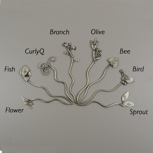 These stunning shawl pins are designed and handmade using white bronze and lead-free pewter. They are the perfect accessory to complement your handknits and put a little zing in your wardrobe. How to wear your shawl pin: Slip the hook through one loop, through your garment layers, then out and through the second loop. Push the hook til it locks into the first loop and the pin will hold securely. The finer the fabric, the more you should gather in the pin. The hook is made with a soft, ballpoint end to slip through fabrics without snagging or splitting fibres. The wavy piece is approx 6.5cm x .75cm, with a 9cm stick. {Image:Image 1|200}