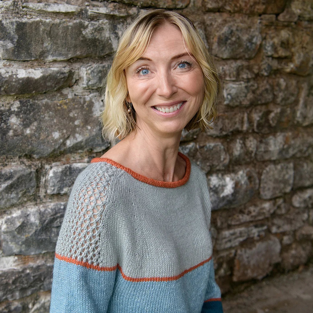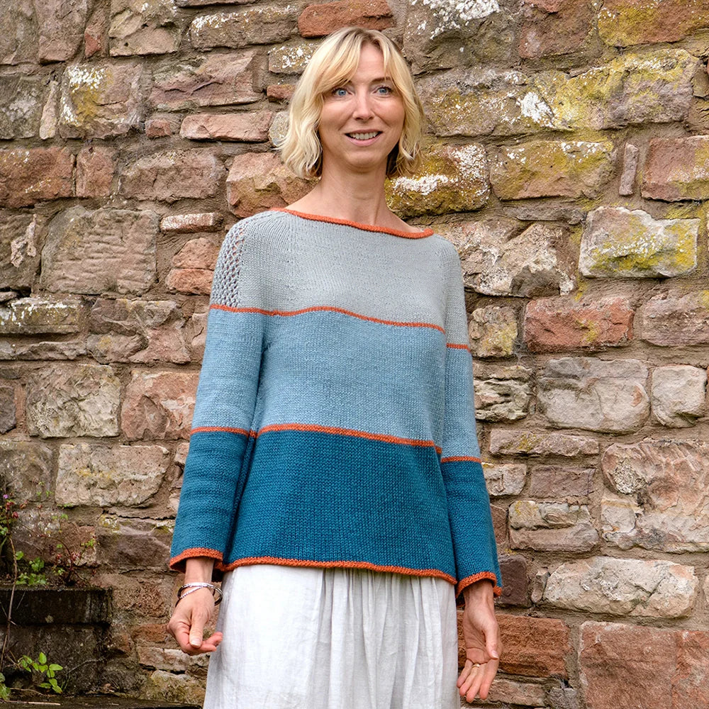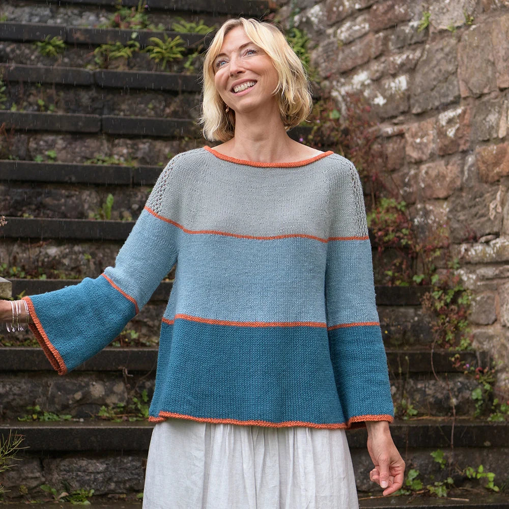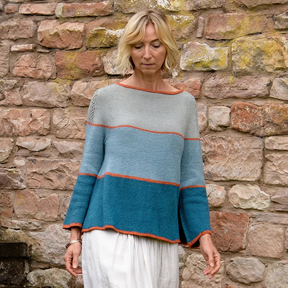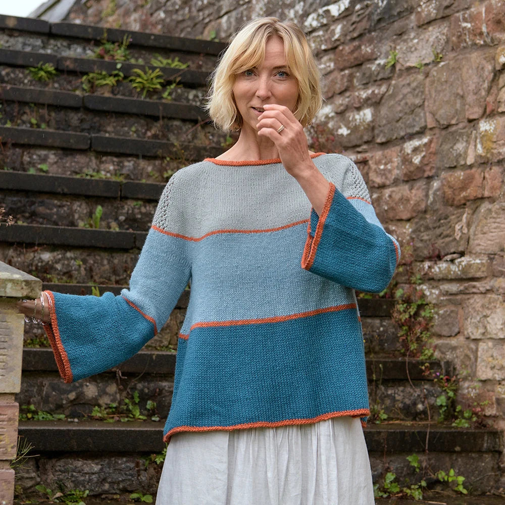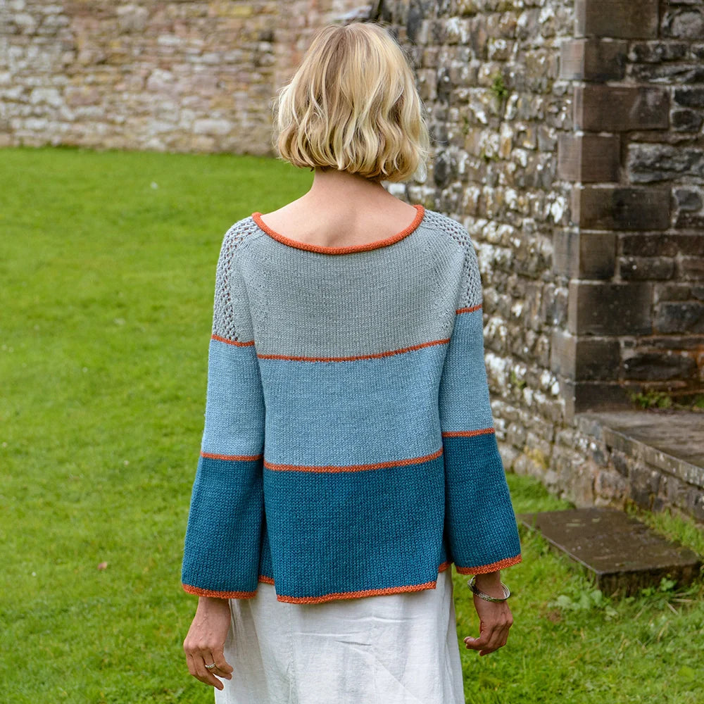 Cassini Sweater is a flattering A-line yoke sweater worked in four shades of Luma. Striking thin lines define the neck, sleeve and hem edges, and mark each block of color. The sleeves are knit flat and seamed with shoulders that have beautiful lace detailing. Luma’s unusual blend of organic cotton, linen, silk, and fine Merino, has an extensive palette of delicious shades which will make a colorful addition to your handmade wardrobe.