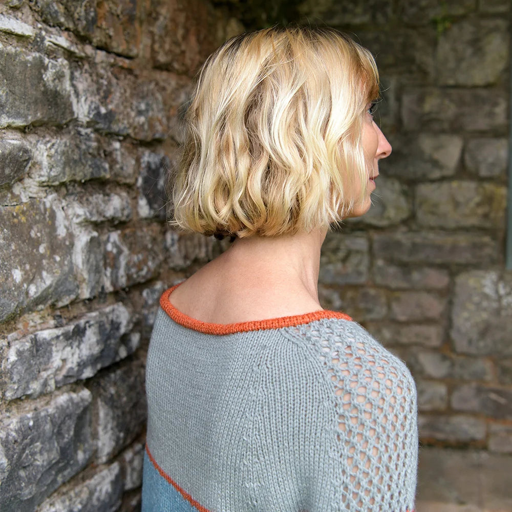This yoked sweater is knitted bottom up, seamlessly in the round to the underarm where the work is then divided for back and front and put on hold. Sleeves are then worked flat to the underarm and are joined with front and back to work yoke seamlessly in the round. After joining front, back and sleeves, the eyelet pattern panels are set at each arm and worked throughout the yoke. The neckline trimming is picked up last, folded over and sewn to the inside around the neck.