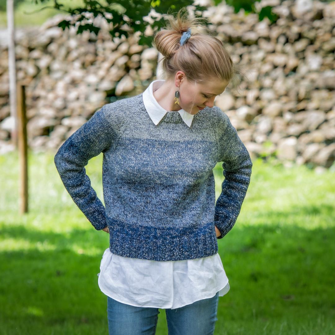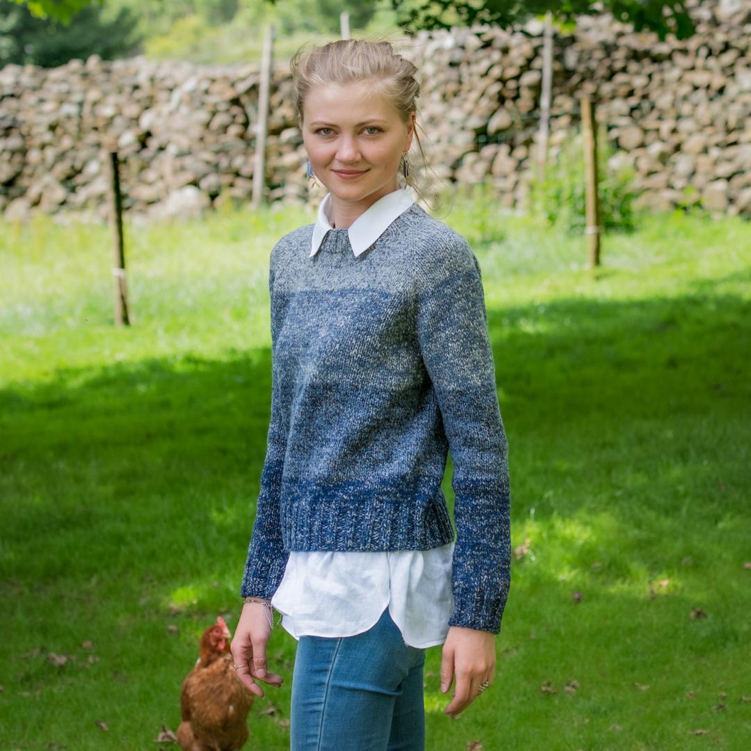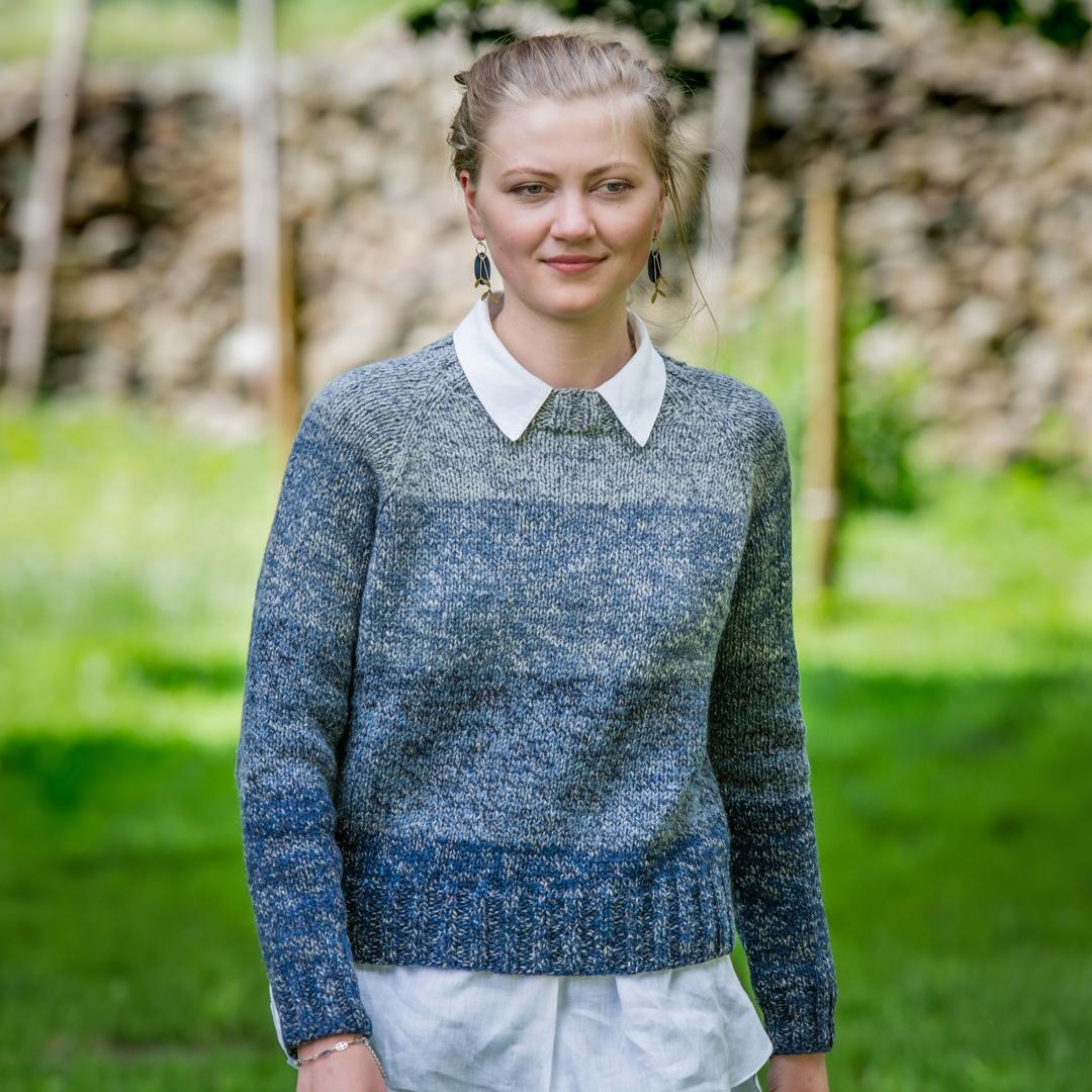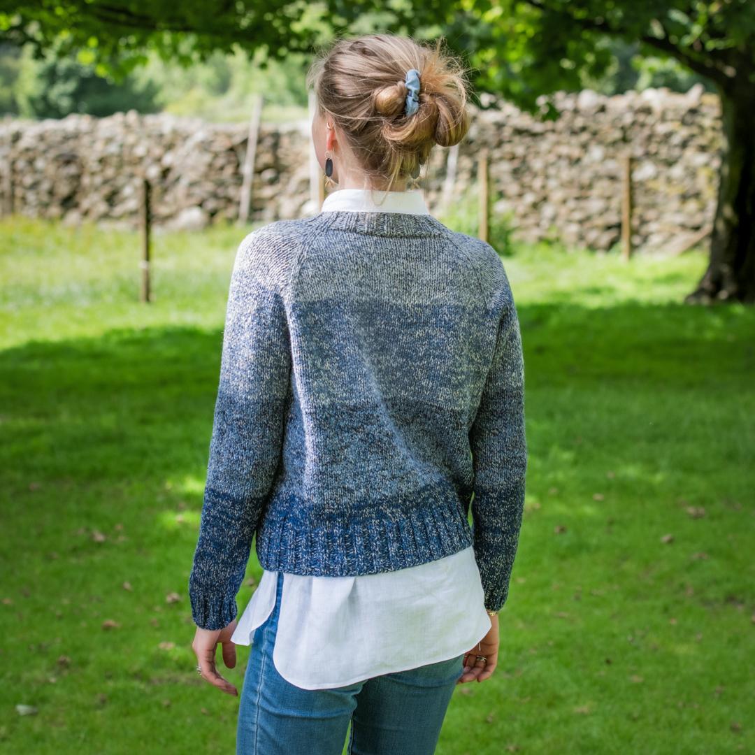 The Fibre Co. team were inspired to create this design to explore the many options for color gradient that are possible when holding two strands of Arranmore Light together. The Ceim Sweater is a gratifyingly quick knit and feature marled stripes on a classic raglan sweater.