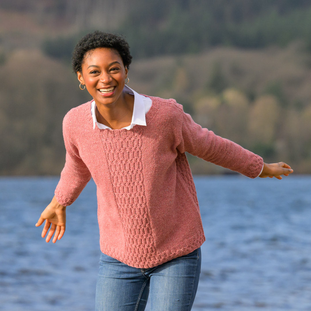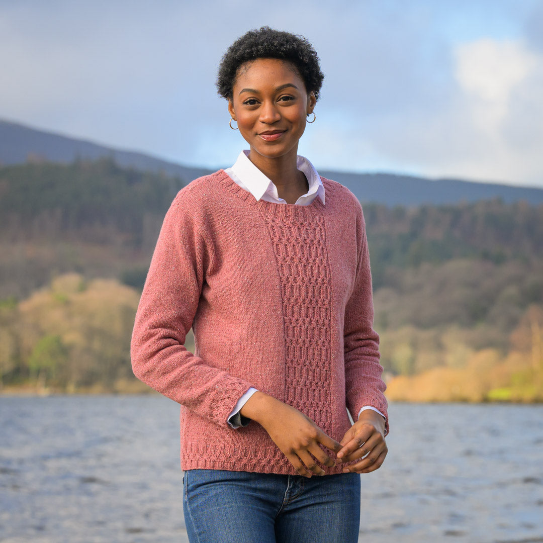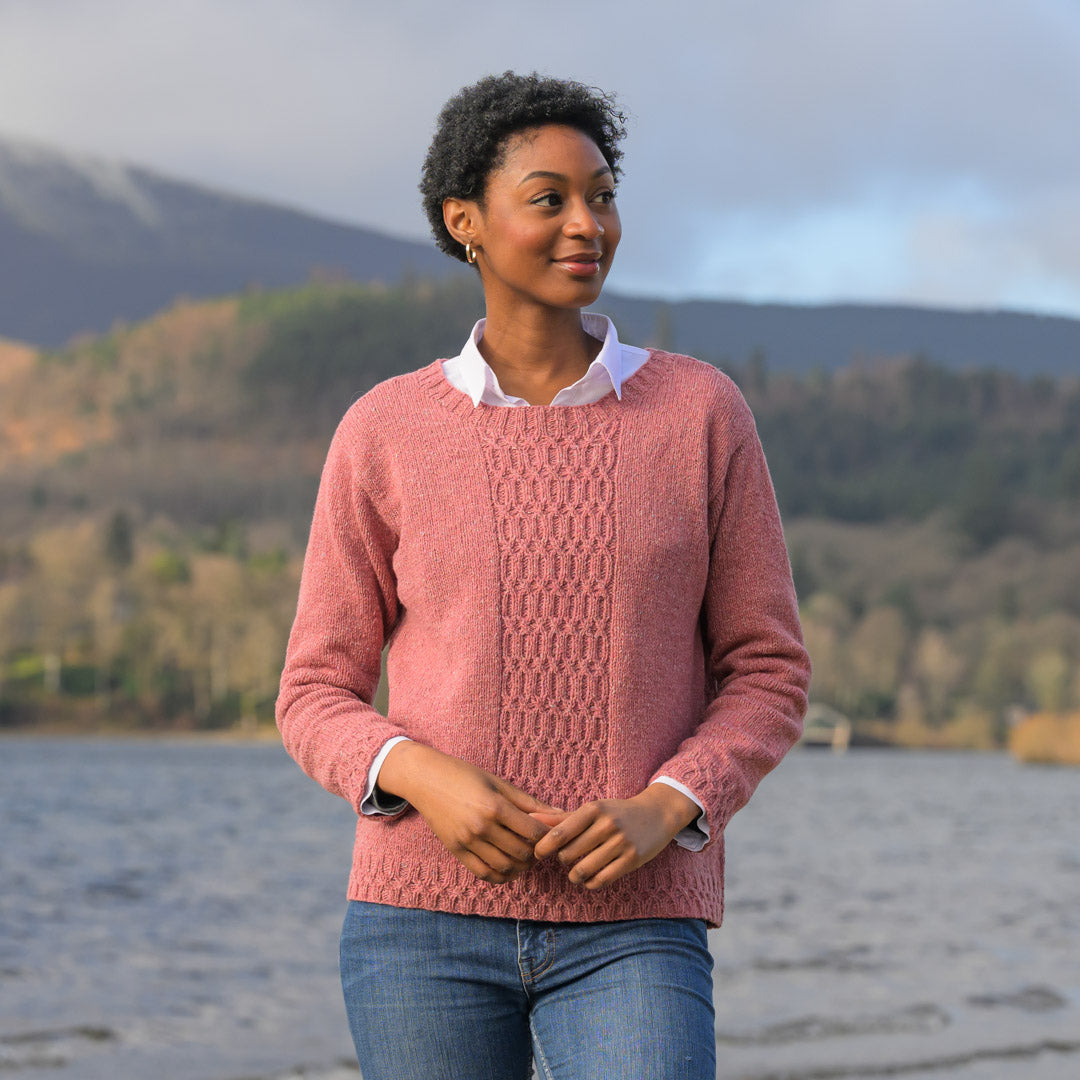 Arranmore Light brings a luxurious feel to this pullover, with a tweedy blend of cashmere, silk, and Merino that offers beautiful drape and softness. The front and back are knit flat from the bottom up and then seamed before picking up stitches for the sleeves. The pattern also includes an option to knit the neckband seamed or seamlessly. Choose your favorite color, and get your needles ready for a rhythmic and relaxing knit with just enough variety to keep things interesting.