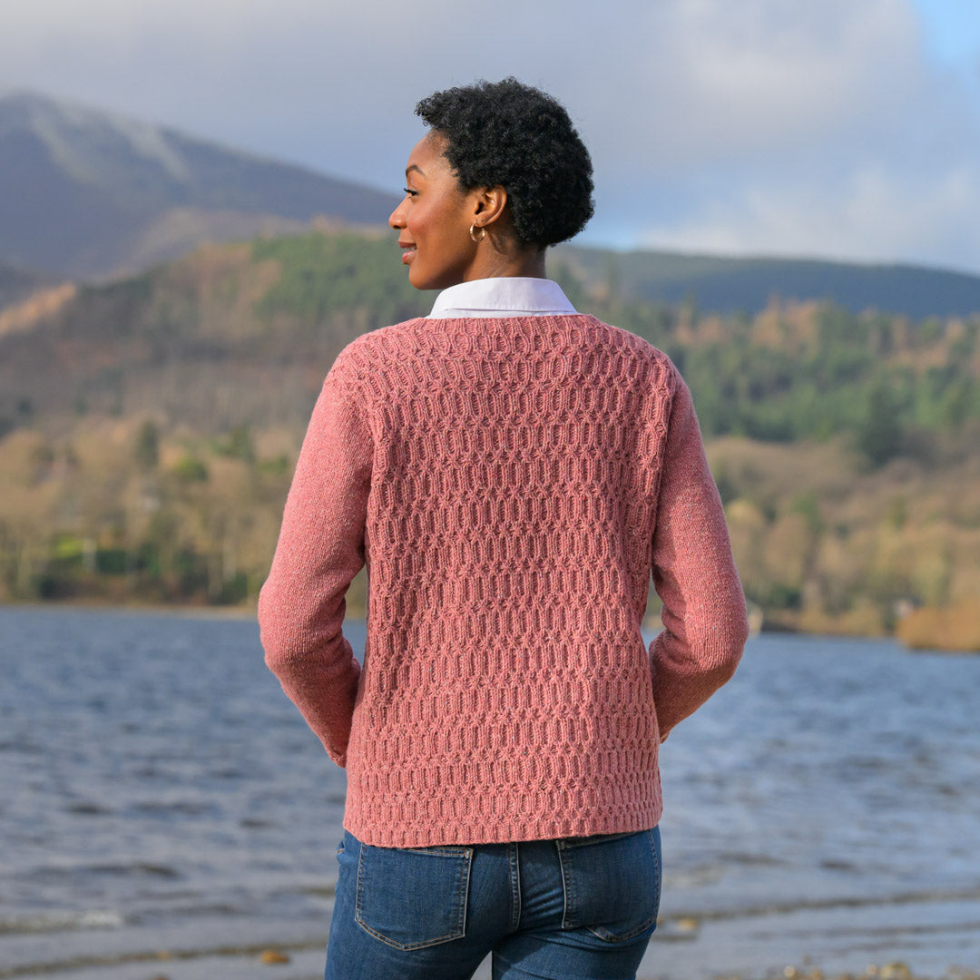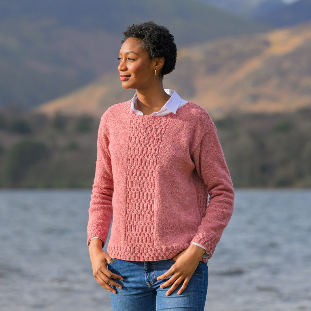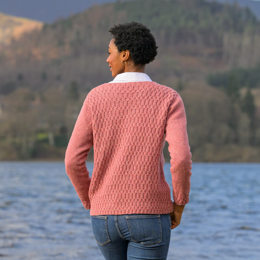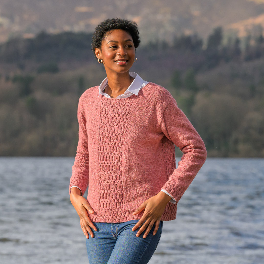 Arranmore Light brings a luxurious feel to this pullover, with a tweedy blend of cashmere, silk, and Merino that offers beautiful drape and softness. The front and back are knit flat from the bottom up and then seamed before picking up stitches for the sleeves. The pattern also includes an option to knit the neckband seamed or seamlessly. Choose your favorite color, and get your needles ready for a rhythmic and relaxing knit with just enough variety to keep things interesting.