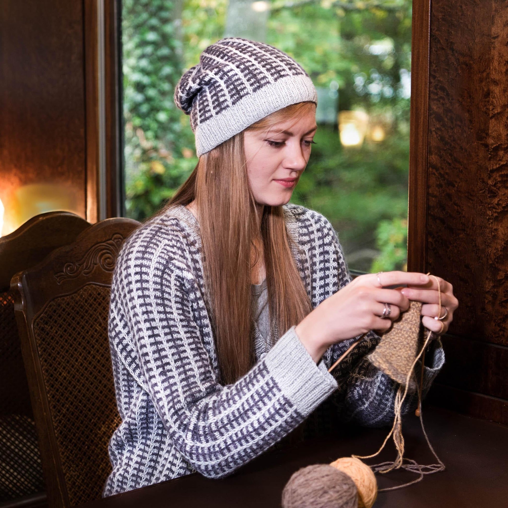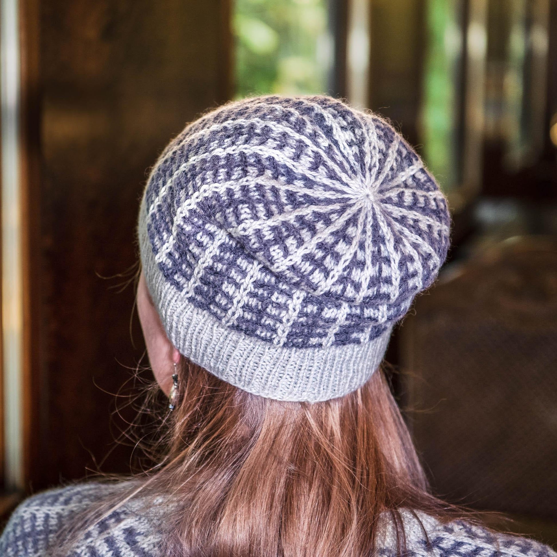 The hat is knitted in the round from the bottom to the top. The 2-color textured pattern is achieved by slipping stitches.