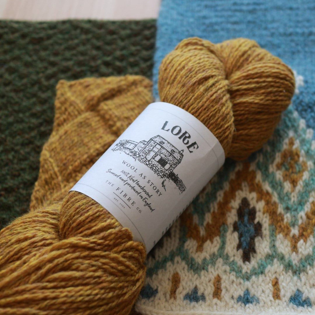 The Fibre Co. Lore Minis (100% lambswool from the English Romney sheep breed, 62 m (68 yd) per 25 g mini) in shades Stable (A) – 3 minis and Happiness (B) – 2 minis.