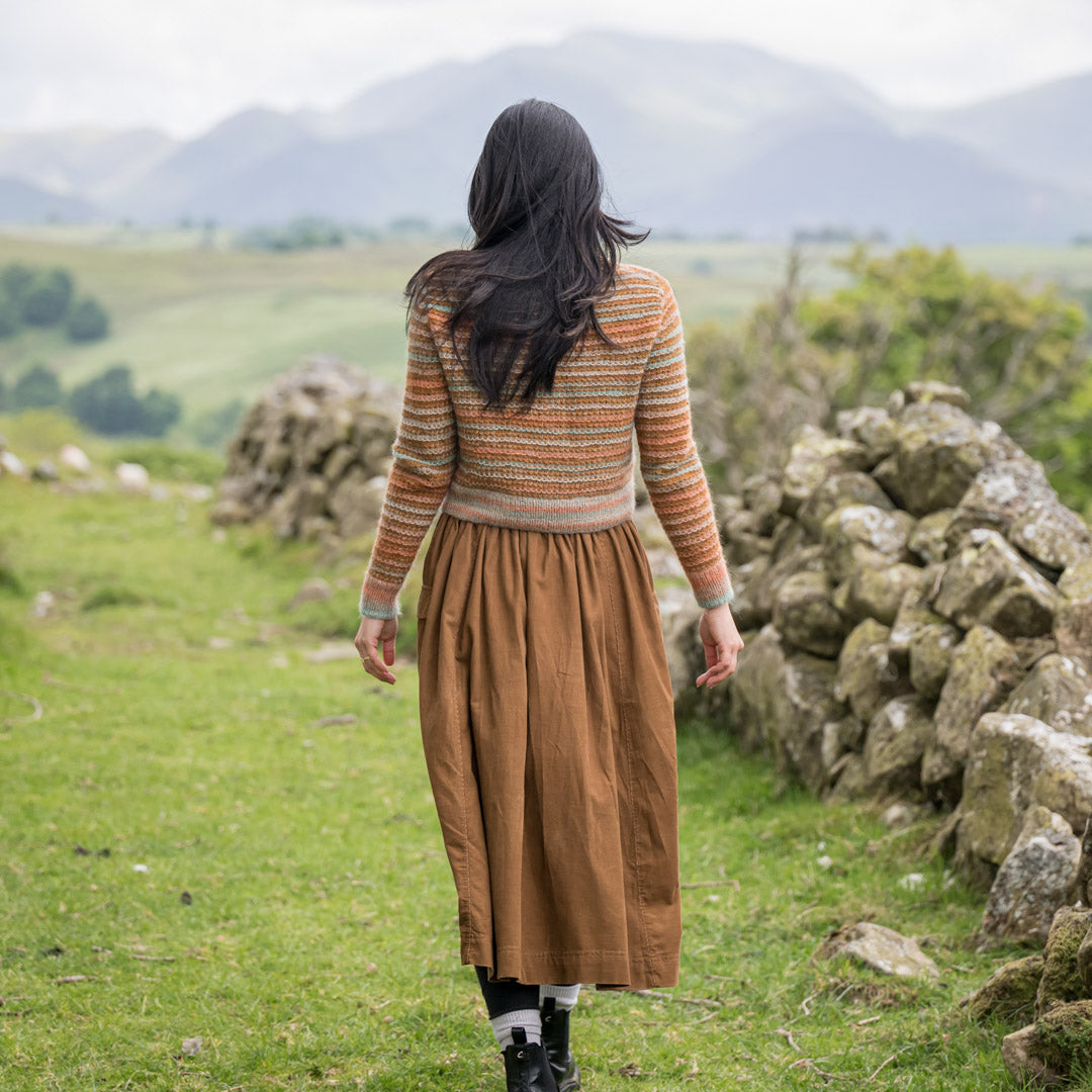 Crafted in The Fibre Co.'s Transitions, this 50/50 blend of alpaca and Peruvian Highland wool delivers exceptional softness with reliable structure. The alpaca's smooth surface creates luminescence that enhances color depth, while the Highland wool provides essential shape retention and resilience. As you knit, watch the gentle color gradations unfold across simple stitches, creating dynamic fabric without the complexity of yarn switching. This sweater embodies the beauty of constant, gentle change—perfect for capturing autumn's shifting palette in a piece you'll treasure for seasons to come.